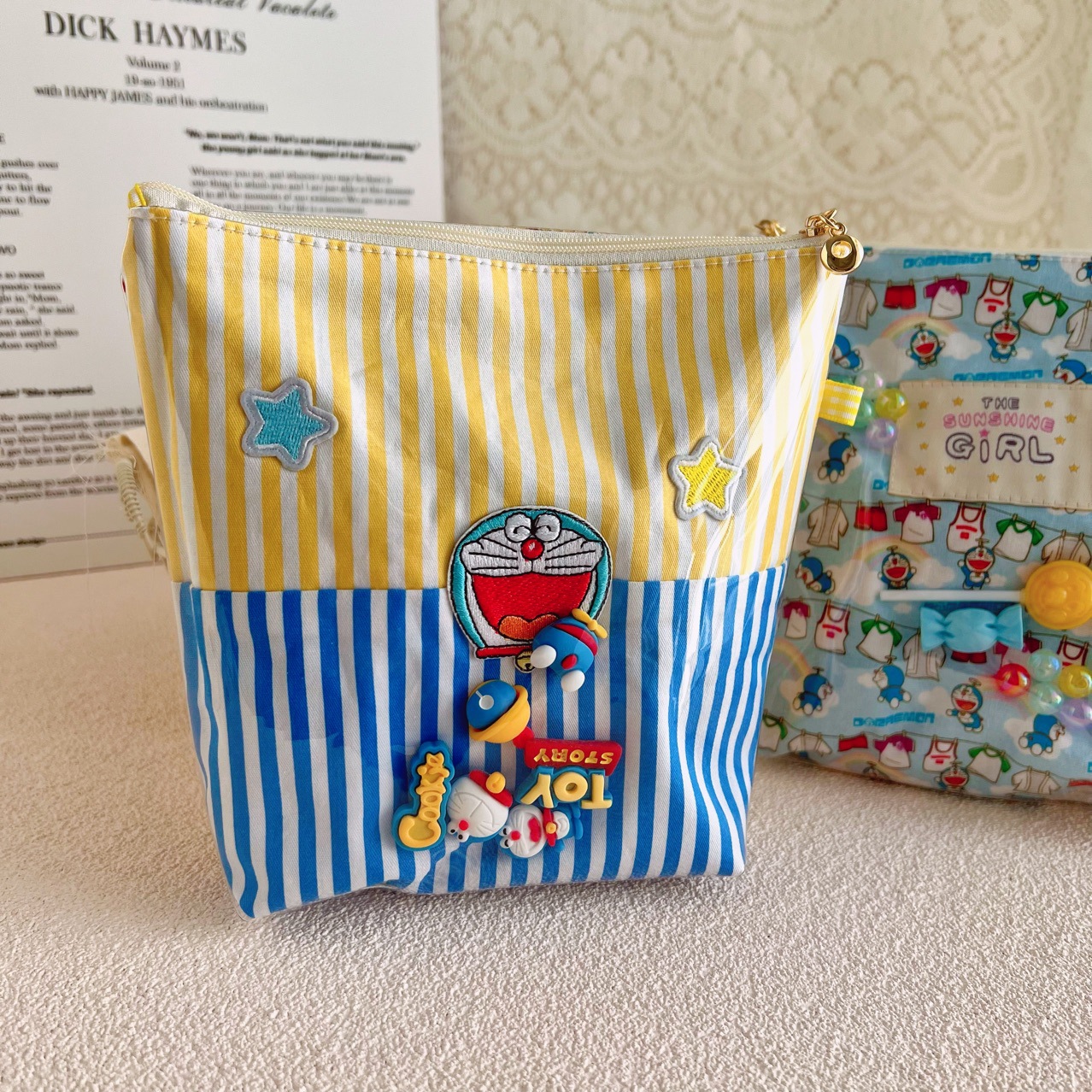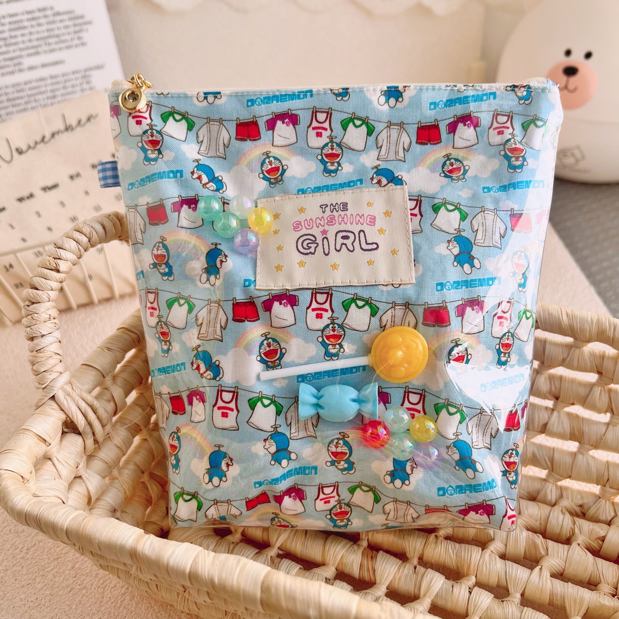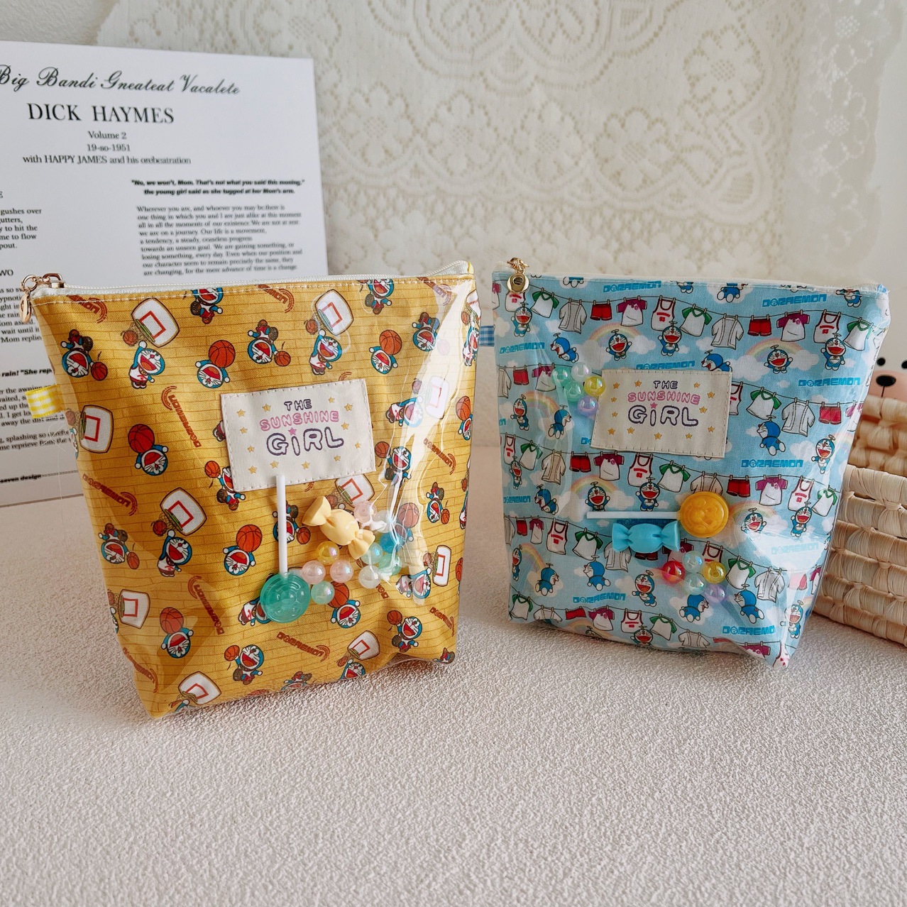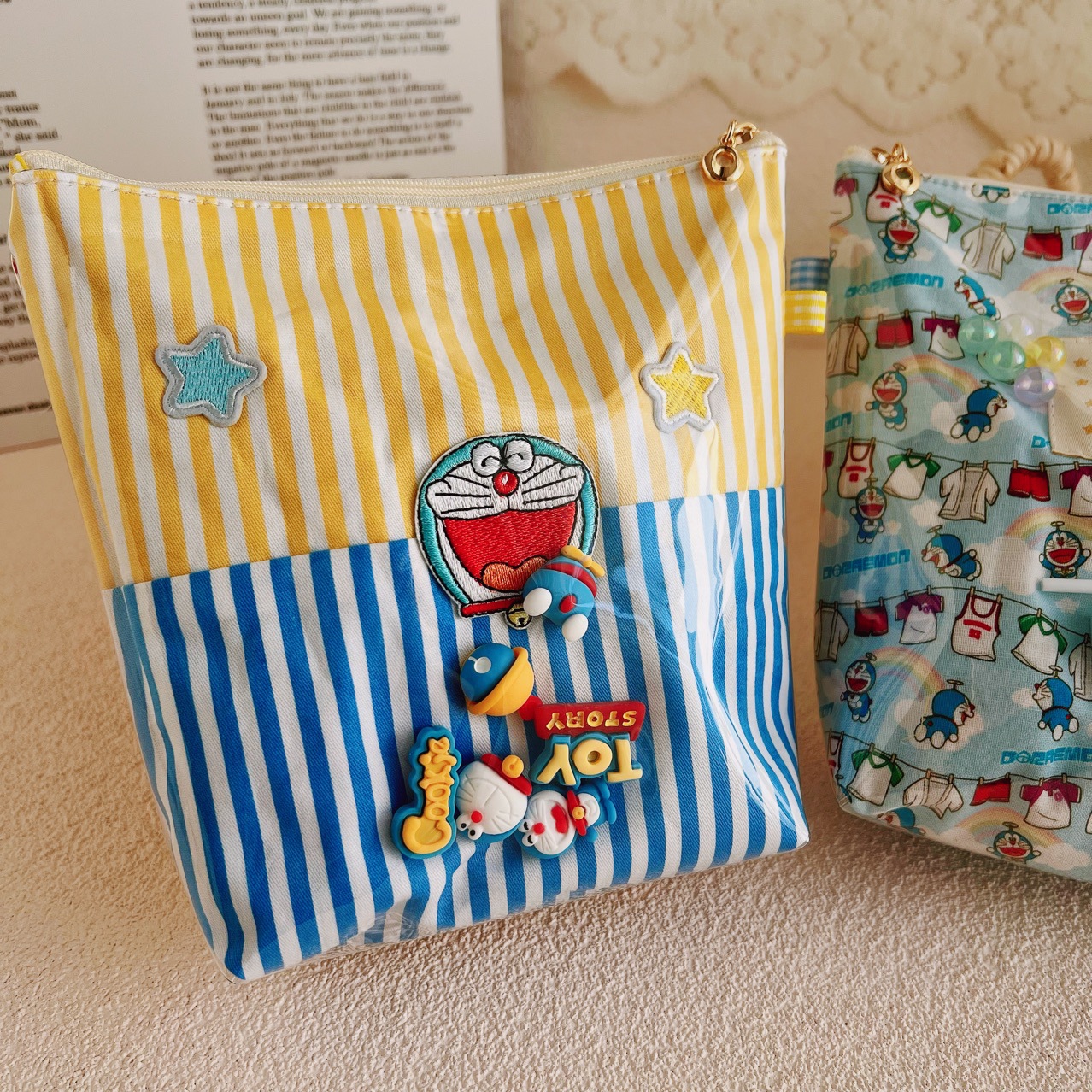 刺绣丁当猫化妆包透明流沙卡通收纳包条纹布艺包透明食玩包批发