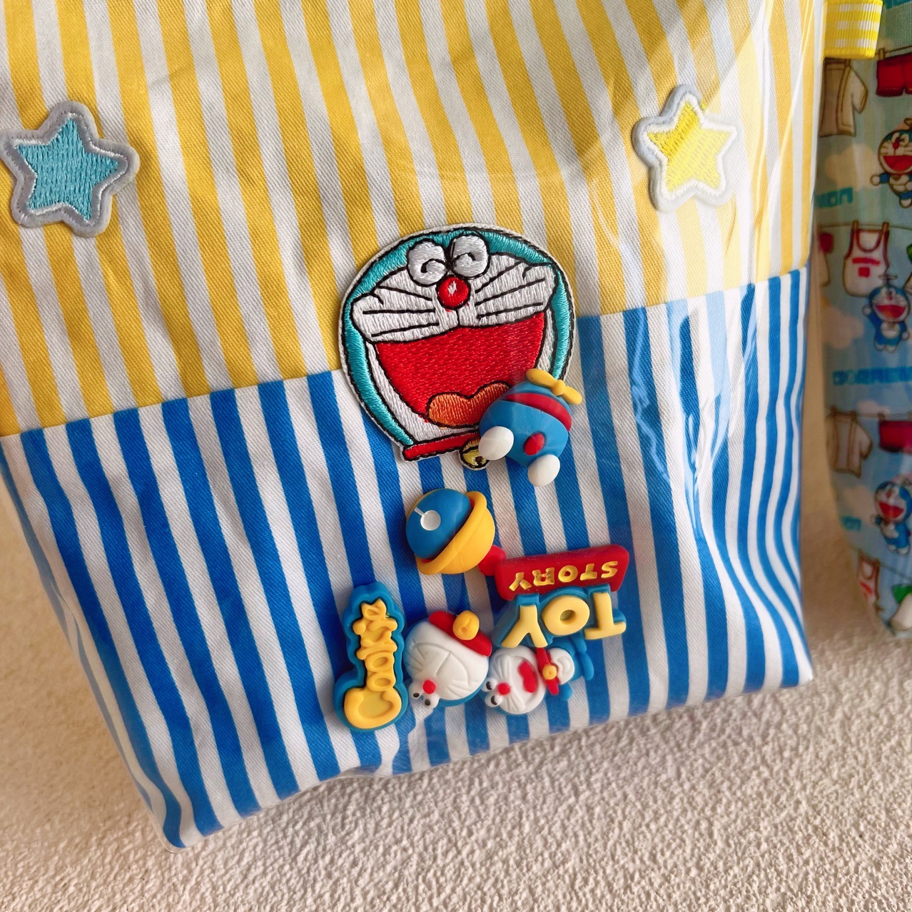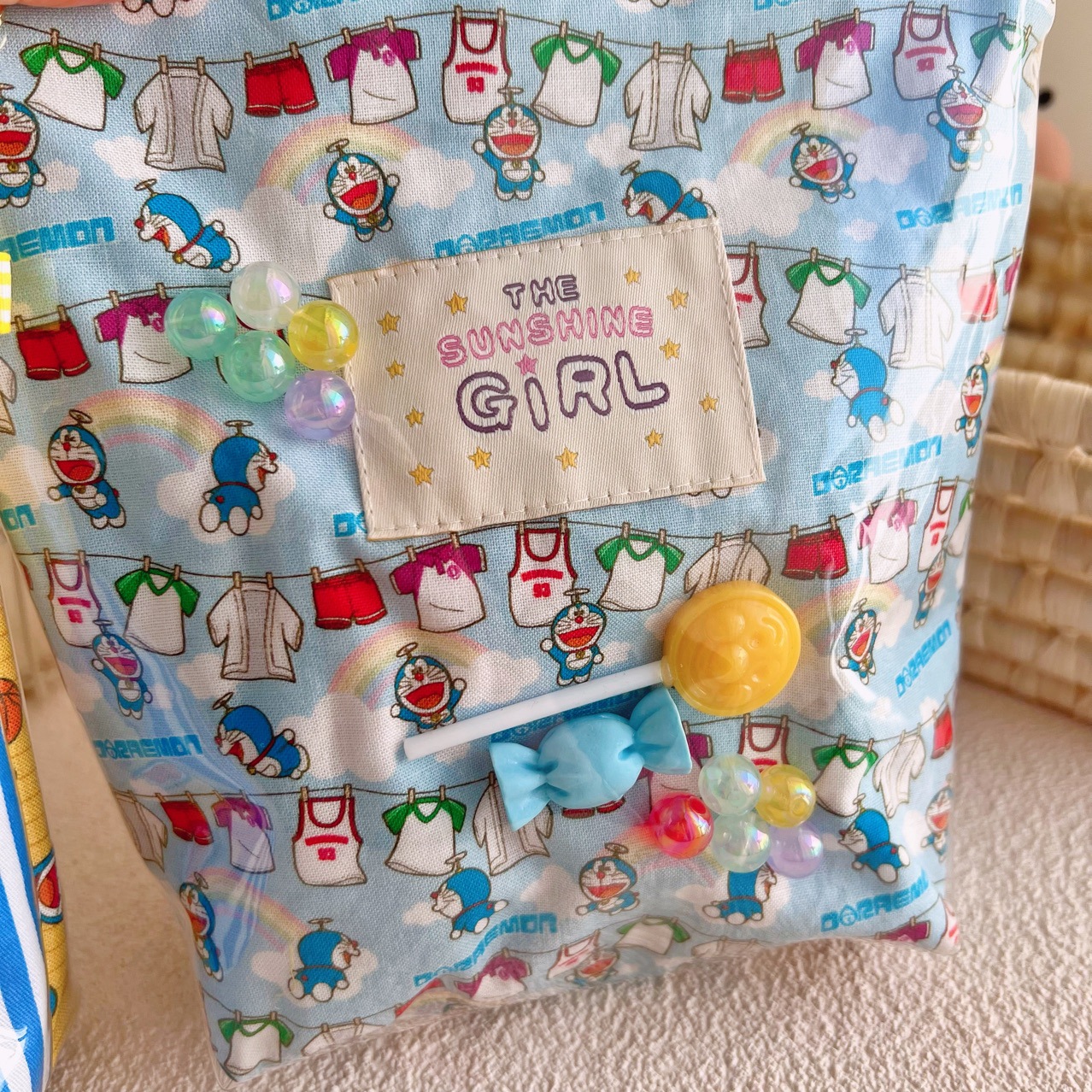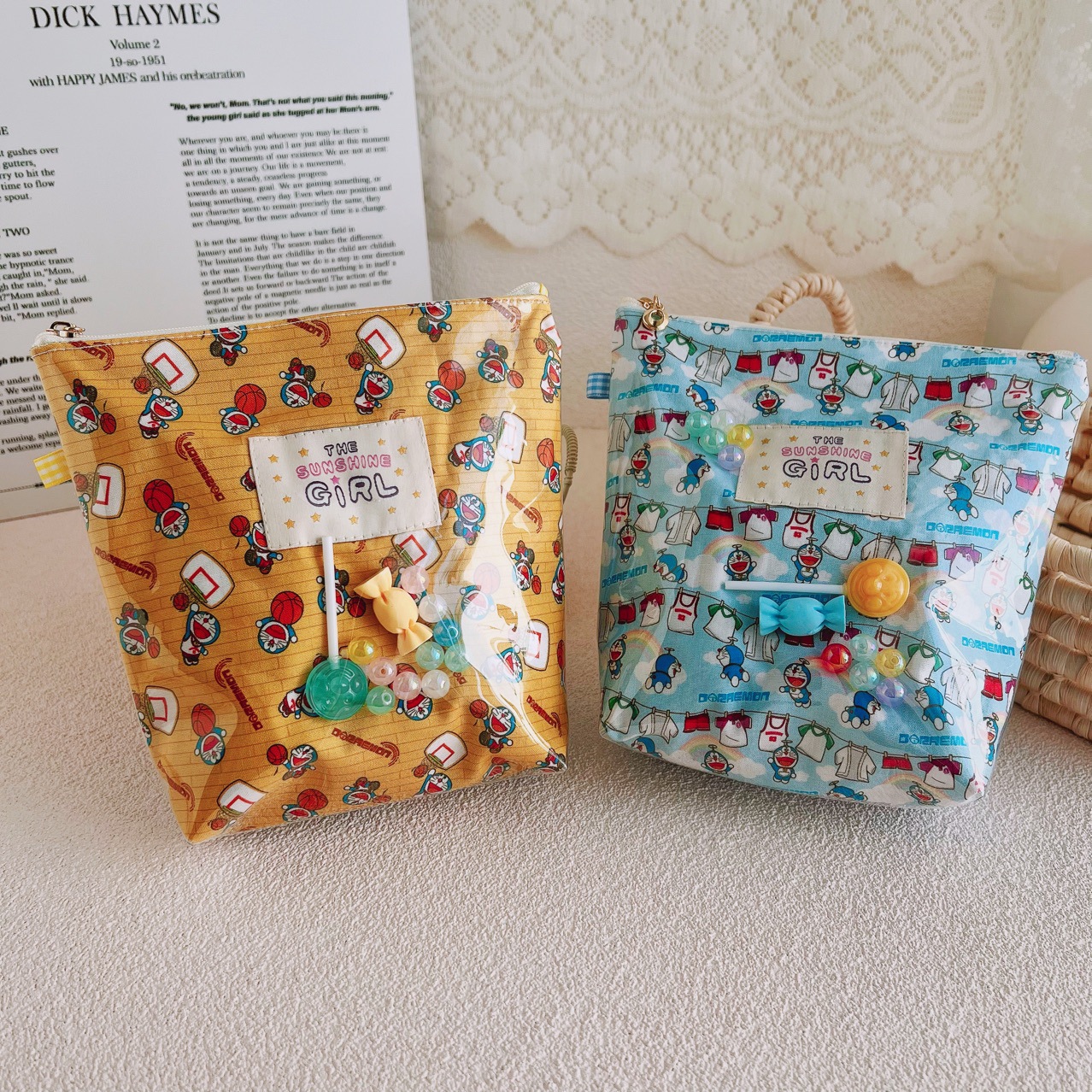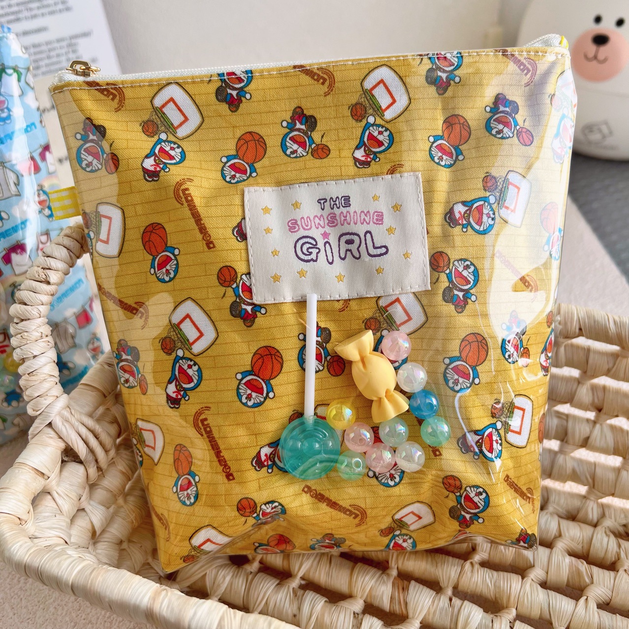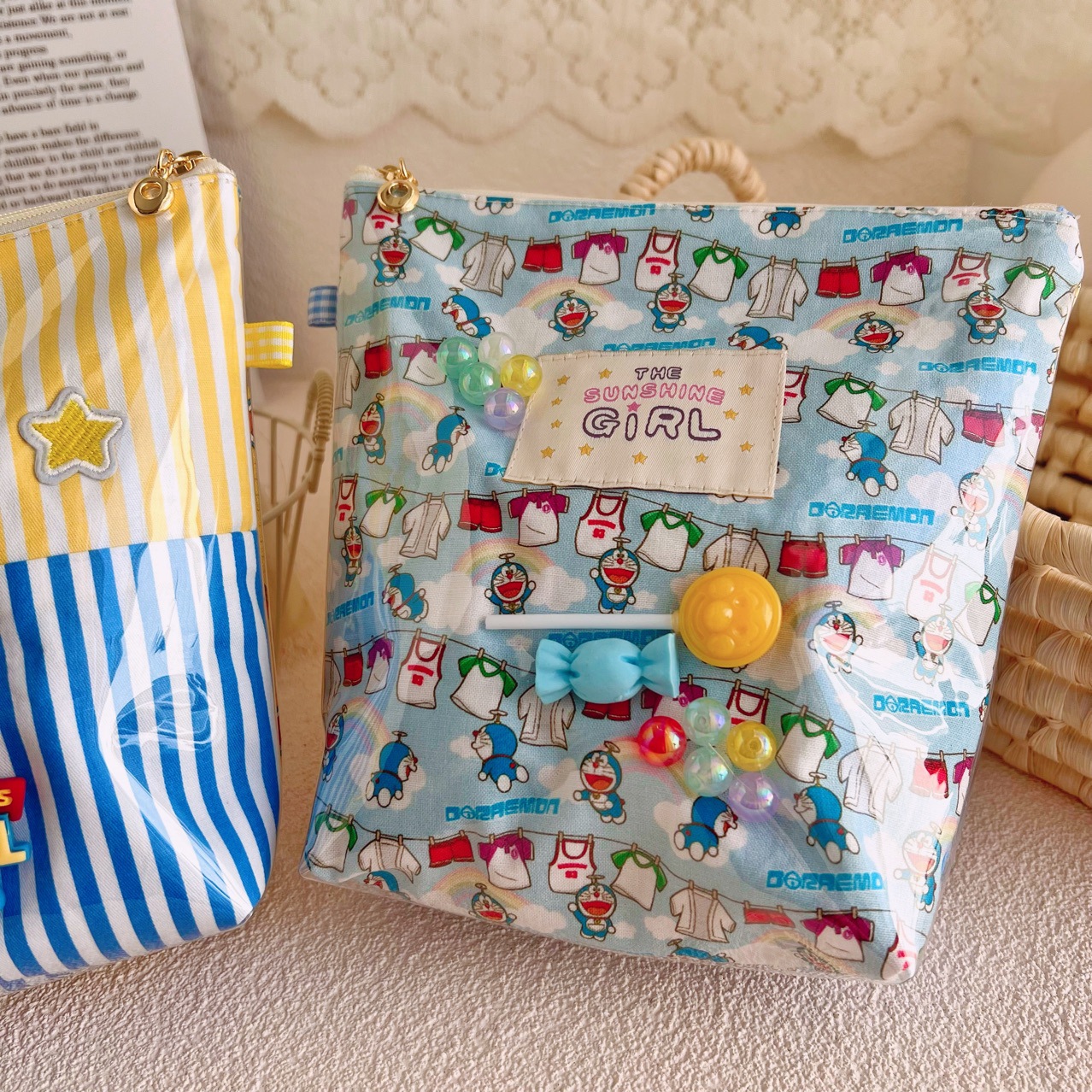 刺绣丁当猫化妆包透明流沙卡通收纳包条纹布艺包透明食玩包批发