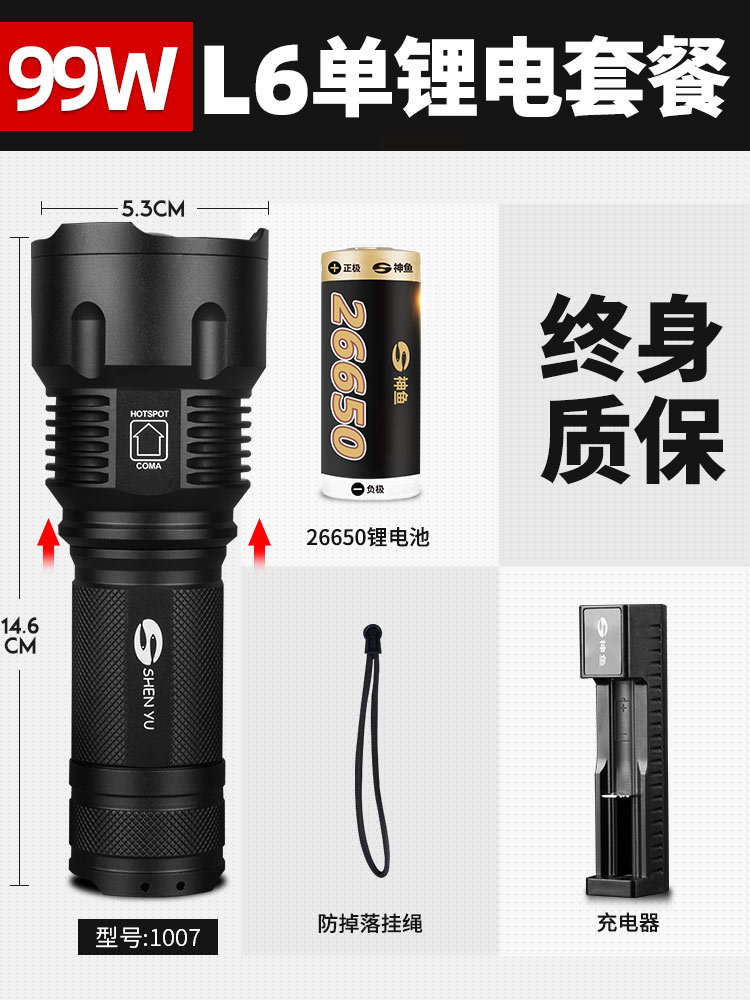 • 하이라이트 → [하이 엔드 스틸 캐논 에디션] 99W 26650 리튬 배터리 2 회 충전 밝고 긴 내구성