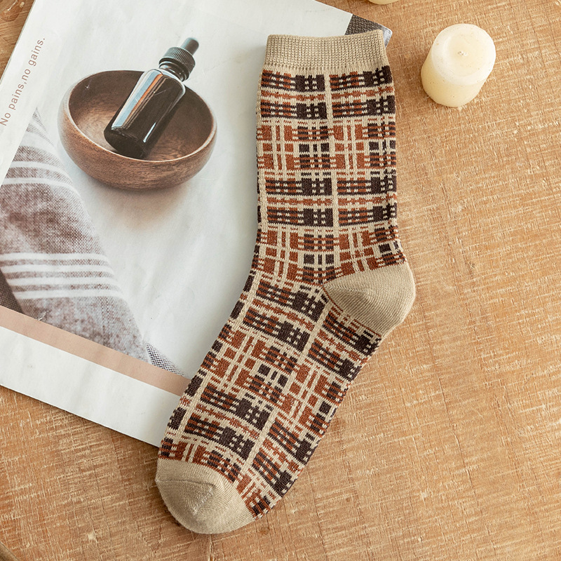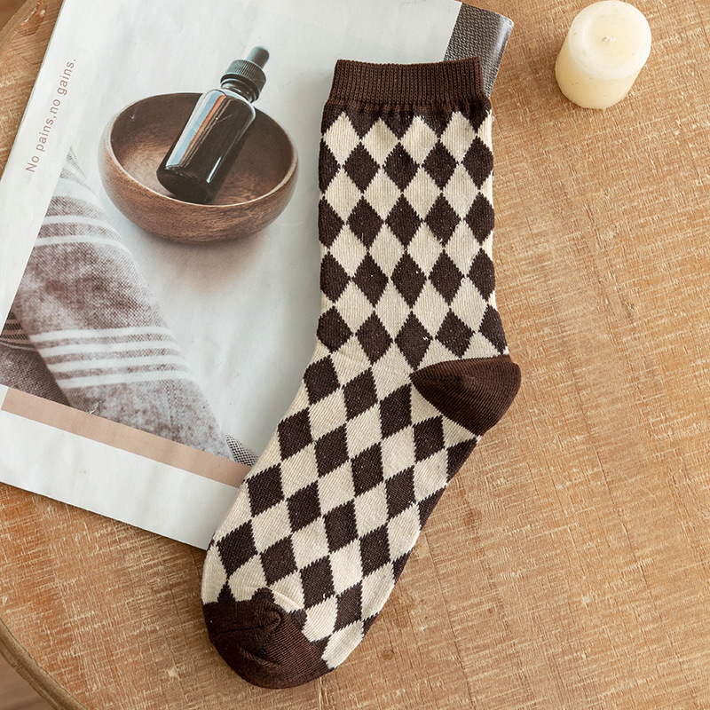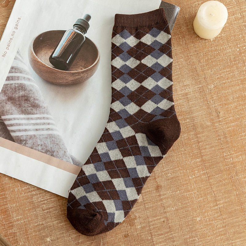 양말 여성용 가을과 겨울 핫 빈티지 미드 튜브 양말 다크 브라운 스타일의 마름모꼴 유행 양말 두꺼운 영국 스타일 여성용 면 양말