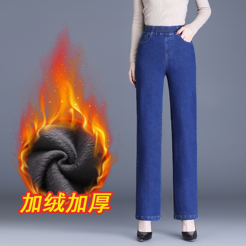 2023년 신상 여성용 기모 데님 팬츠, 신축성 있는 허리밴드, 스트레이트핏, 중년 여성용, 큰 사이즈, 여성용 바지, 원피스 배송스토어 가기