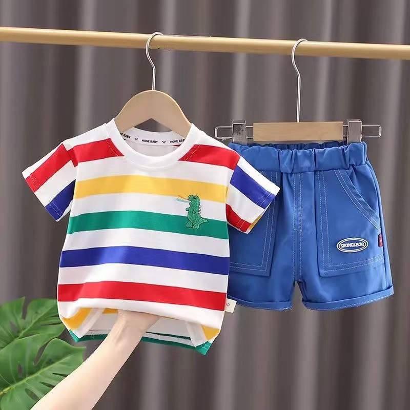어린이 여름 줄무늬 면 티셔츠 세트 남아 여아 풀오버 반팔 반바지 투피스 세트 순면 편안함