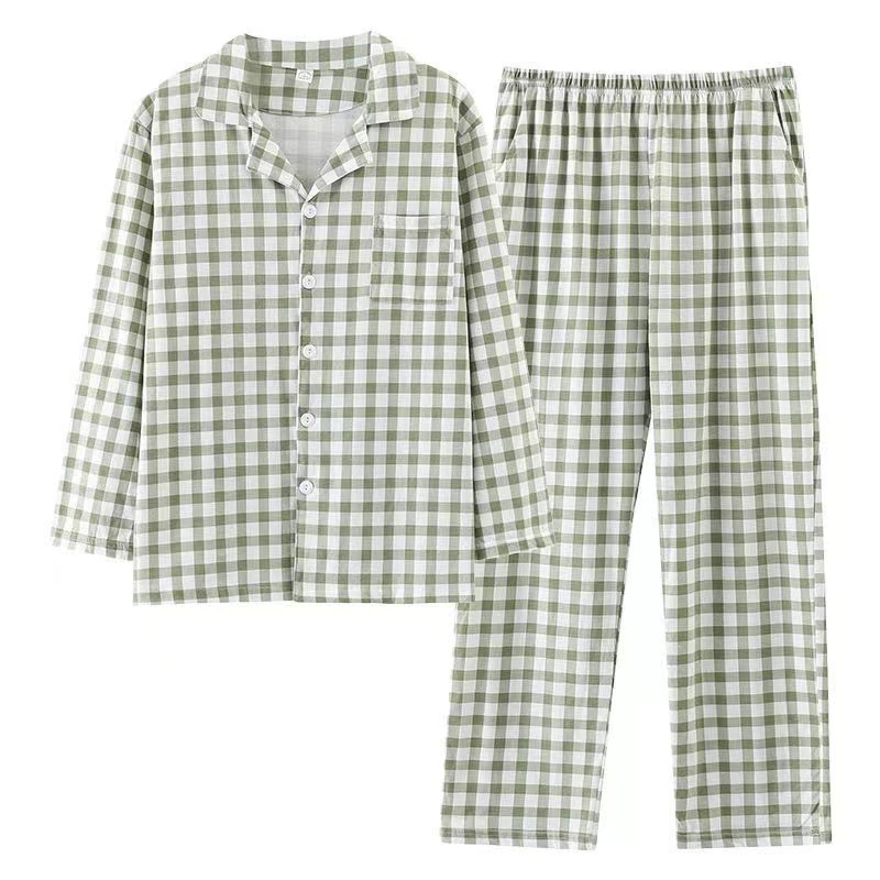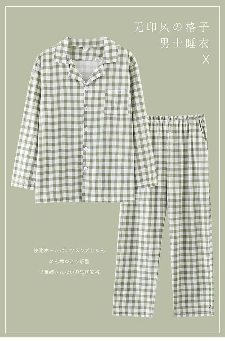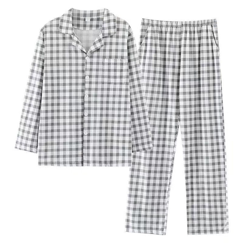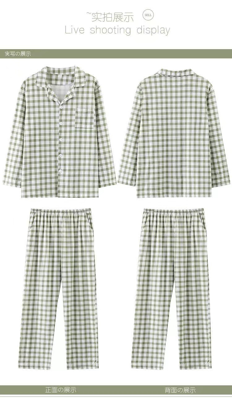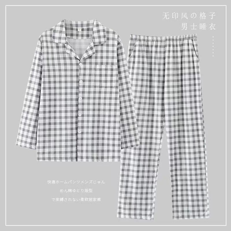 새로운 격자 무늬 잠옷 남성 여름 순수 코튼 일본식 긴팔 캐주얼 카디건 옷깃 에어컨 홈웨어 투피스 슈트스토어 가기