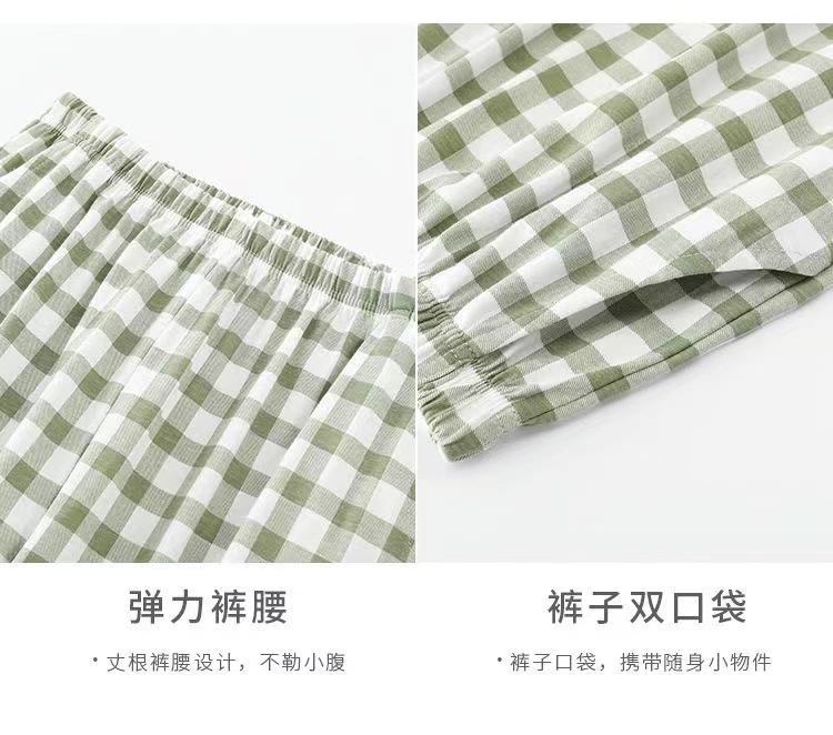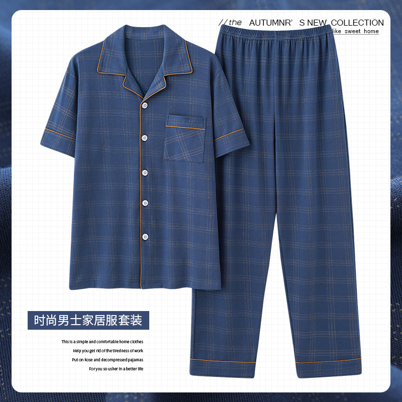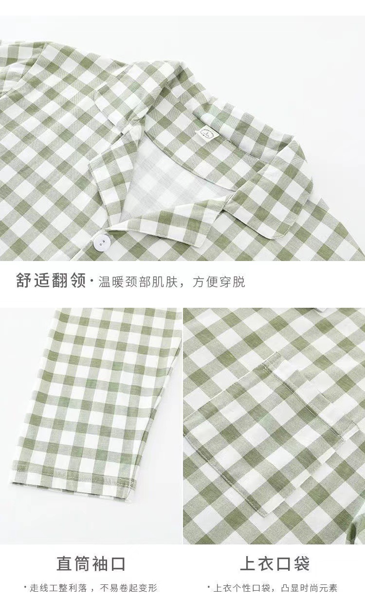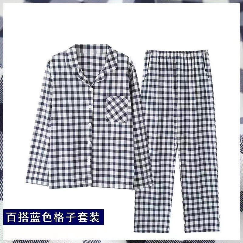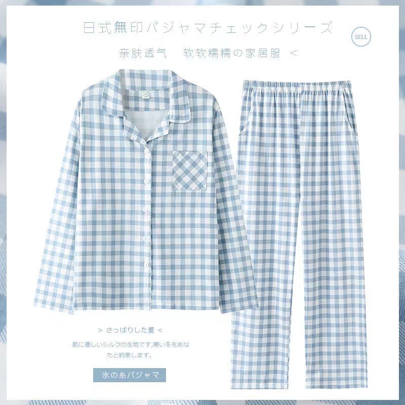 새로운 격자 무늬 잠옷 남성 여름 순수 코튼 일본식 긴팔 캐주얼 카디건 옷깃 에어컨 홈웨어 투피스 슈트스토어 가기
