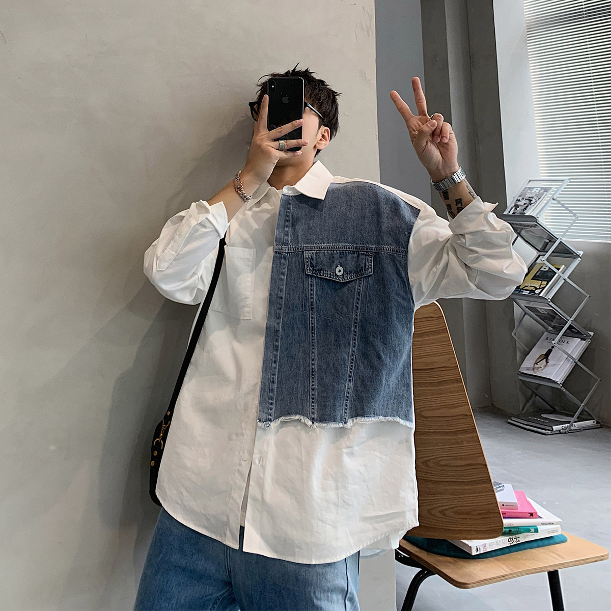 2022 봄과 가을 새로운 독특한 긴팔 셔츠 남자의 느슨한 틈새 디자인 감각 대비 컬러 스티치 데님 셔츠스토어 가기