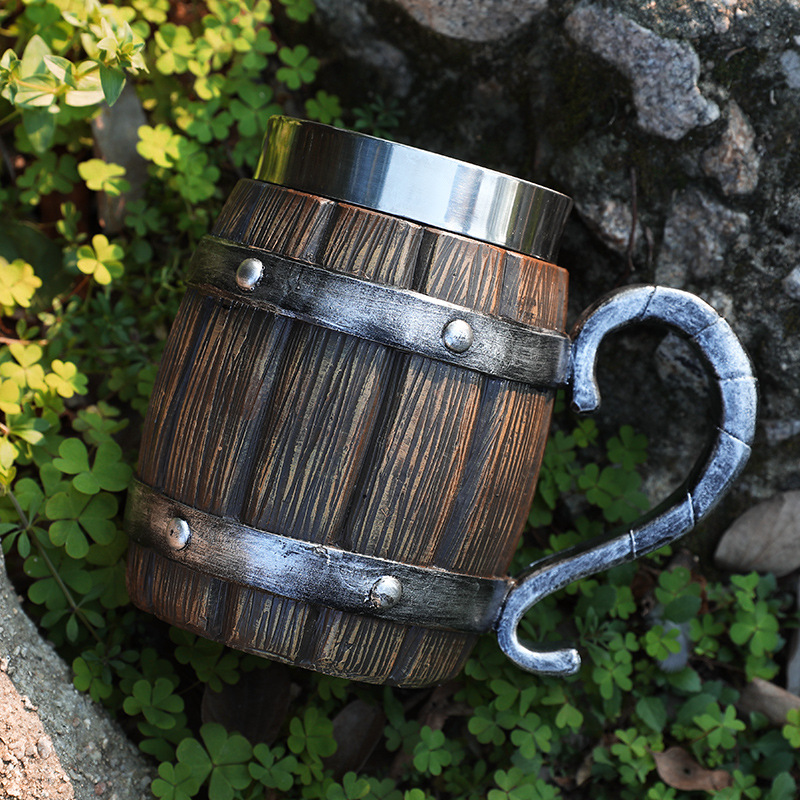 국경 간 폭발 나무 통 맥주 머그잔 창조적 인 수제 모조 나무 스테인레스 스틸 맥주 머그잔 대용량 바 물 컵