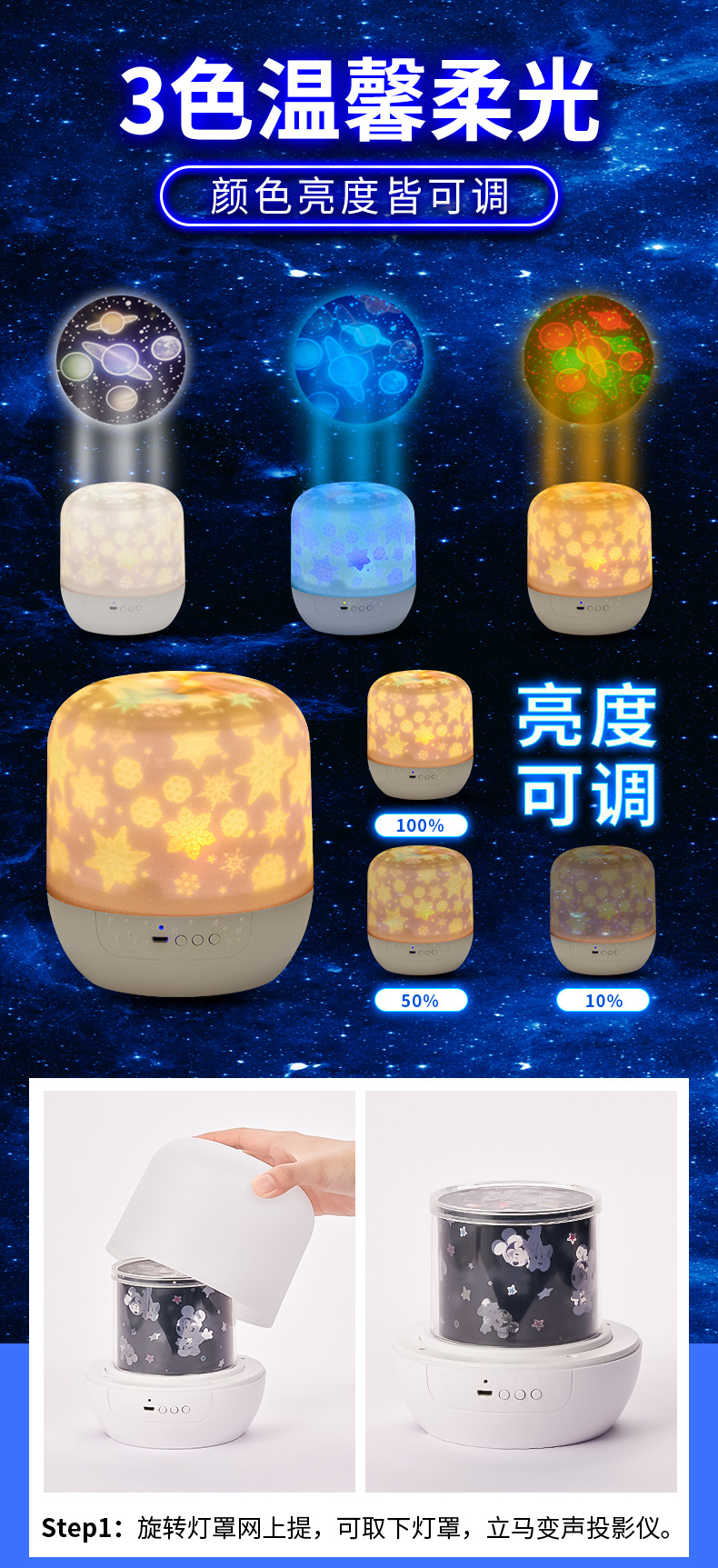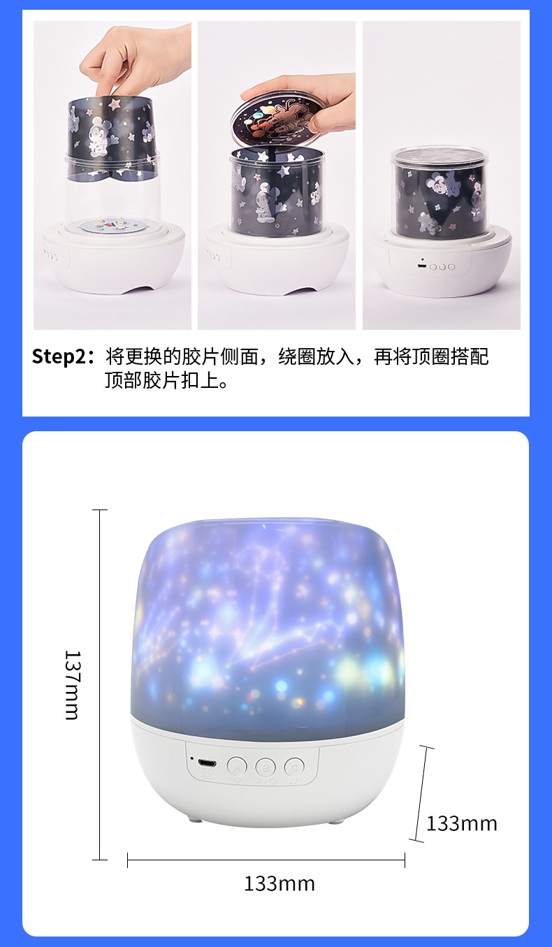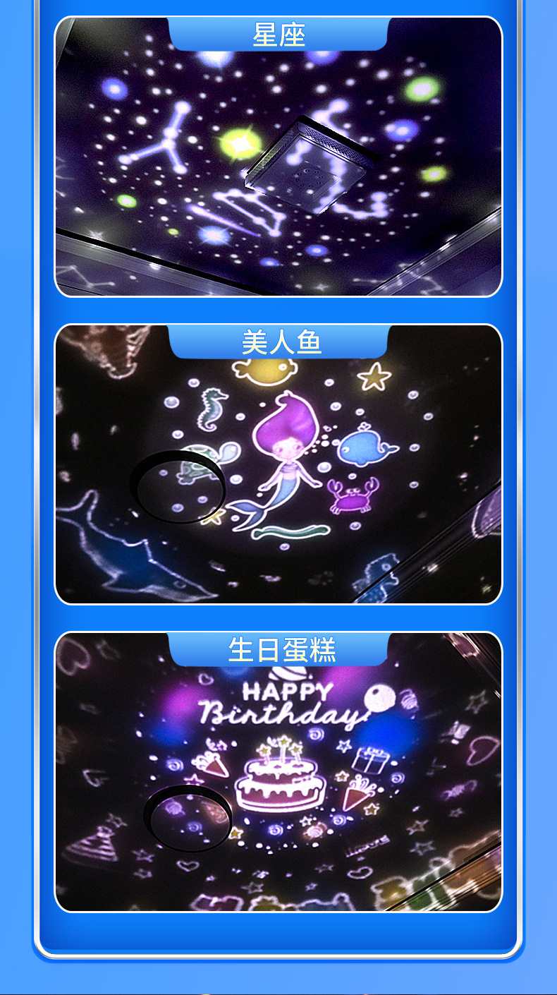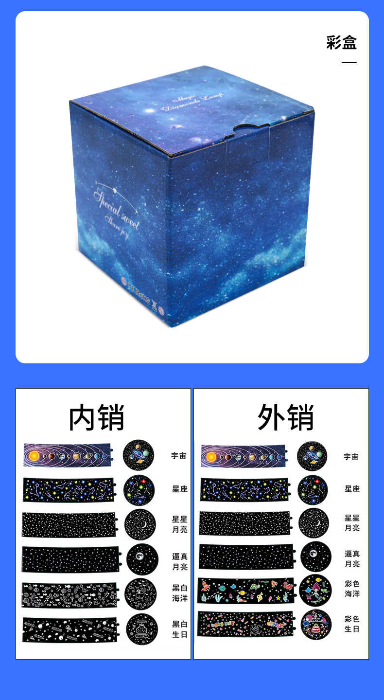 产品标配:皇冠投影灯*1;USB电源线*1;说明书*1;投影胶片;遥控器*1(仅充电款)