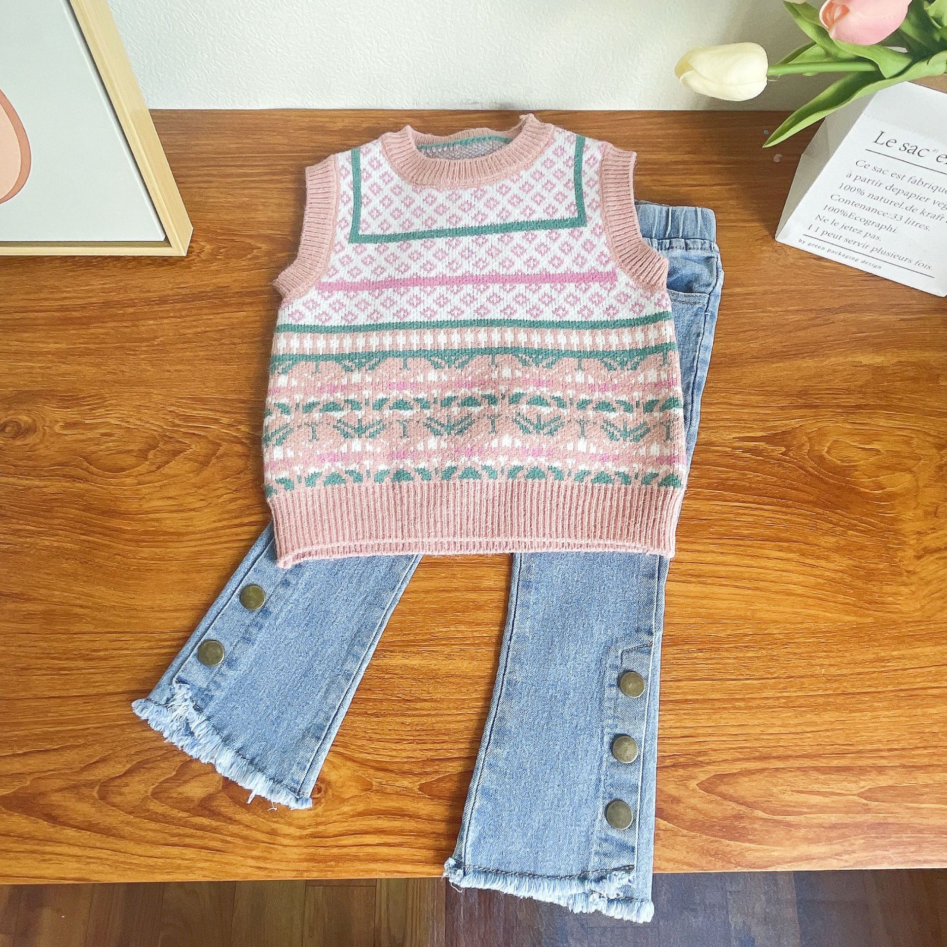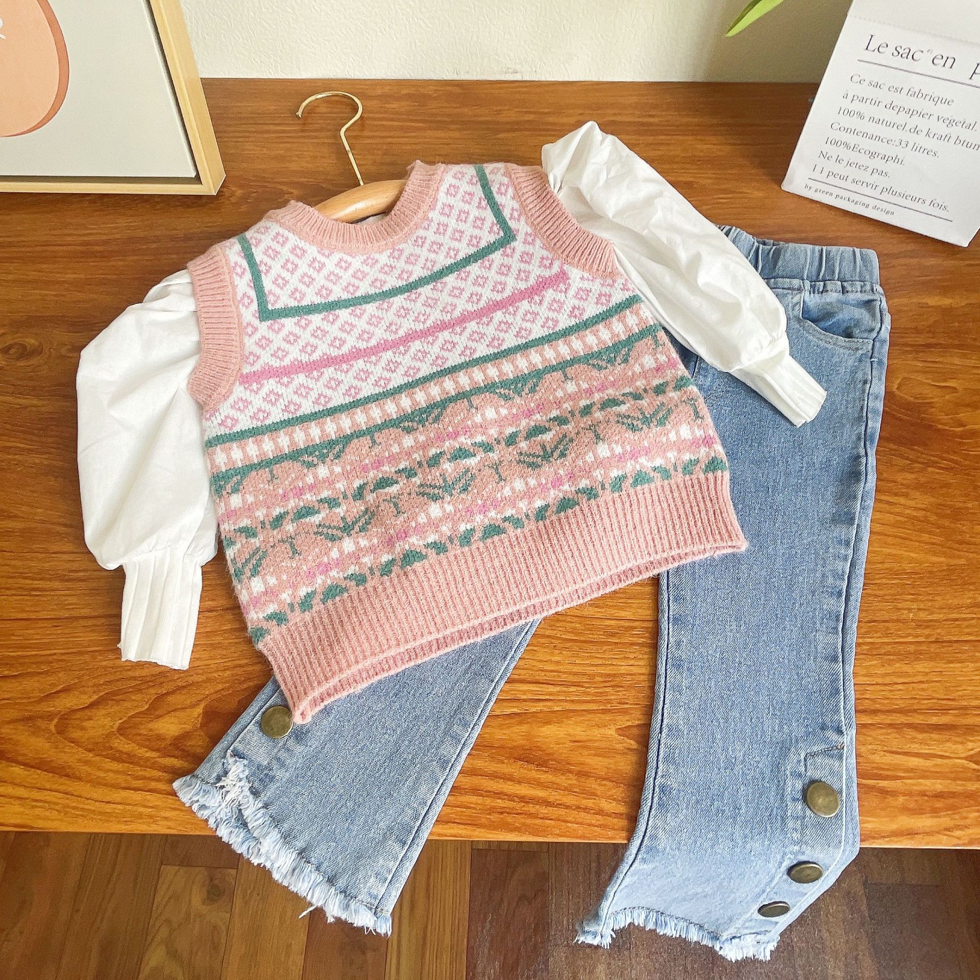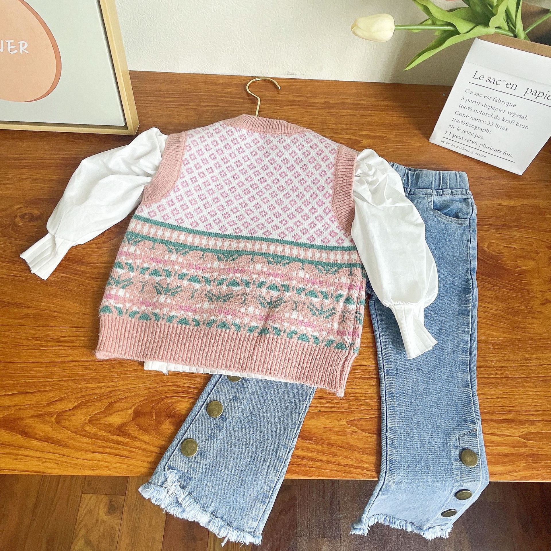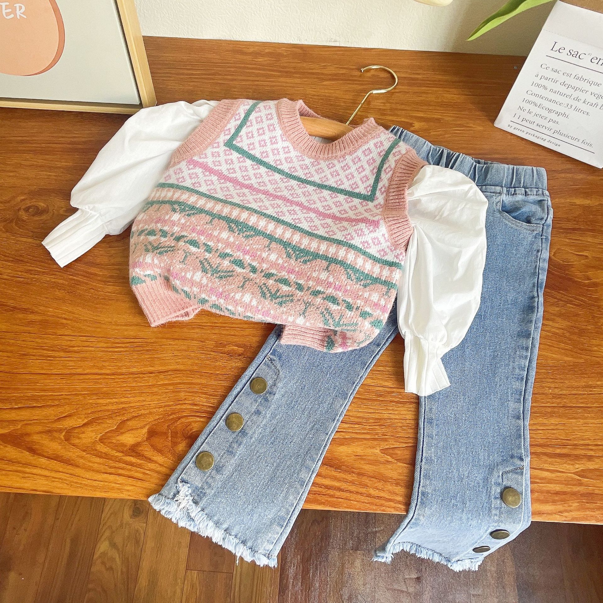Ancorelala 가을과 겨울 새로운 소녀 세트 스웨터 조끼 바닥 셔츠 데님 플레어 팬츠 3 피스 세트