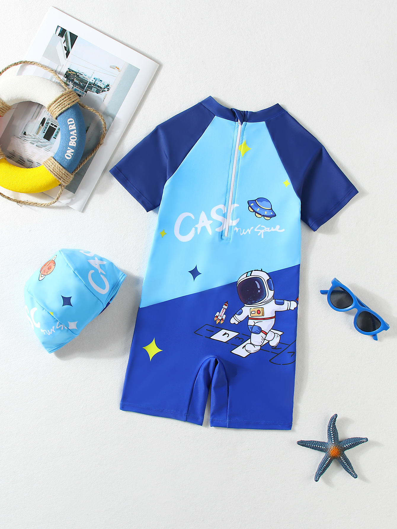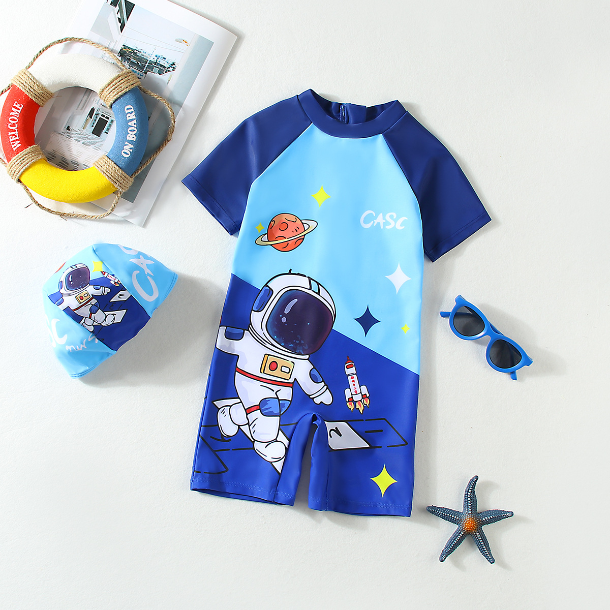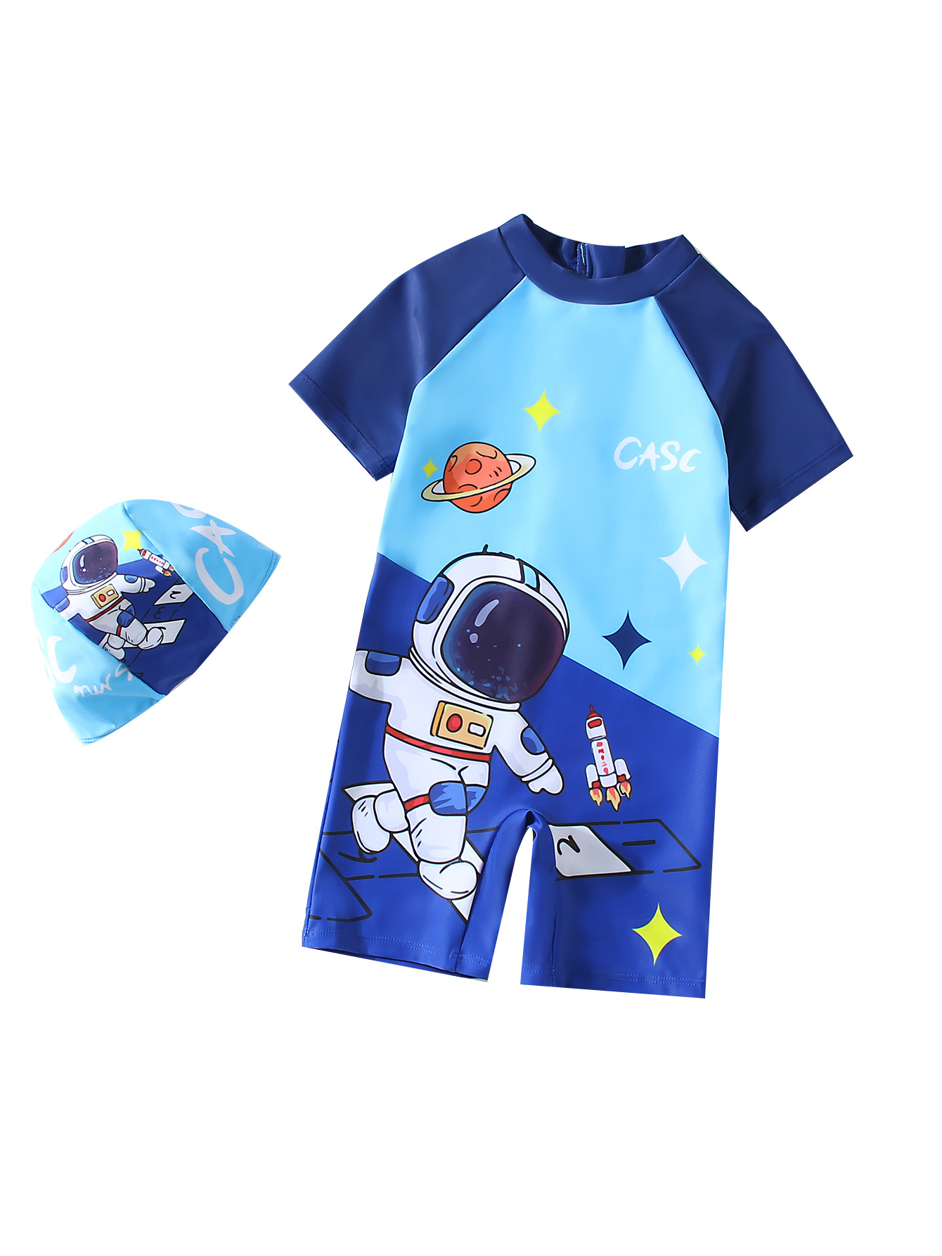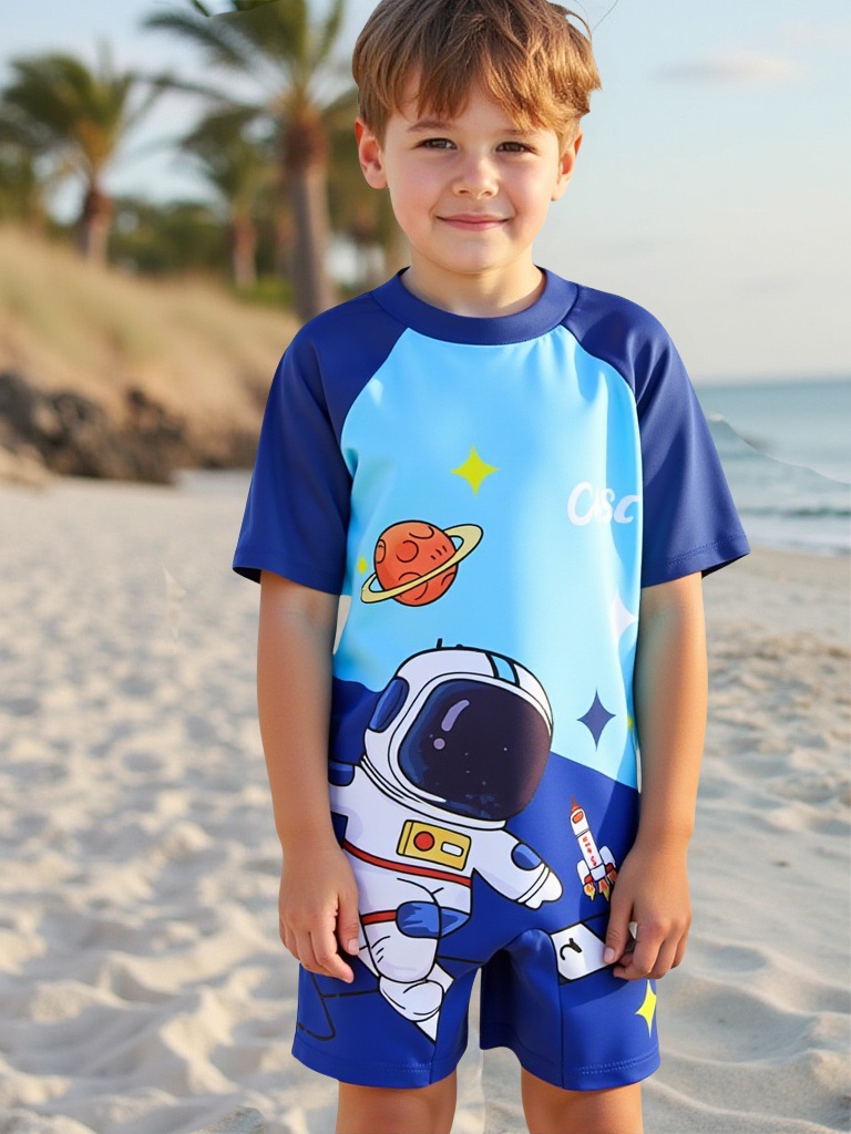 어린이 수영복 소년 원피스 수영복 2025 신상 만화 우주인 반팔 속건 어린이 소년 수영복