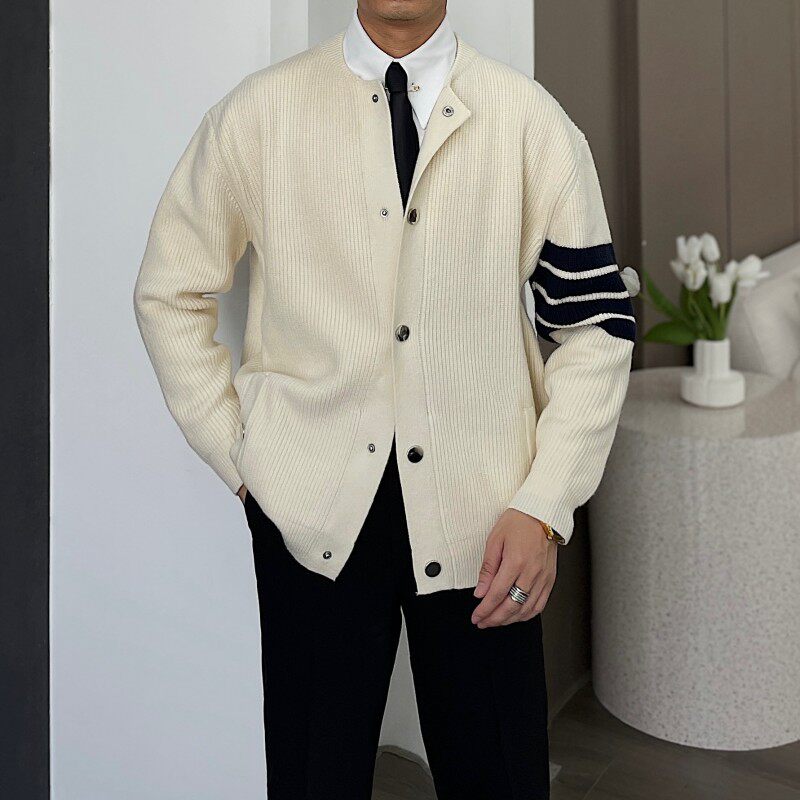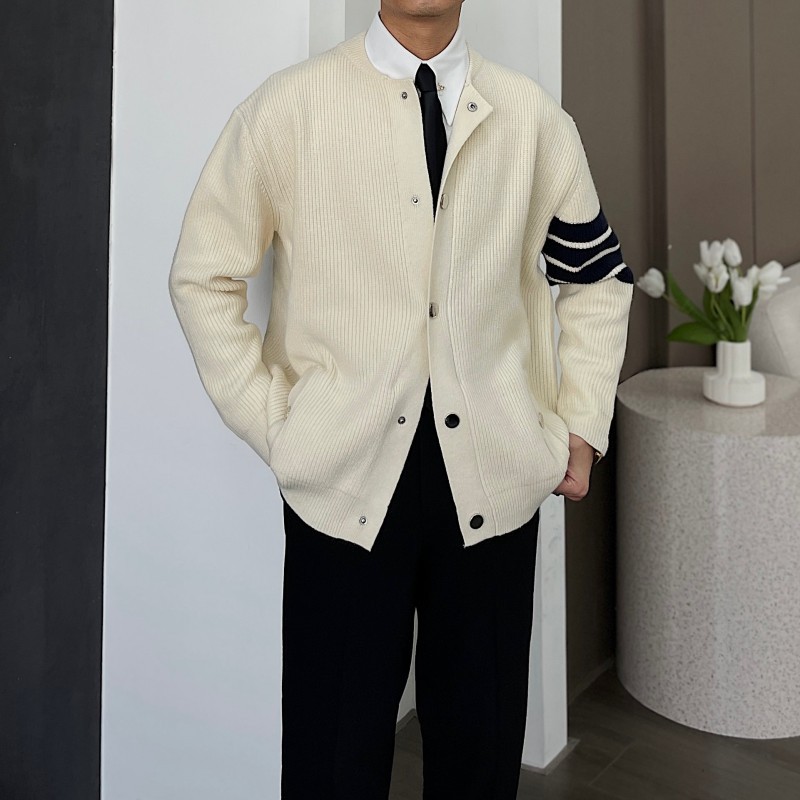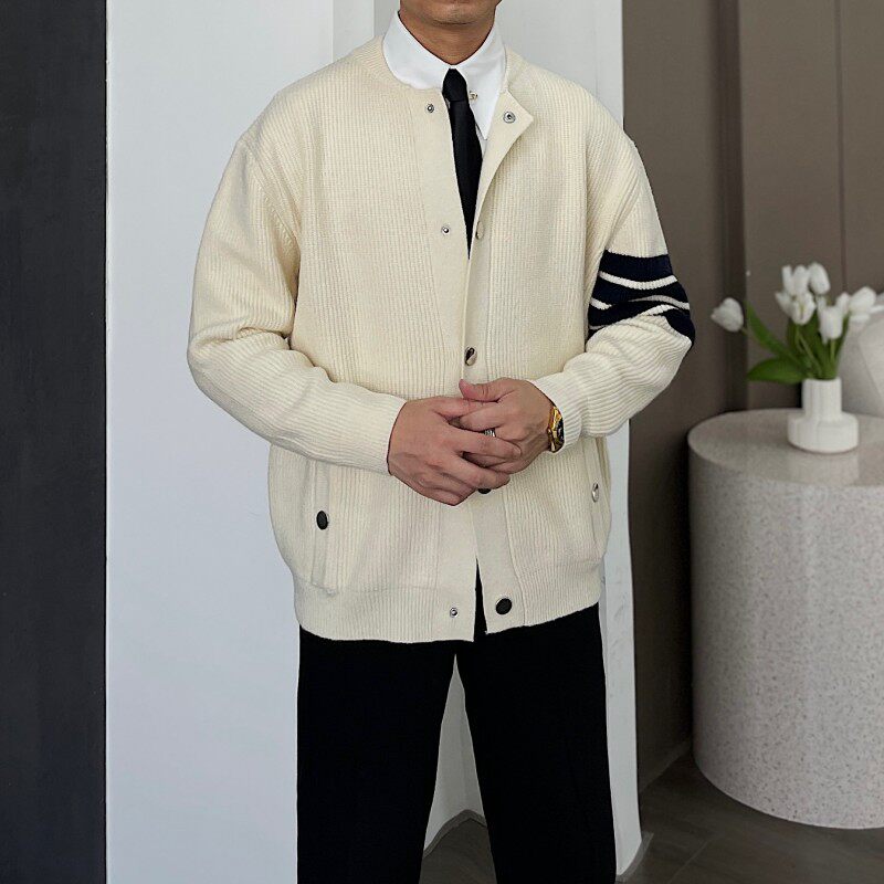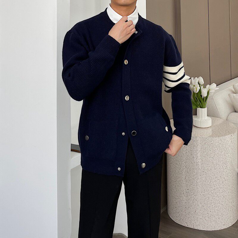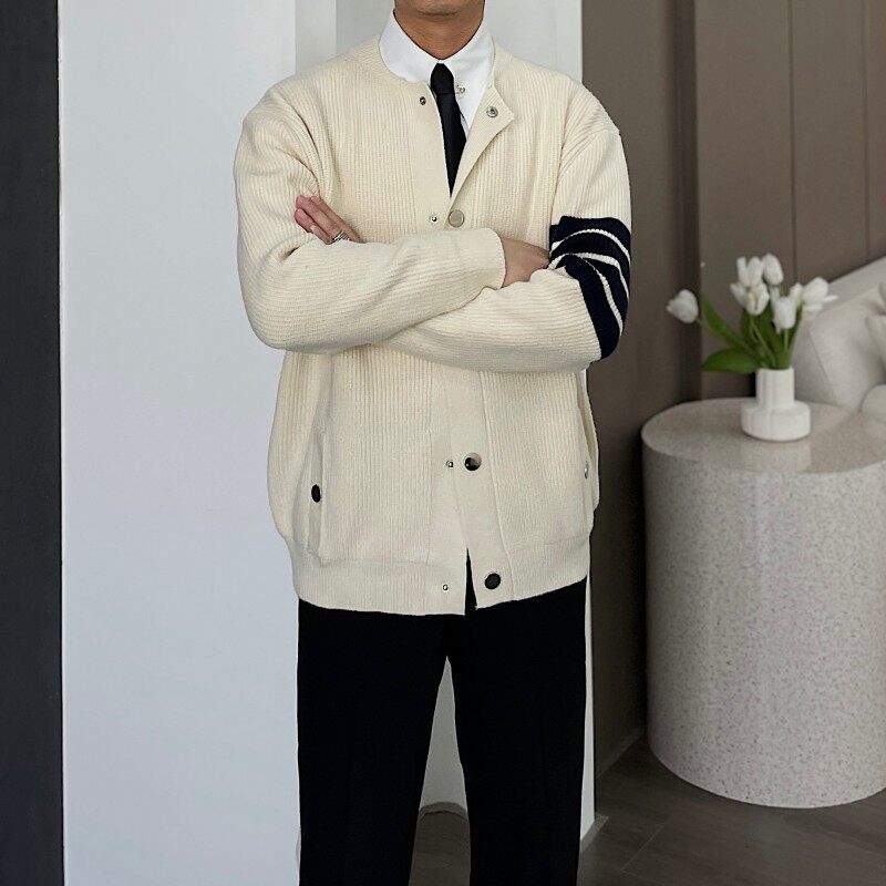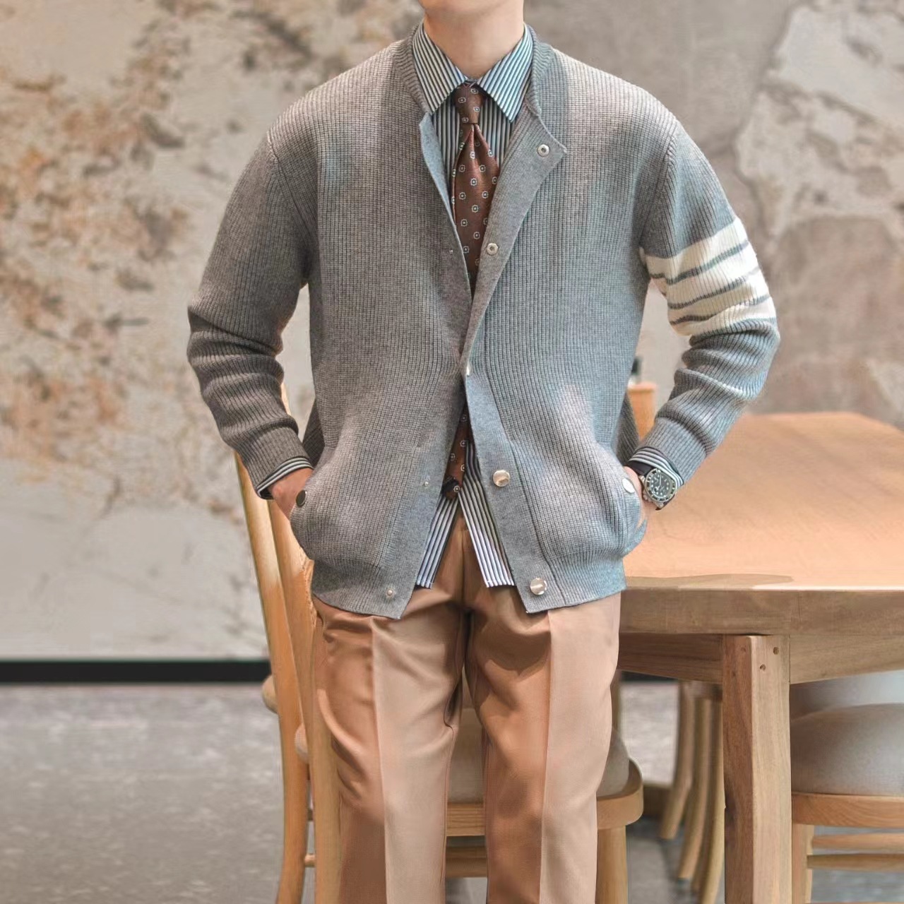 가을과 겨울 빈티지 캐주얼 스탠드 칼라 포 바 니트 스웨터 재킷 한국 스타일 모든 매치 가디건 스웨터 트렌디 남성과 여성스토어 가기