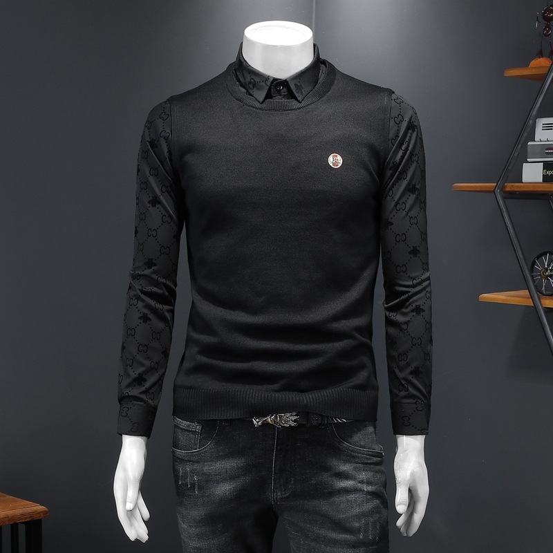 유럽 스타일 남성 스웨터, 페이크 투피스 셔츠 칼라, 가을 겨울 신상 슬림핏 트렌디 긴팔 니트웨어