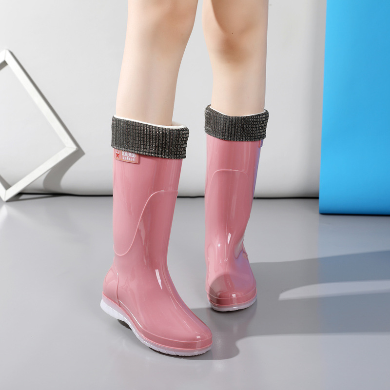 여성용 고층 레인 부츠 탈부착 면 방수 내마모성 작업 고무 신발 사계절 웨어러블 워터 슈즈 단색 롱 레인 부츠