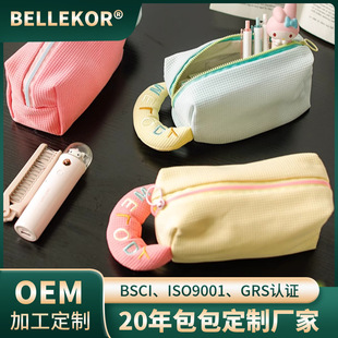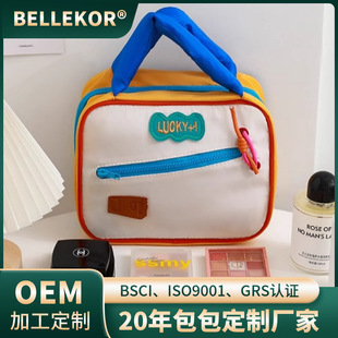 现货少女心撞色化妆包涤纶收纳包ins手拎旅行奶油风华夫格洗漱袋