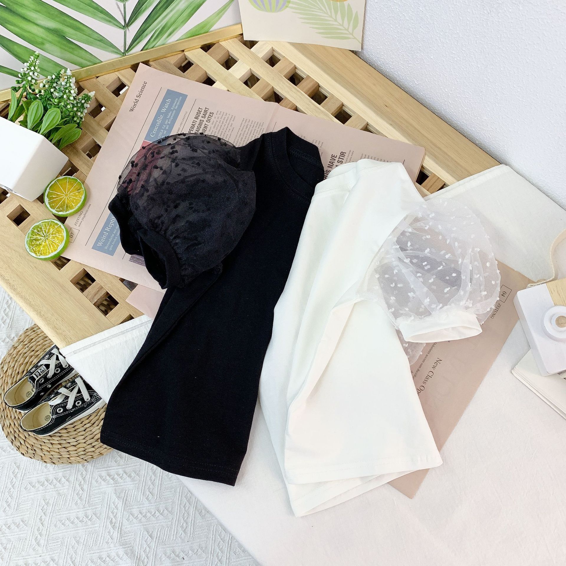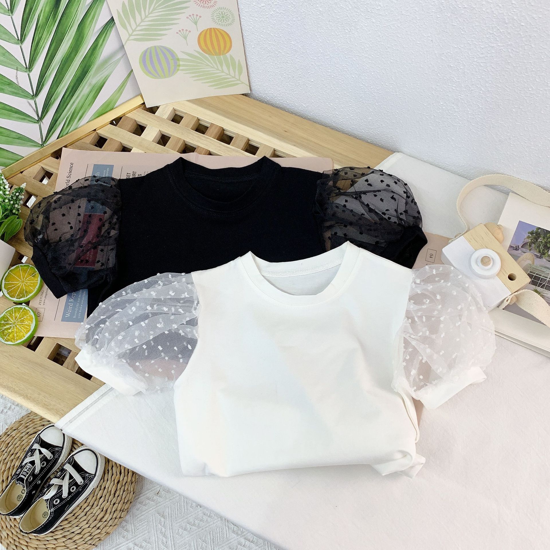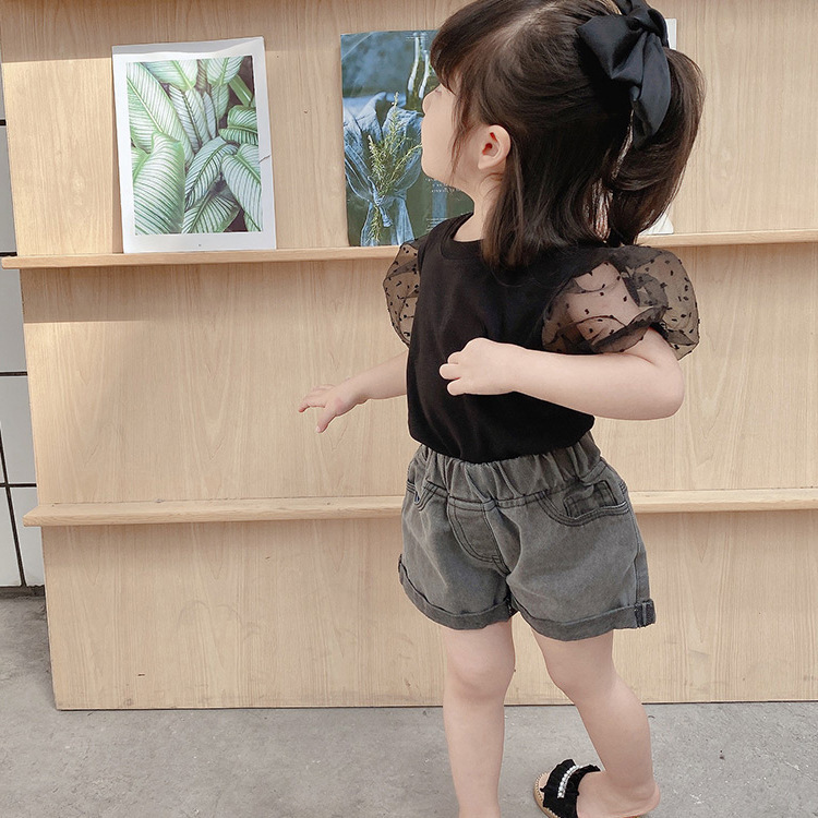 여자 세련된 버블 슬리브 티셔츠 2023 여름 새로운 한국 스타일 어린이 인터넷 인기있는 메쉬 반팔 여름 옷스토어 가기