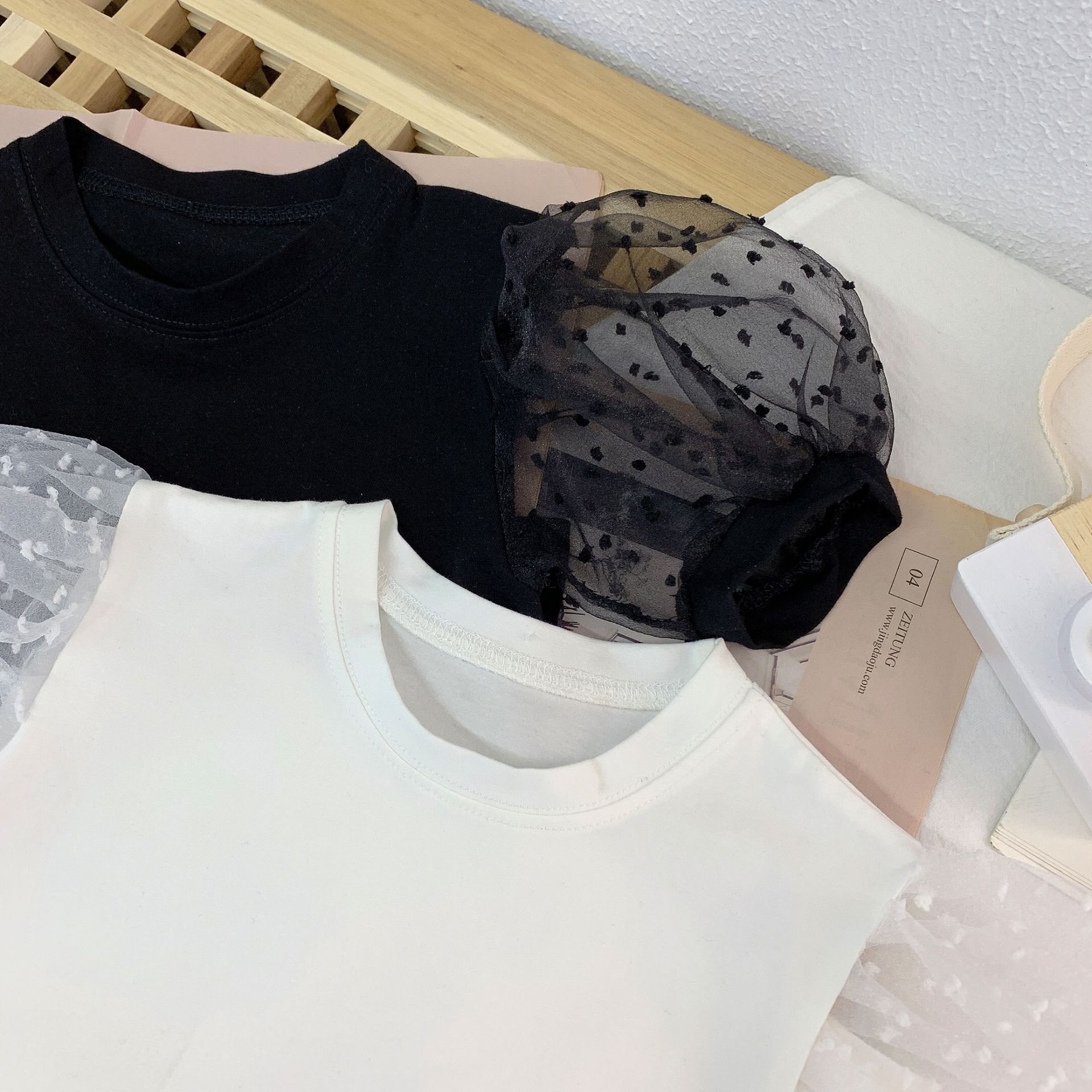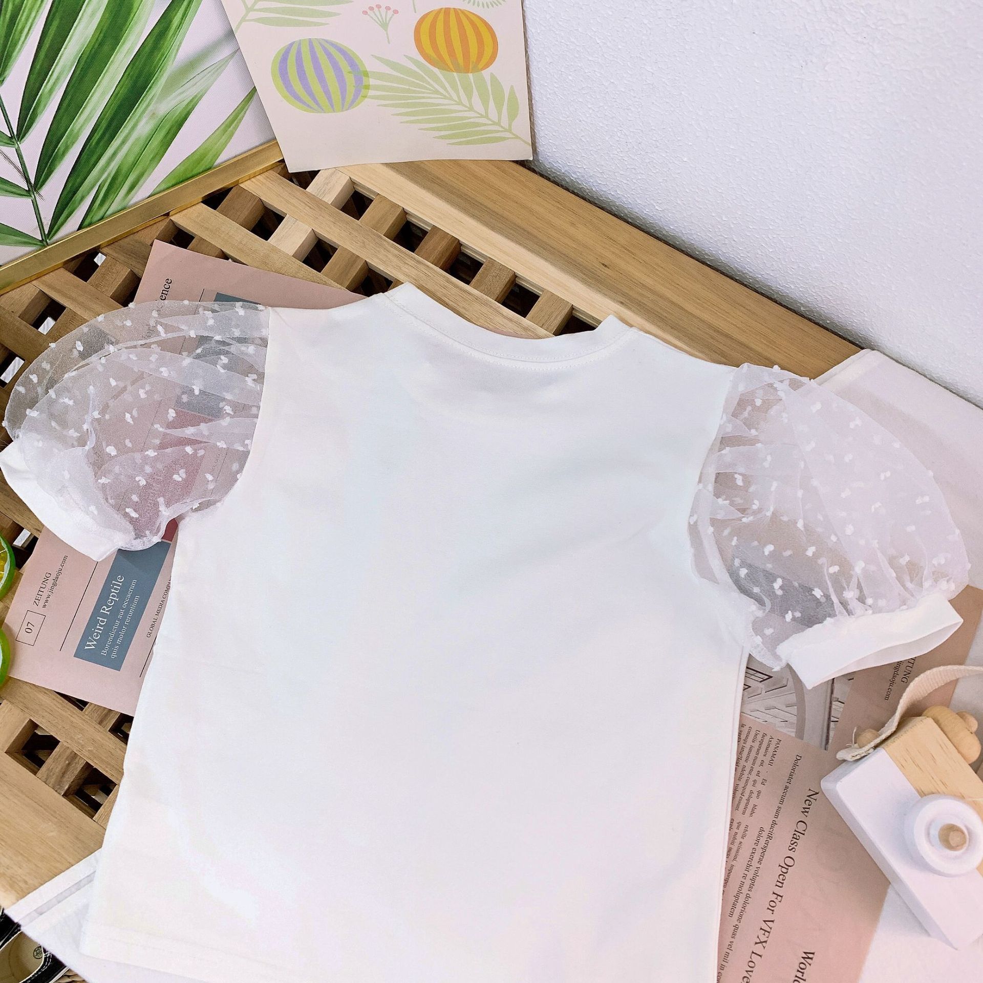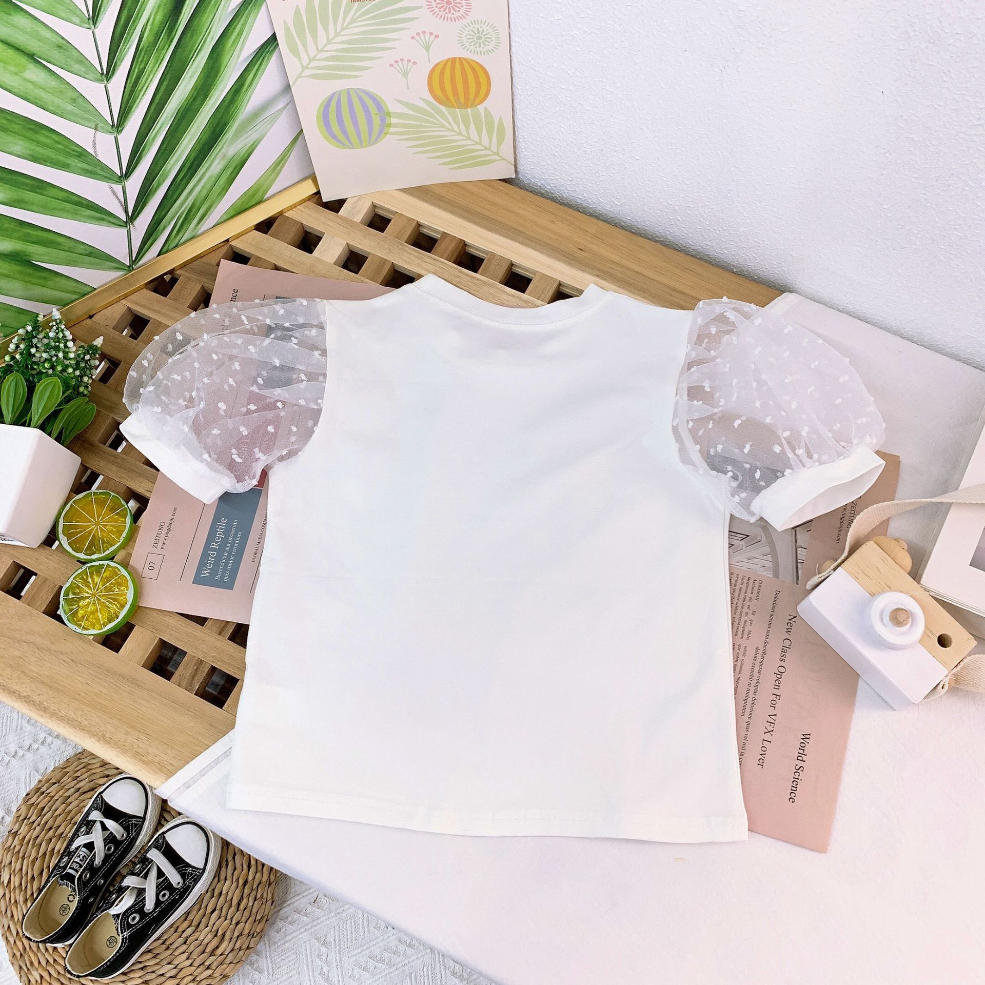 여자 세련된 버블 슬리브 티셔츠 2023 여름 새로운 한국 스타일 어린이 인터넷 인기있는 메쉬 반팔 여름 옷스토어 가기