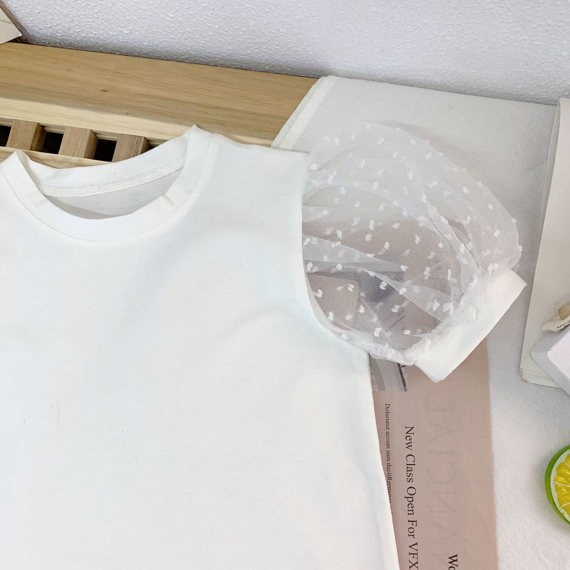여자 세련된 버블 슬리브 티셔츠 2023 여름 새로운 한국 스타일 어린이 인터넷 인기있는 메쉬 반팔 여름 옷