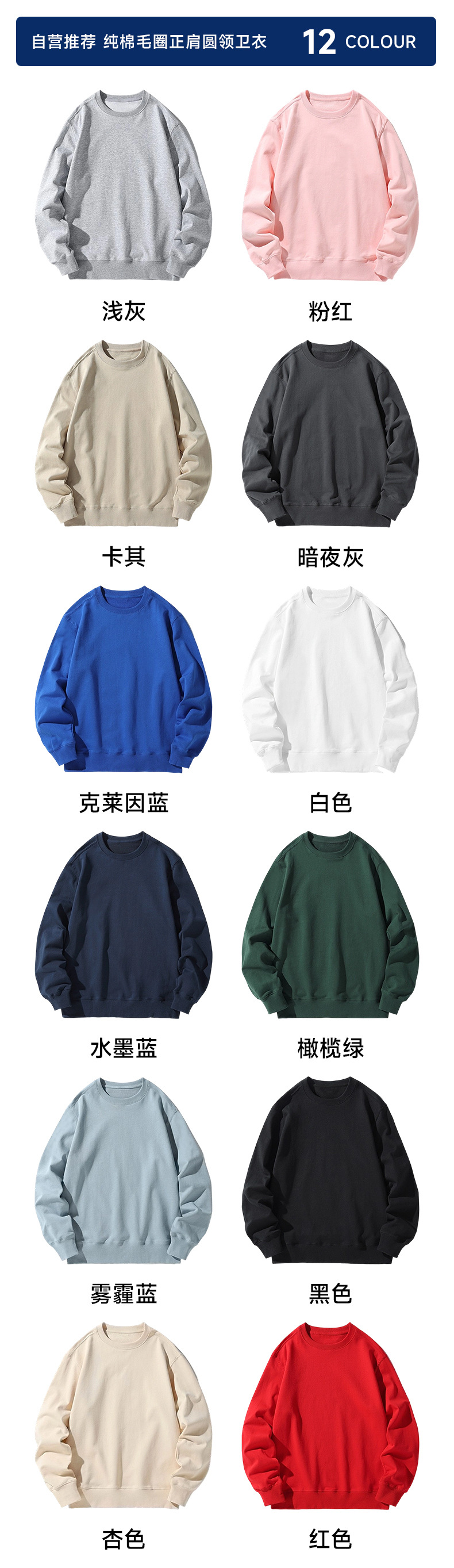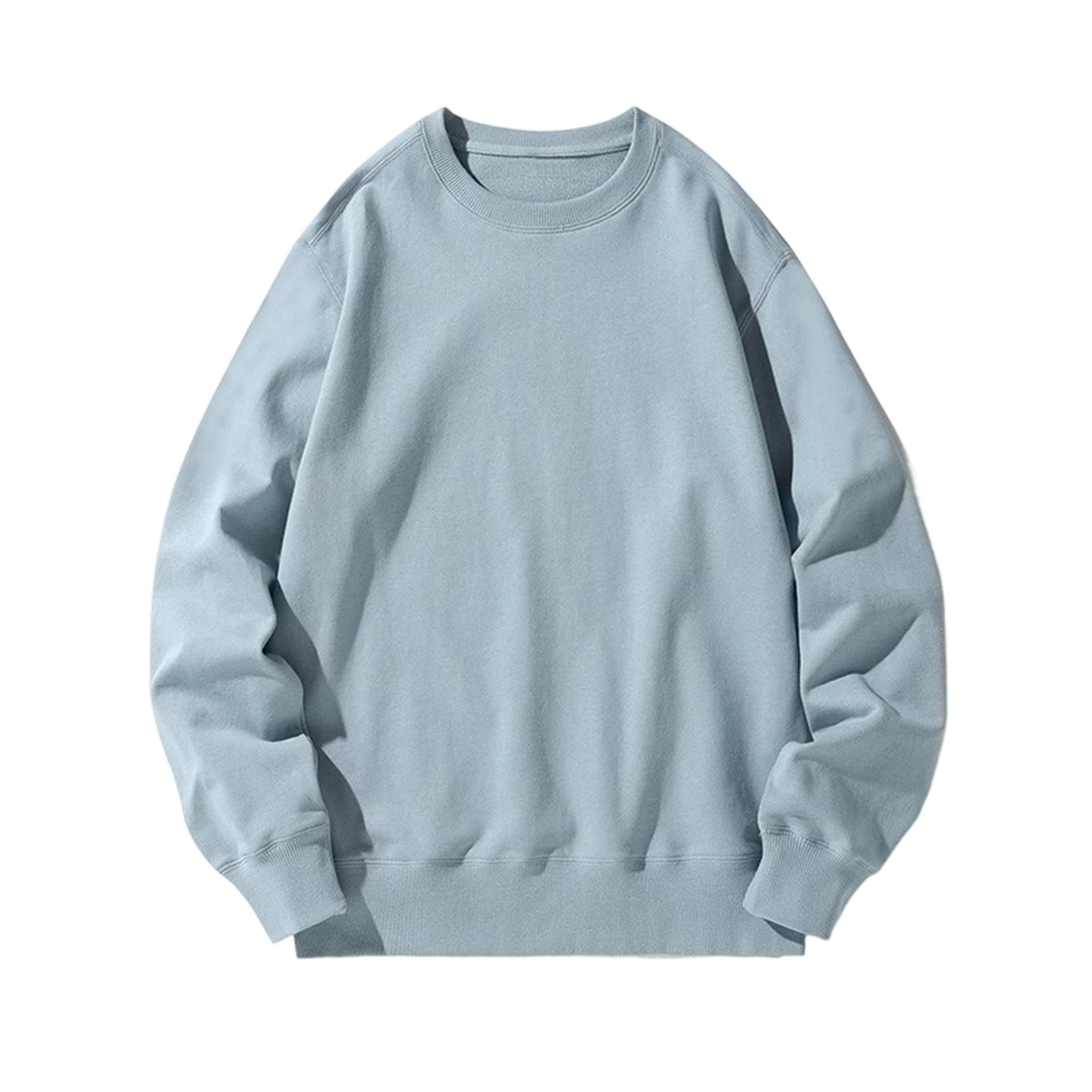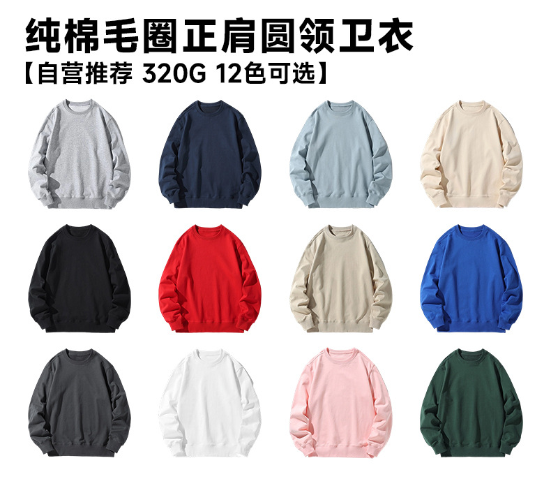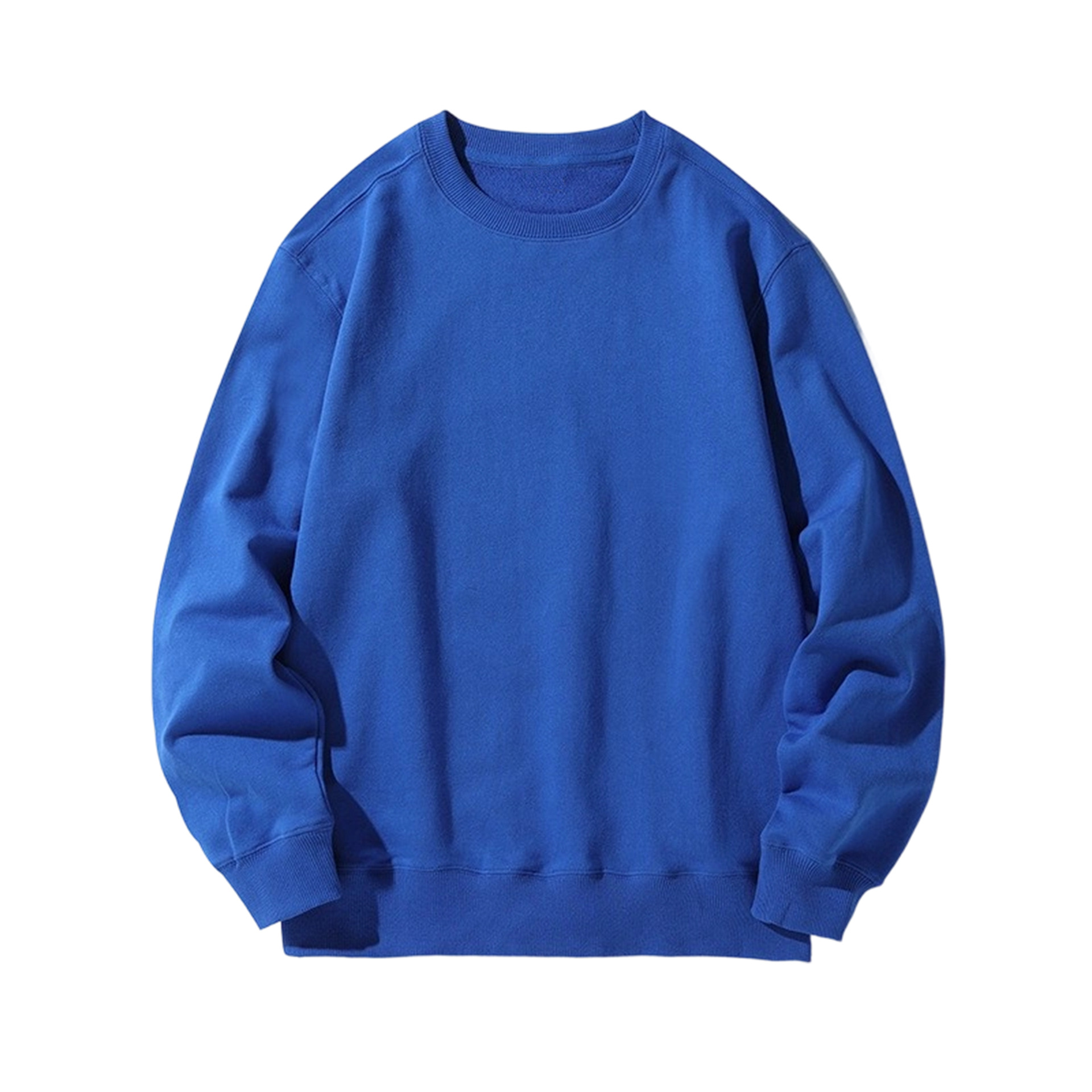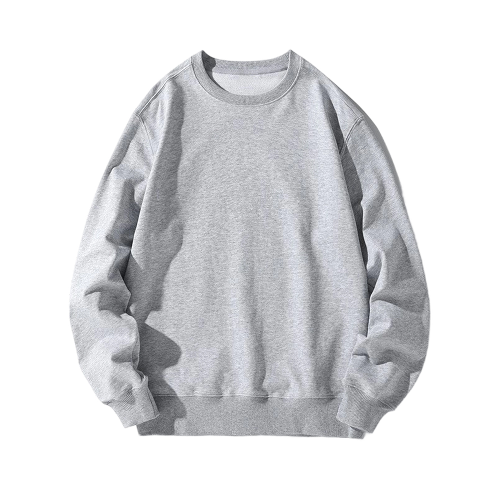 오른쪽 어깨 부분에 테리 원단의 라운드넥 스웨트셔츠, 순면 긴팔 교복/작업복, 무지 단색, 로고 인쇄/자수/직물 프린팅