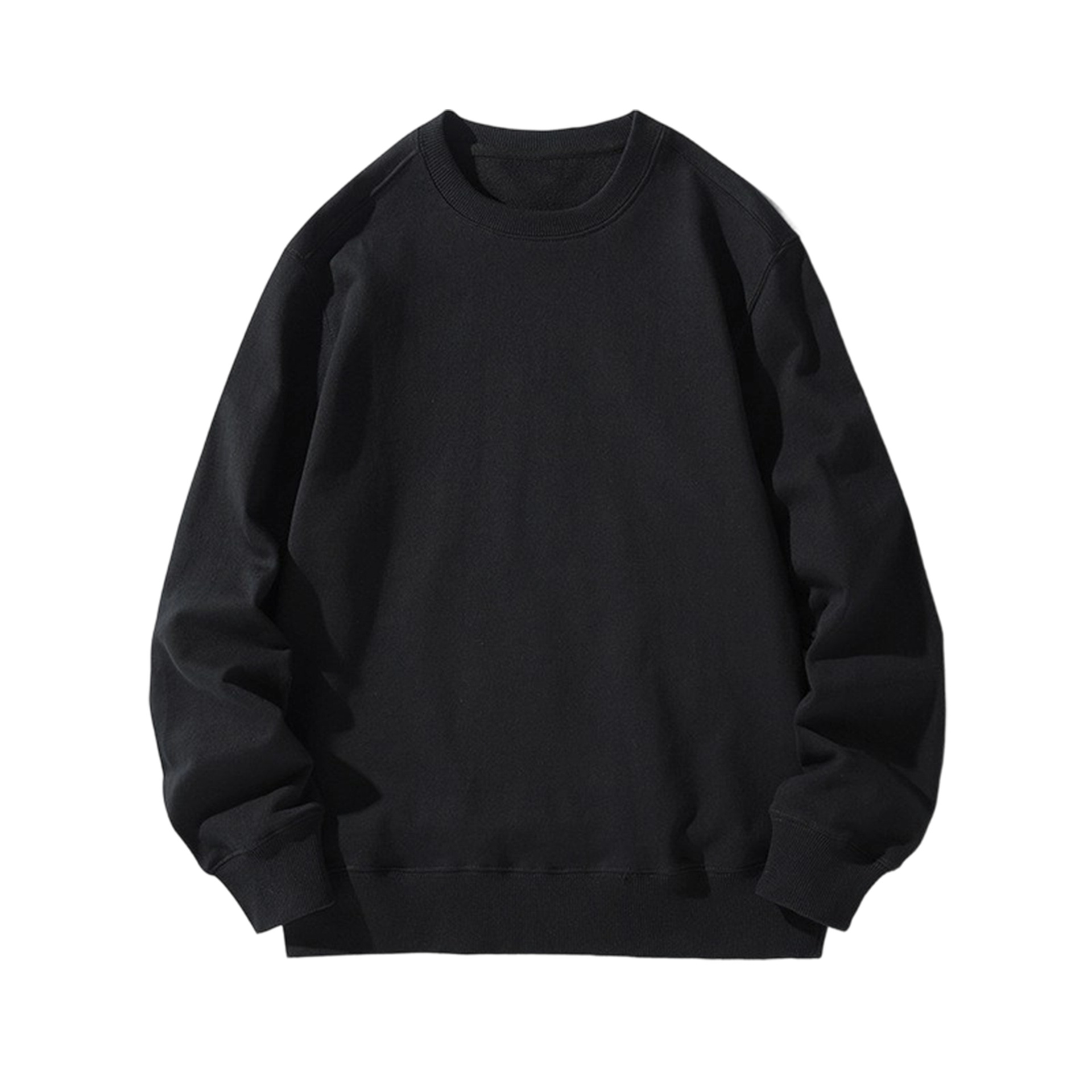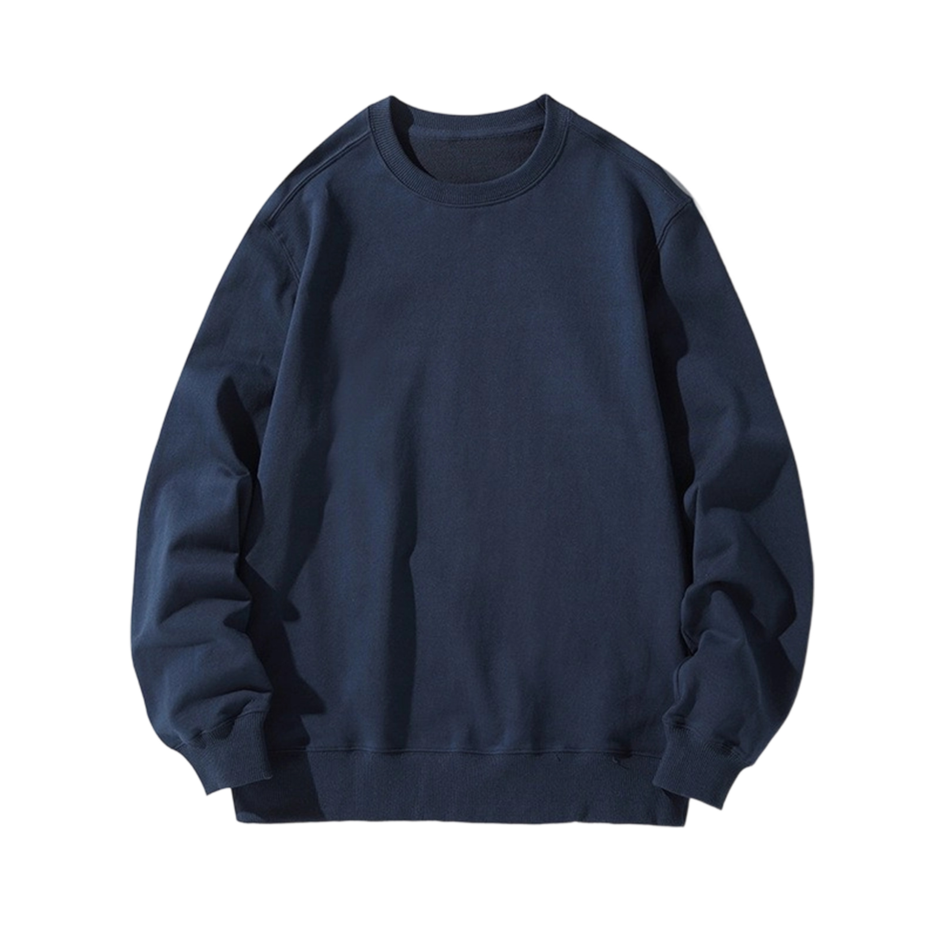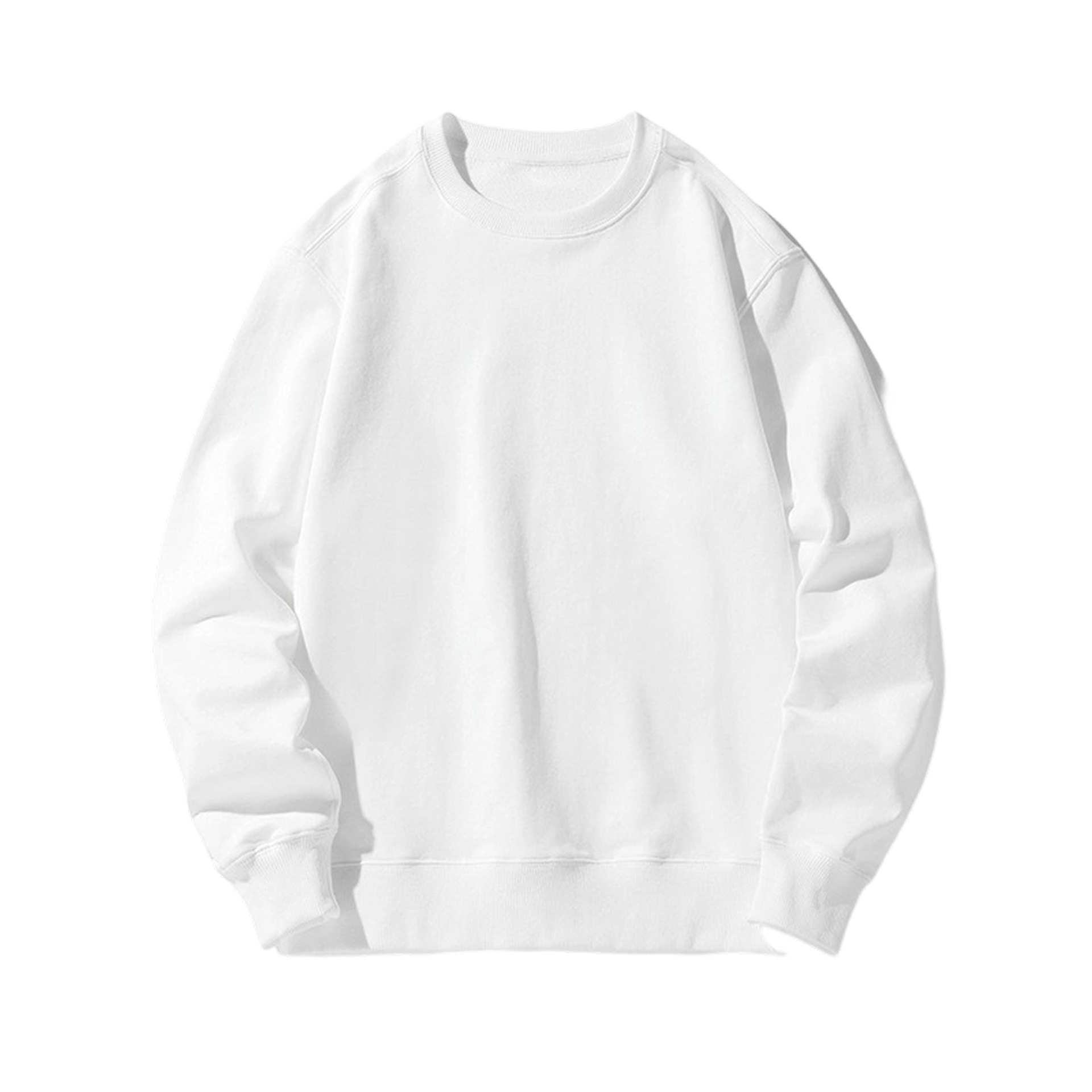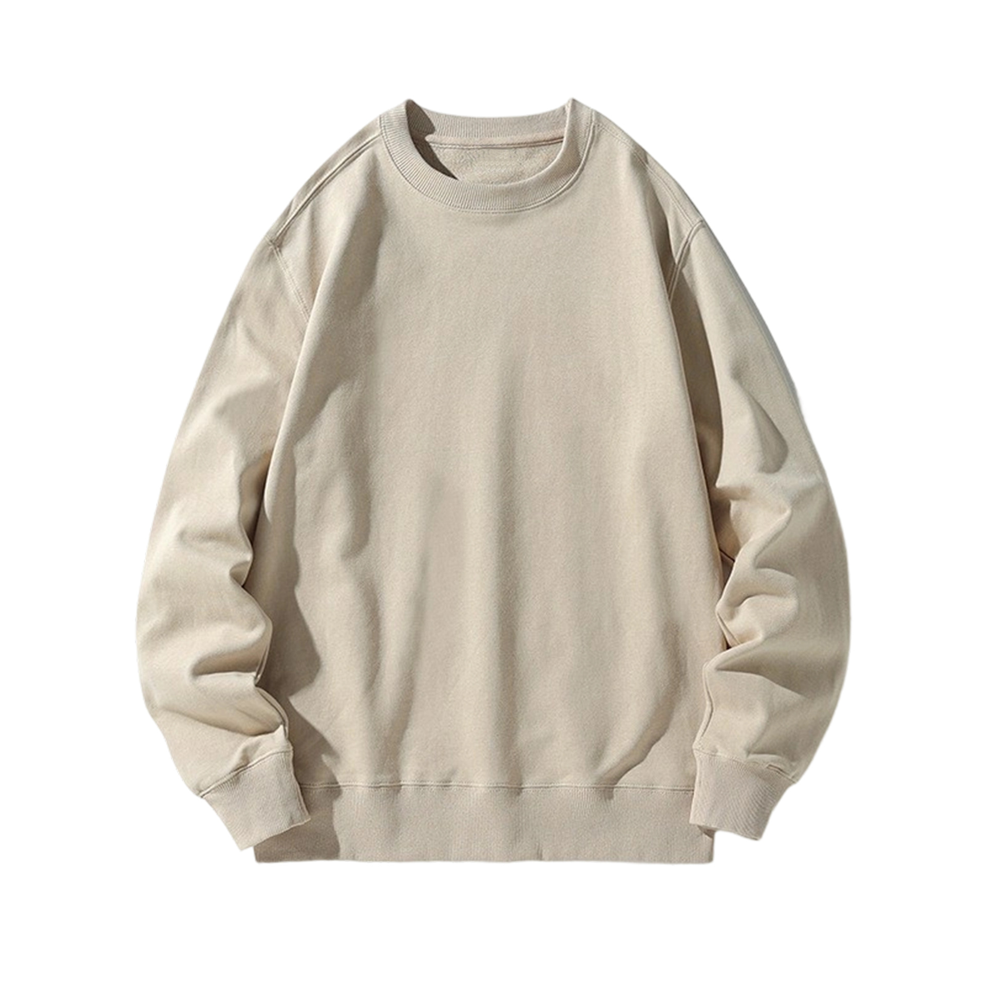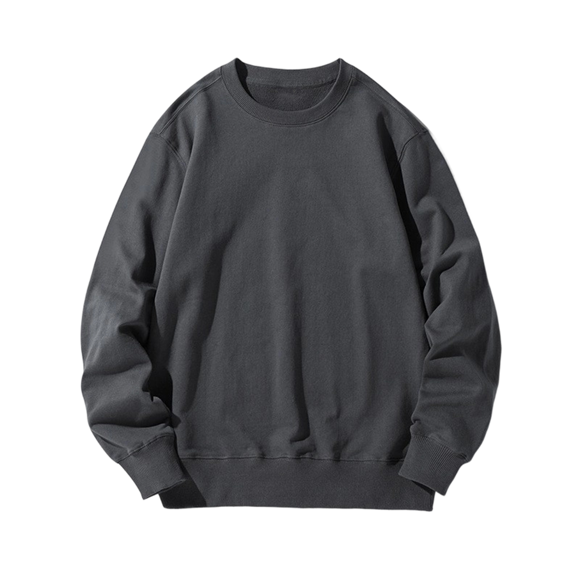 오른쪽 어깨 부분에 테리 원단의 라운드넥 스웨트셔츠, 순면 긴팔 교복/작업복, 무지 단색, 로고 인쇄/자수/직물 프린팅
