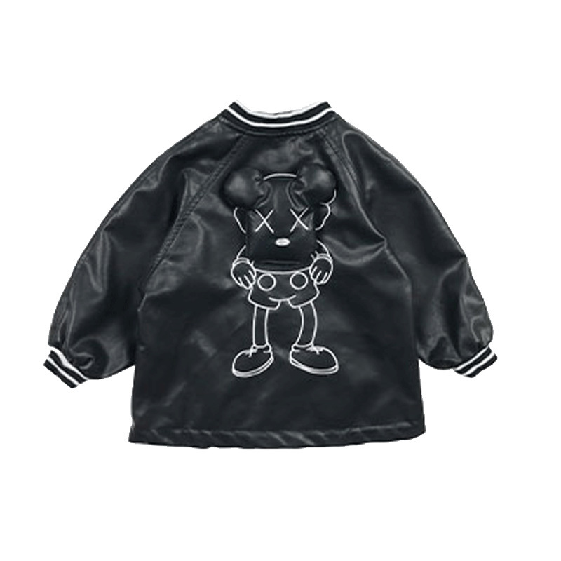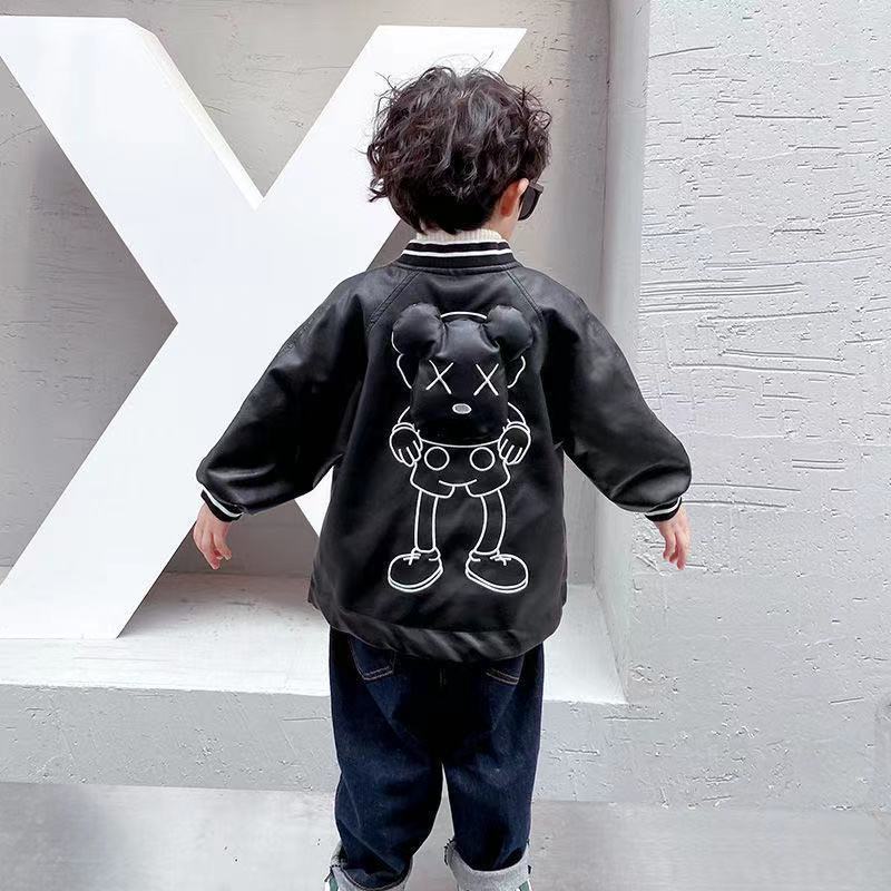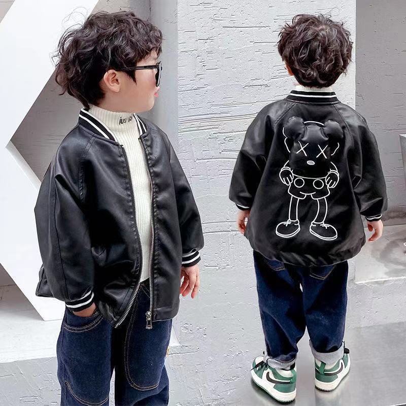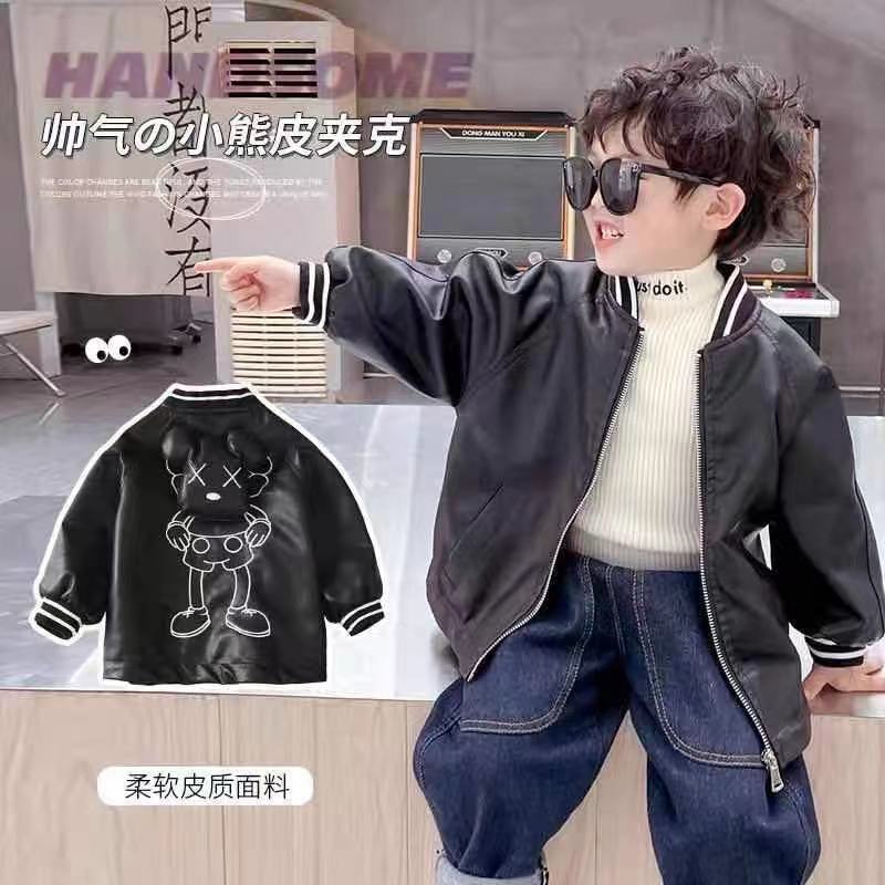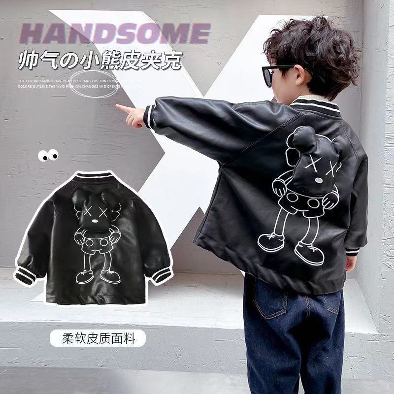 소년 봄 가죽 자켓 2023 새로운 어린이 소년 한국 스타일 세련된 잘 생긴 곰 자전거 가죽 자켓