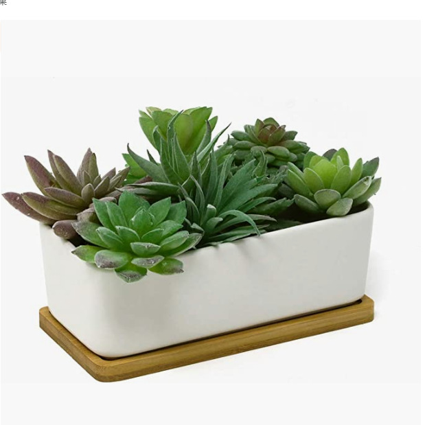 간단한 흰색 창조적 인 흰색 도자기 직사각형 꽃 냄비 세라믹 즙이 많은 식물 꽃 냄비 대나무 트레이 조합 세트 도매스토어 가기