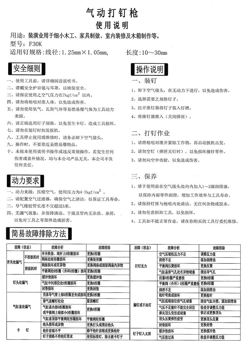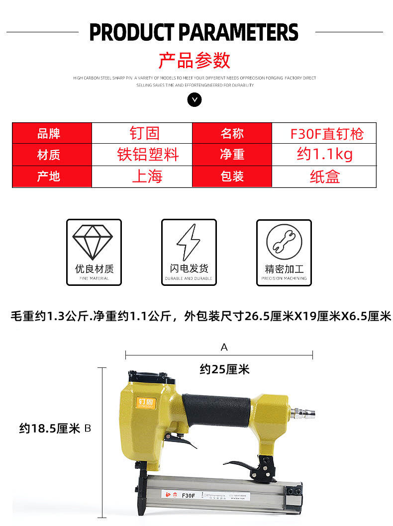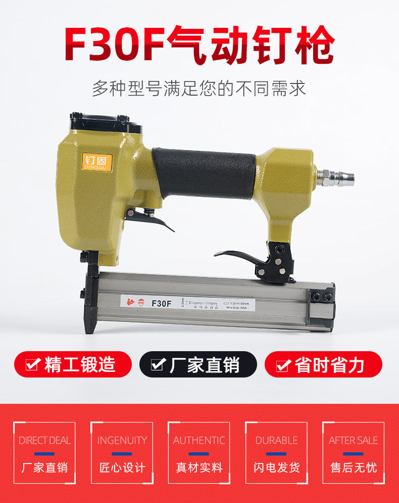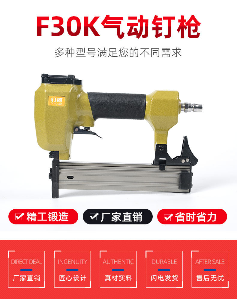 此产品为F30K F30T直钉枪,需要配备空压机 气管 接头 才可使用,可以用直钉型号为F05 F08 F10 F12 F15 F18 F20 F25 F28 F30, 其他不适用,