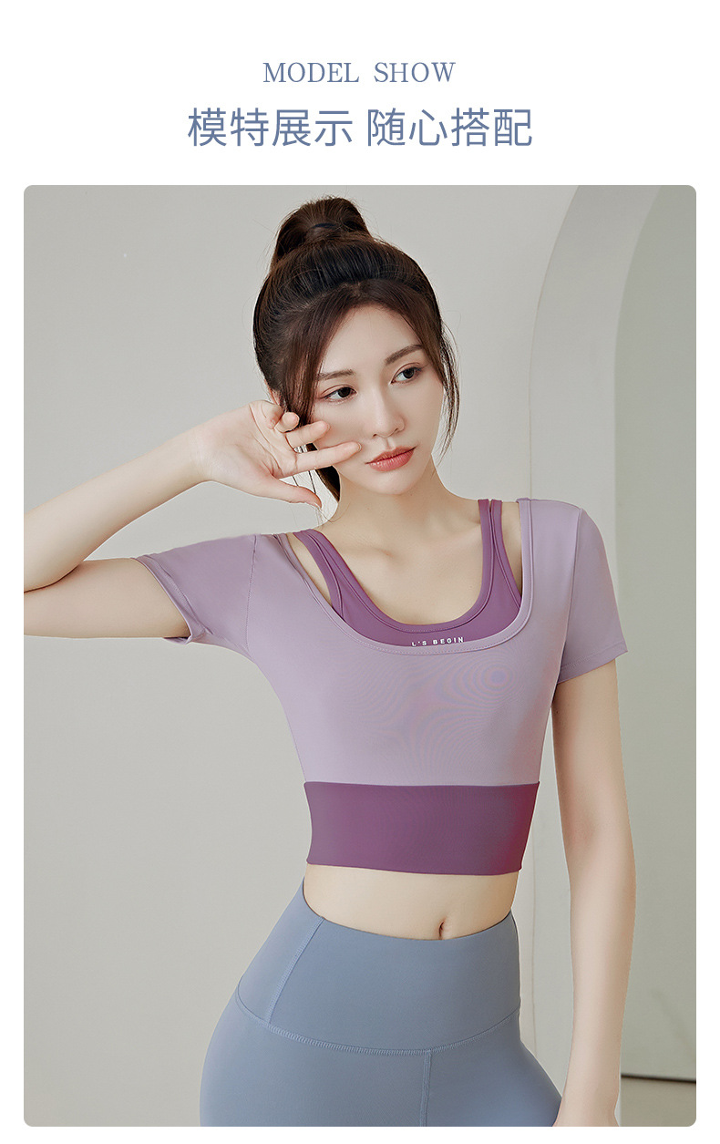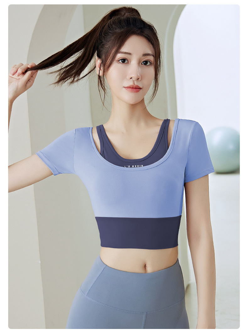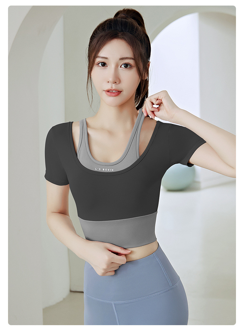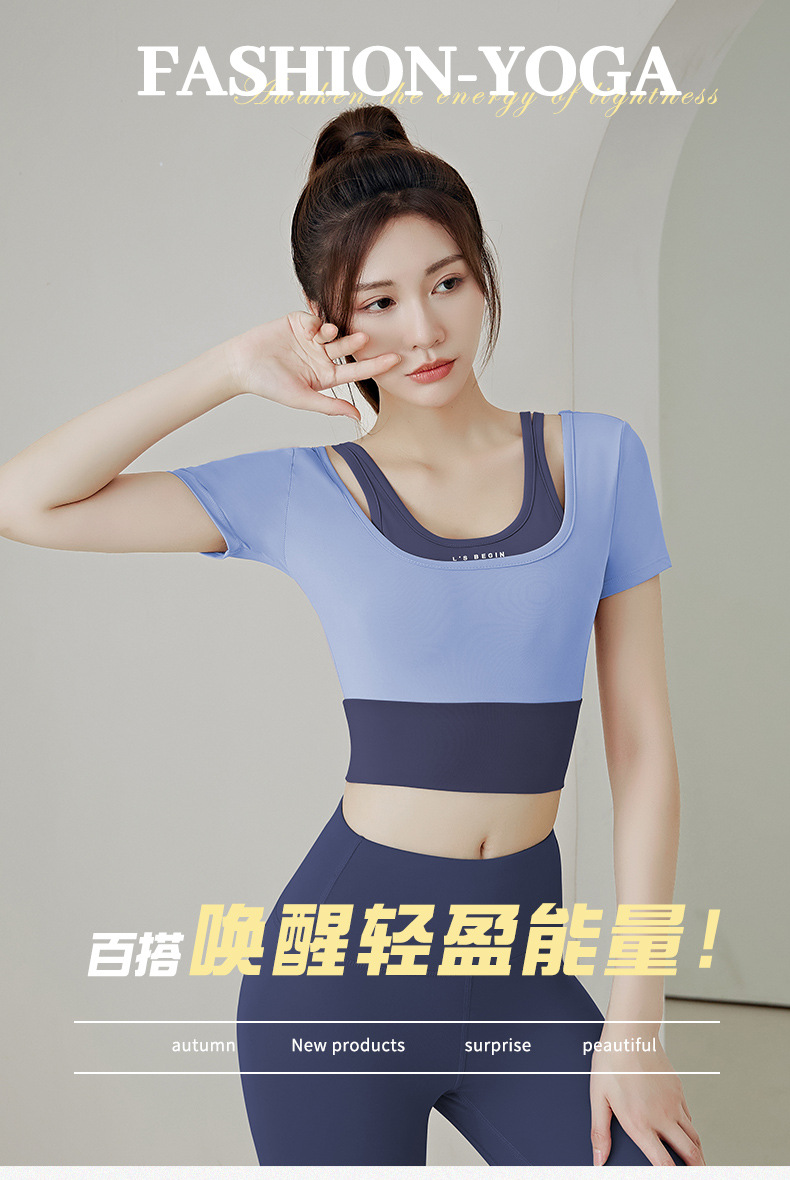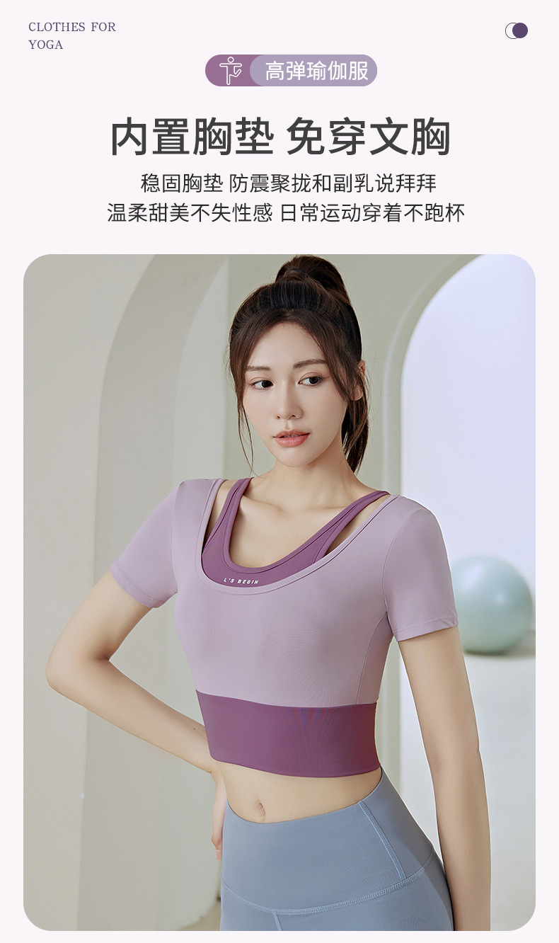 Juyitang 여성 러닝 피트니스 반팔 스포츠 탑, 가슴 패드 슬리밍 알몸 타이트 슬림 세트 요가 세트