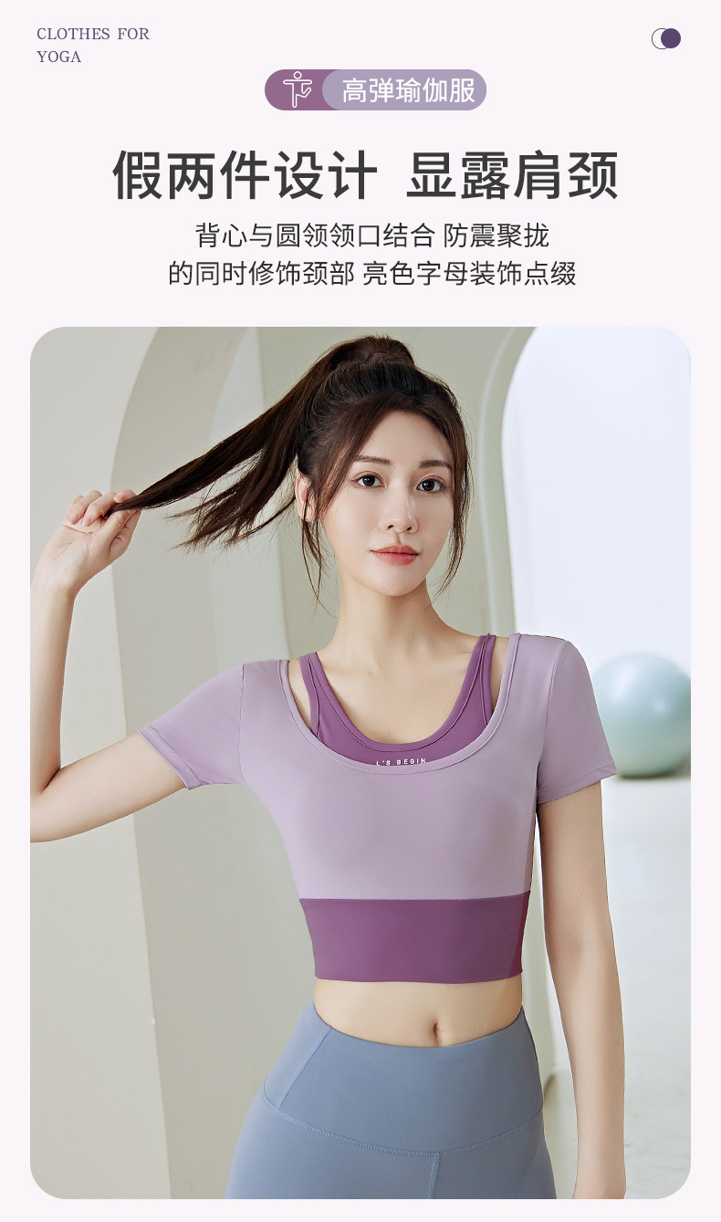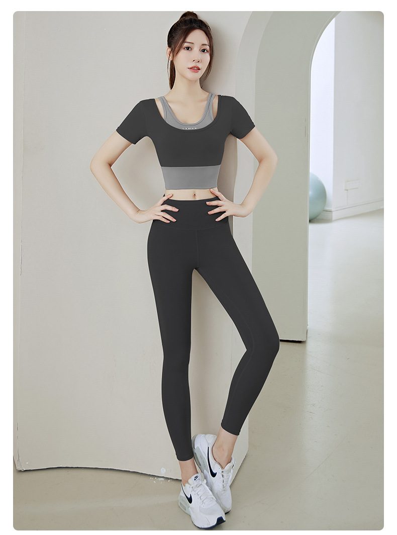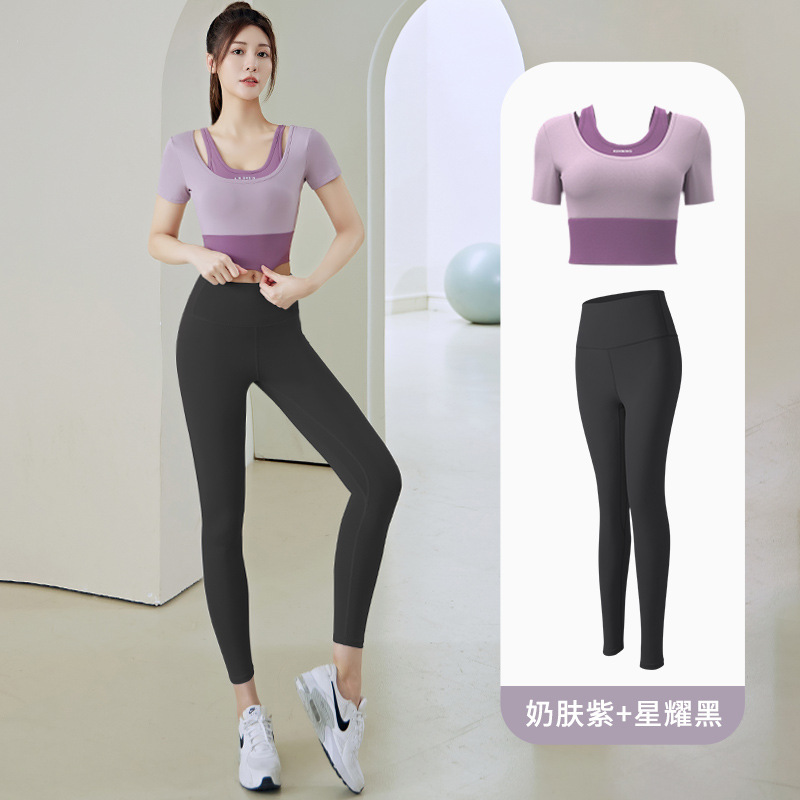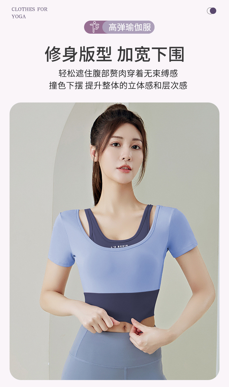 Juyitang 여성 러닝 피트니스 반팔 스포츠 탑, 가슴 패드 슬리밍 알몸 타이트 슬림 세트 요가 세트