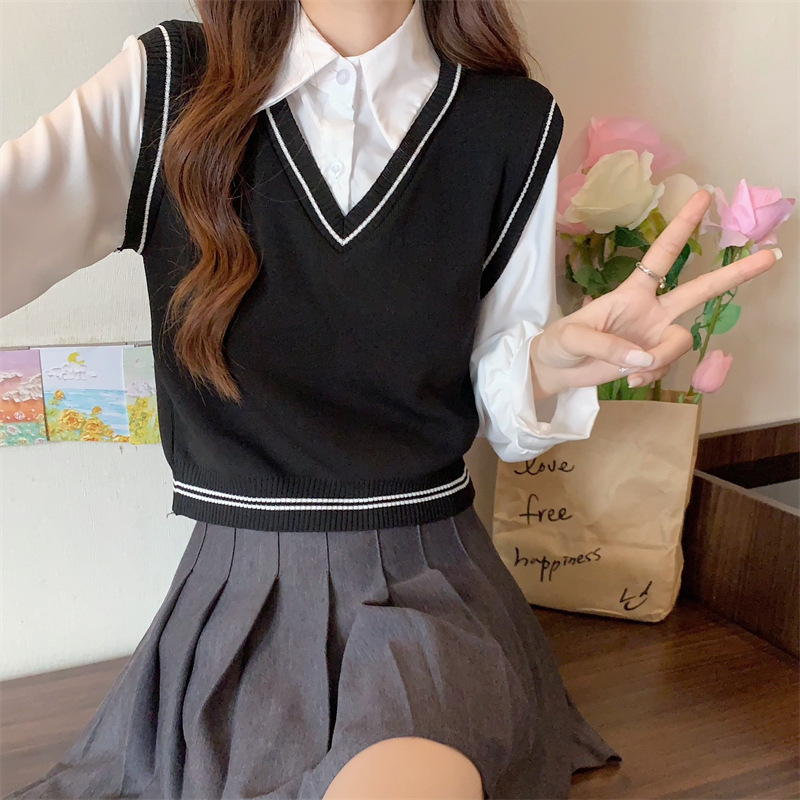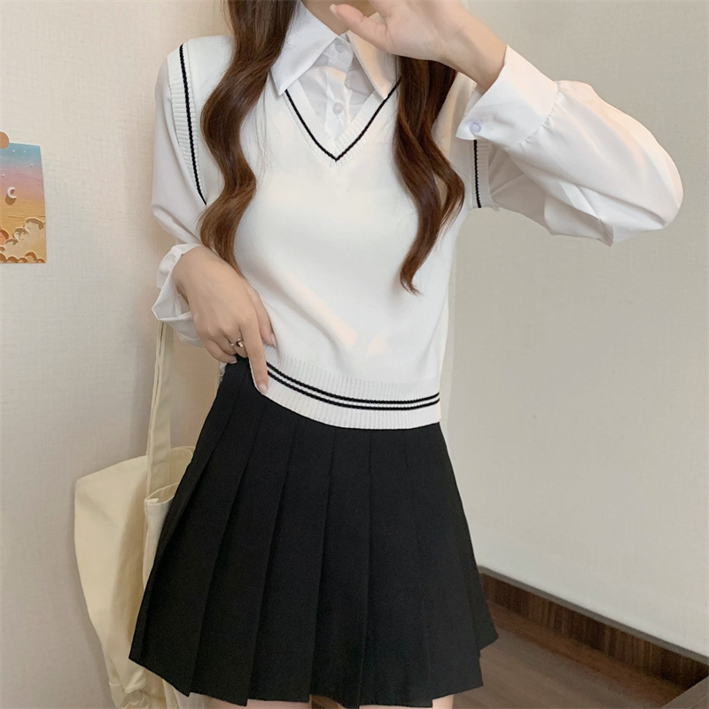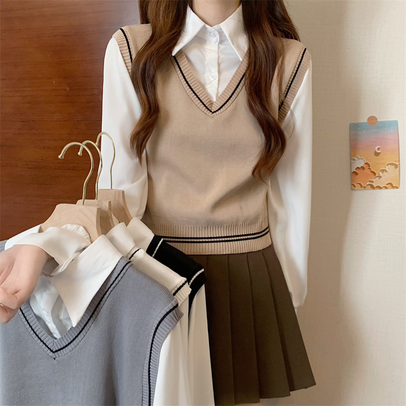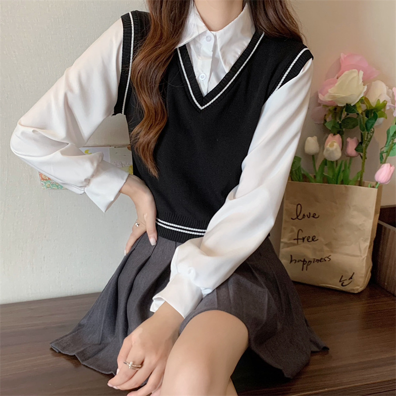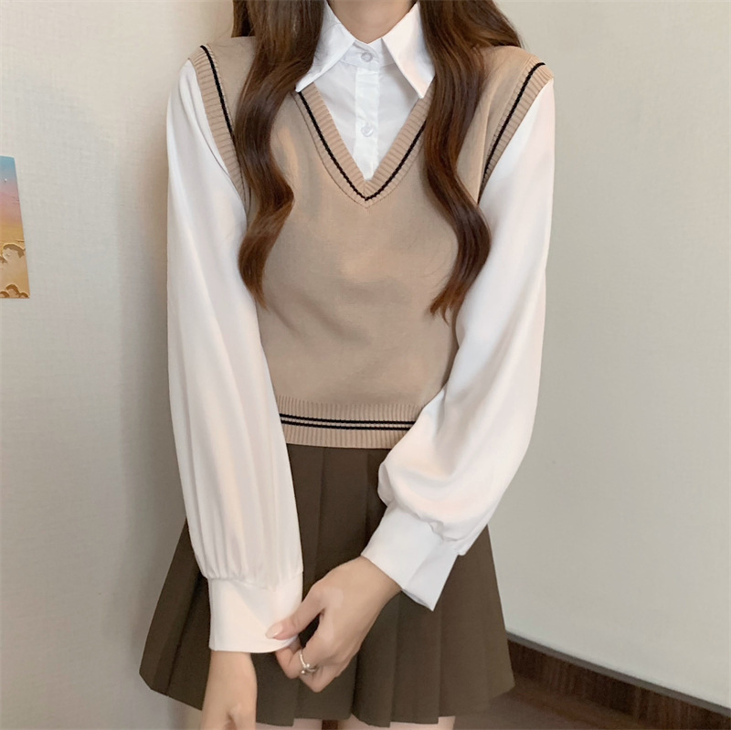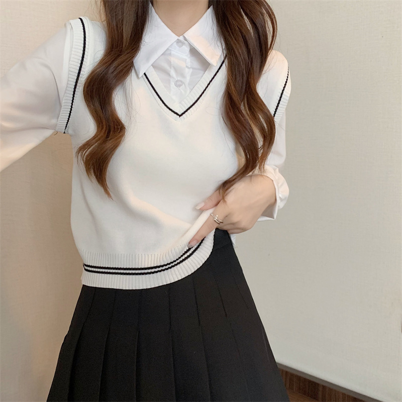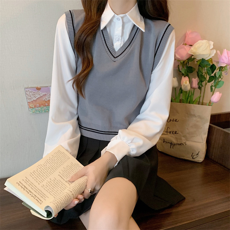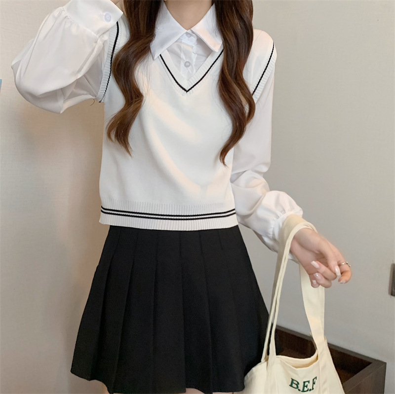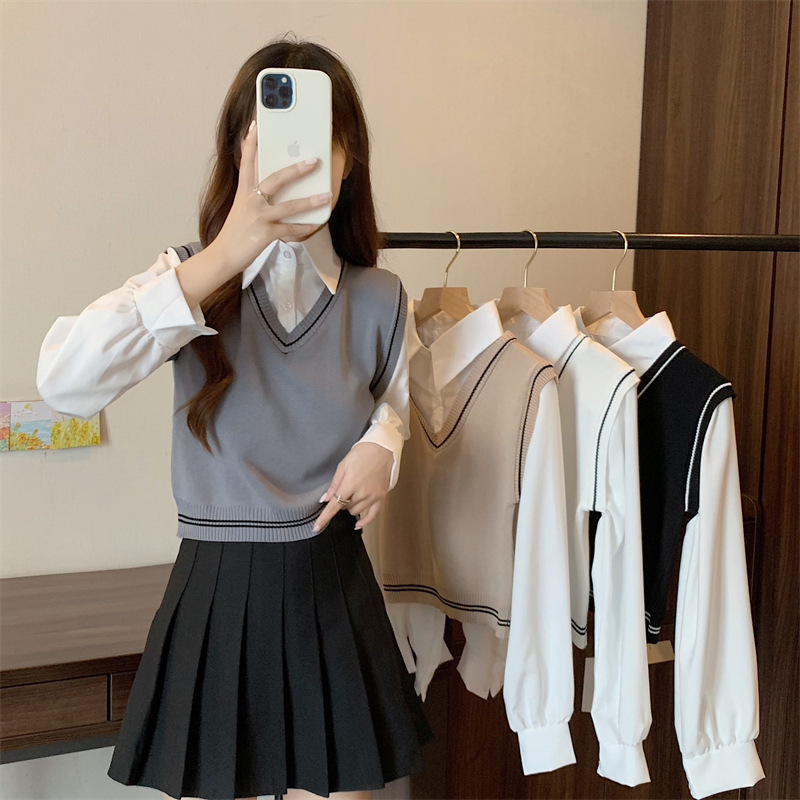 가짜 투피스 니트 스티치 폴로 칼라 셔츠 2022 가을 한국 스타일 조끼 디자인 감각 대학 스타일 긴 소매 탑