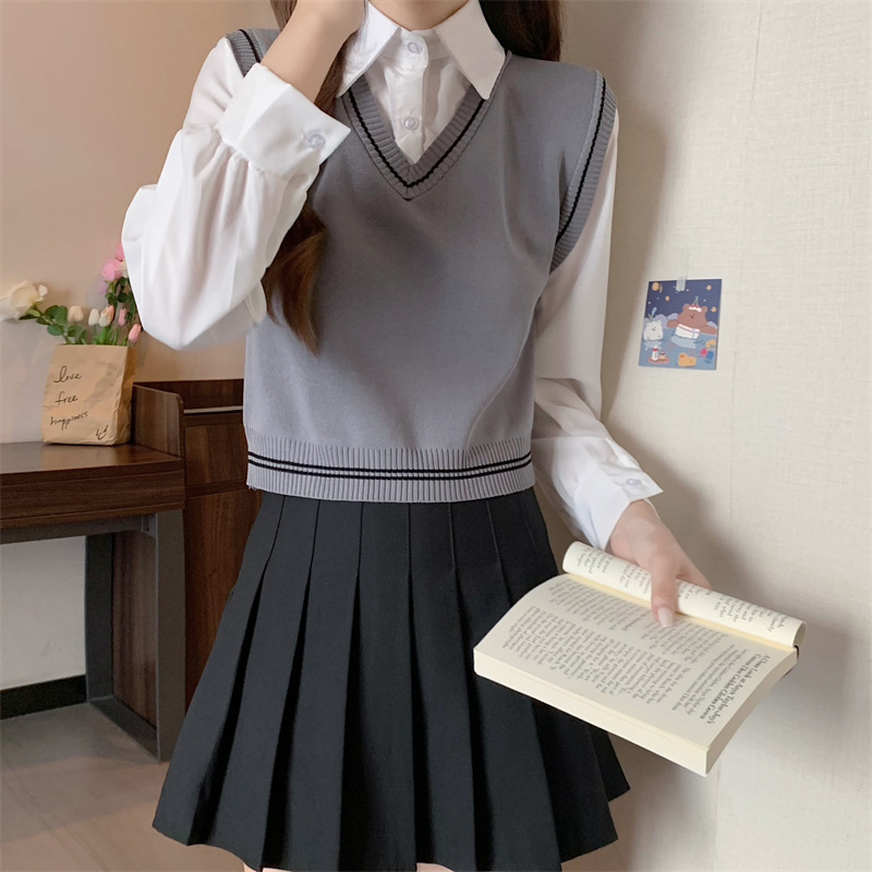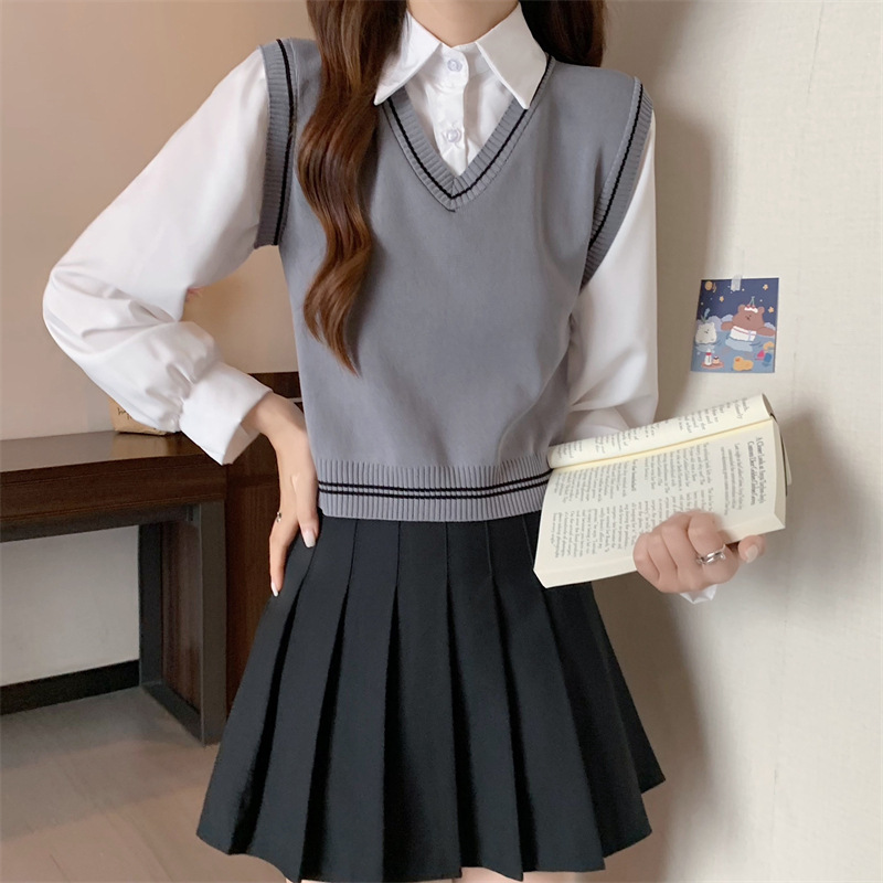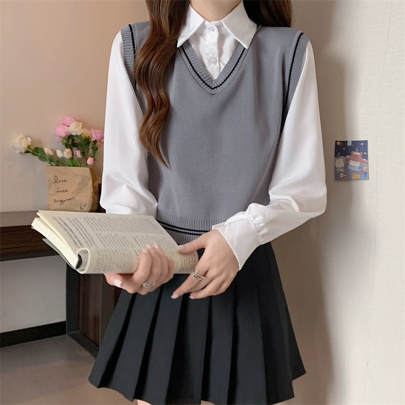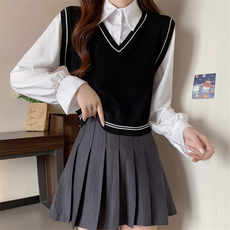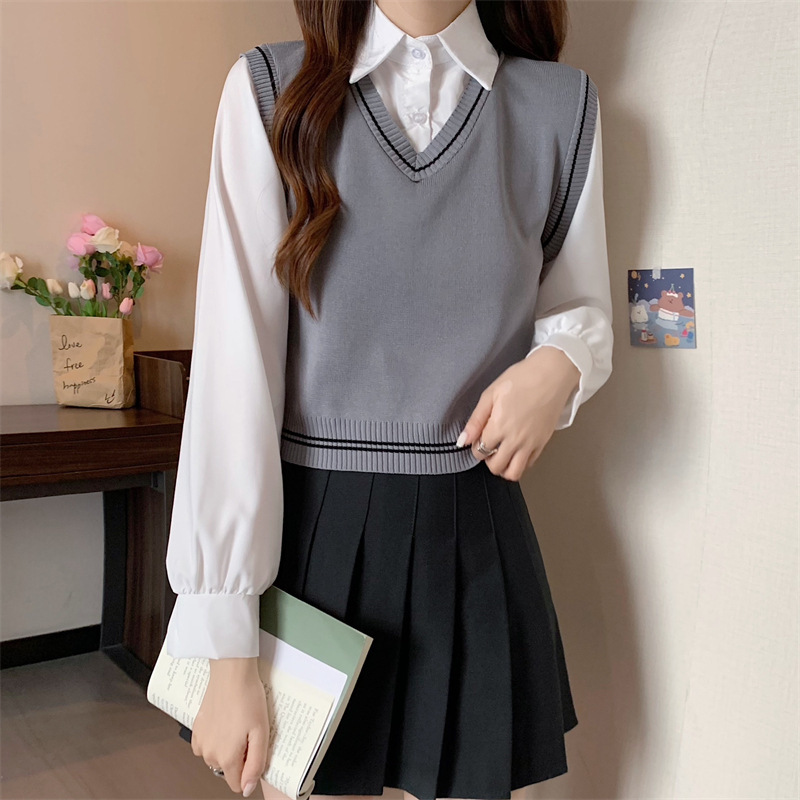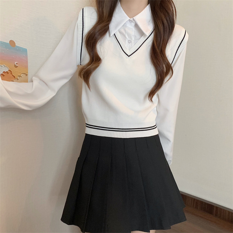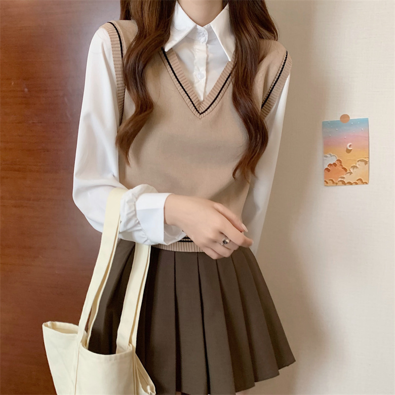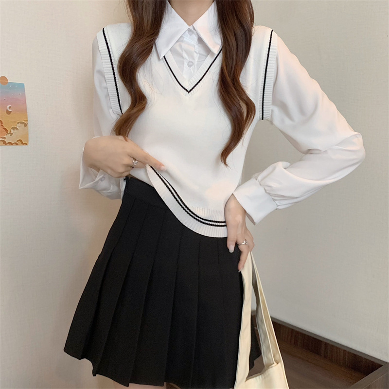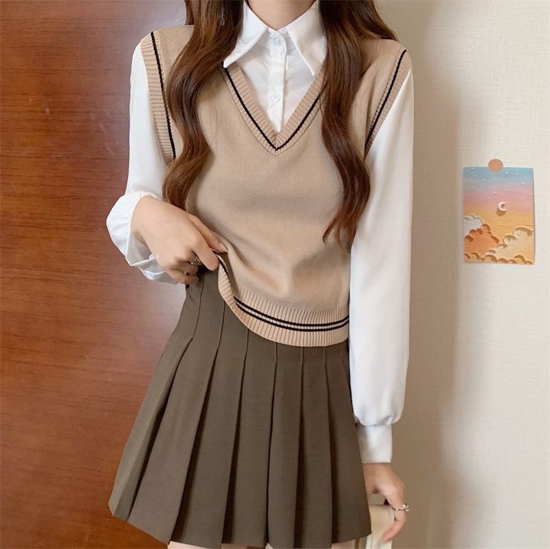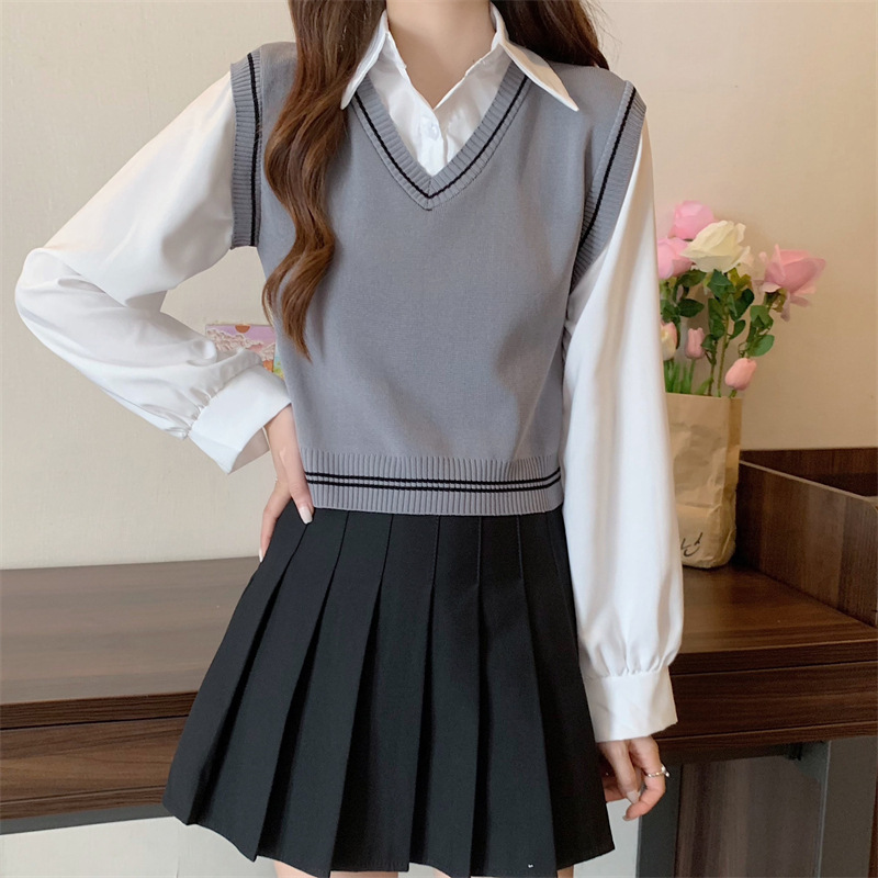 가짜 투피스 니트 스티치 폴로 칼라 셔츠 2022 가을 한국 스타일 조끼 디자인 감각 대학 스타일 긴 소매 탑
