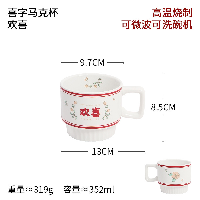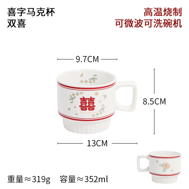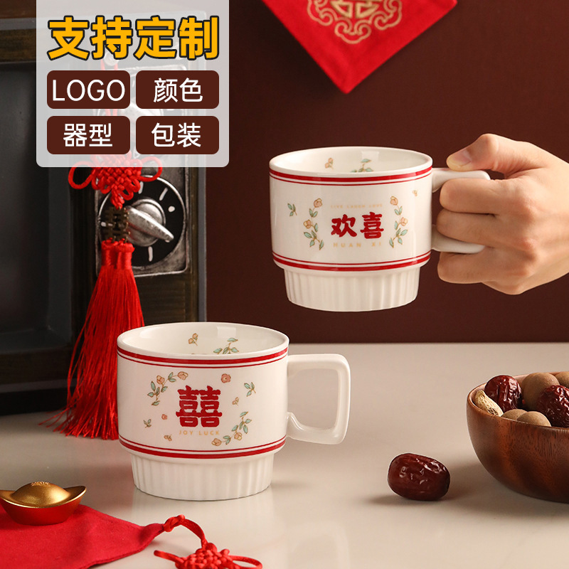 In 중국식 행복한 캐릭터 세라믹 머그 해피 웨딩 핸드 헬드 머그 웨딩 동반 선물 쌓인 머그 세트 통나무