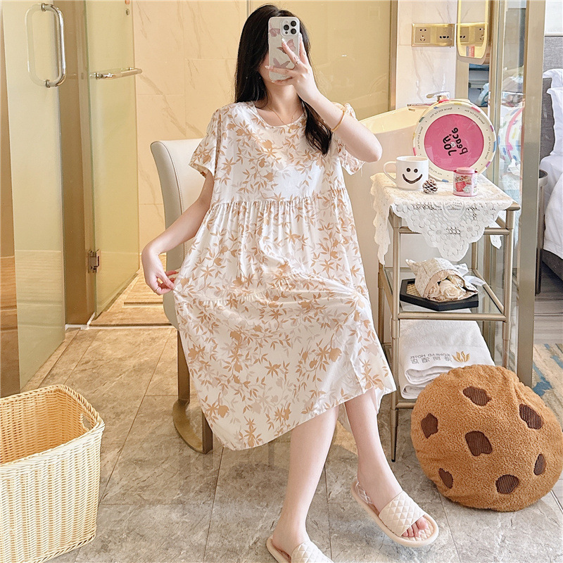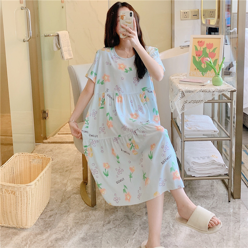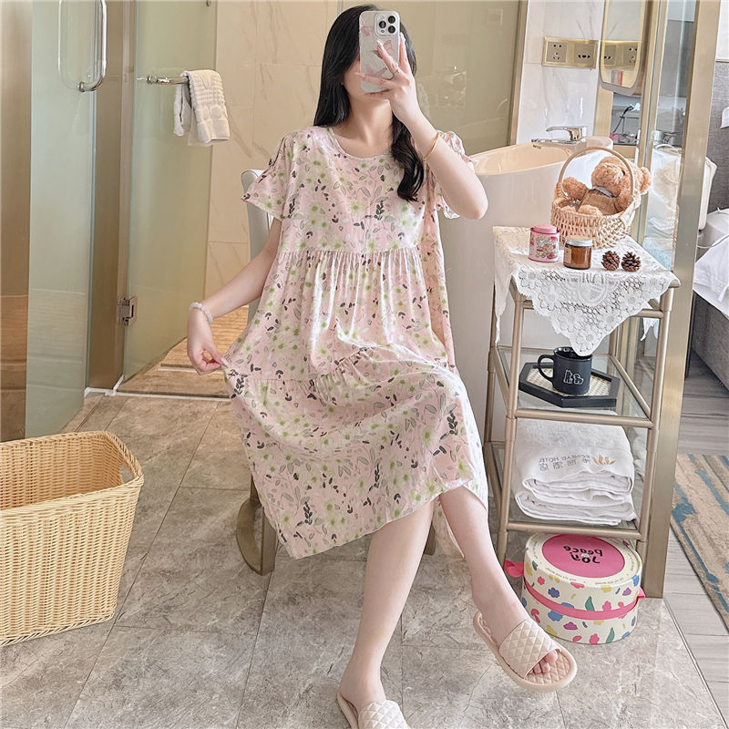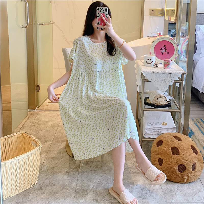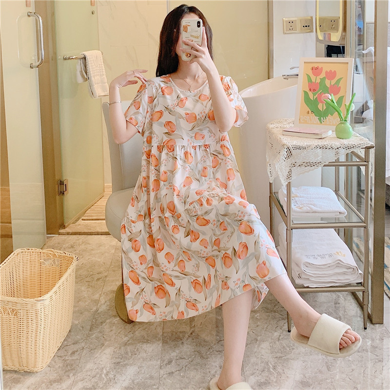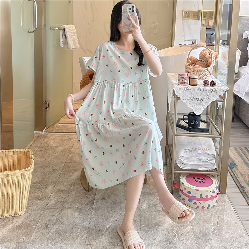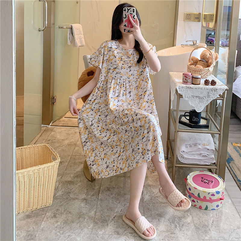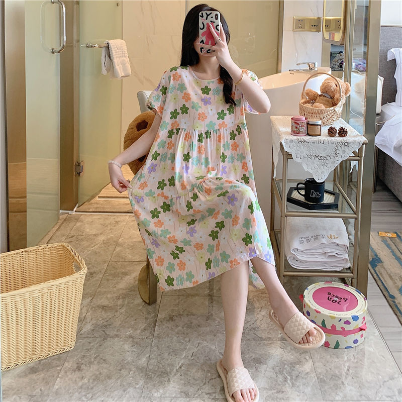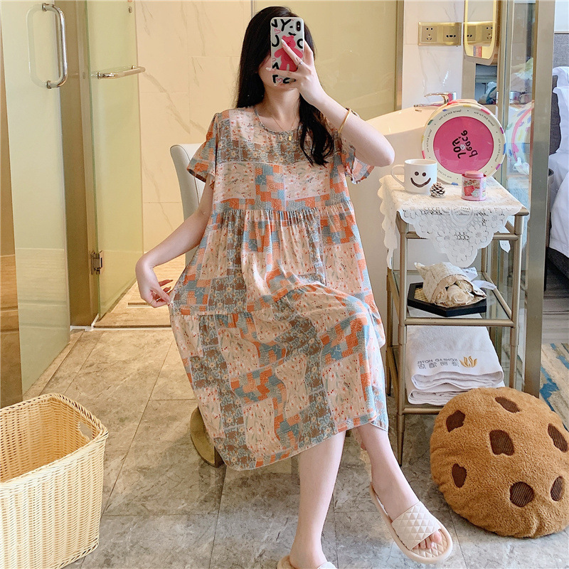 면 실크 나이트 가운 여성의 봄과 가을 캐주얼 반팔 대형 사이즈 인쇄 잠옷 여름 얇은 고급 만지는 면 홈 의류스토어 가기