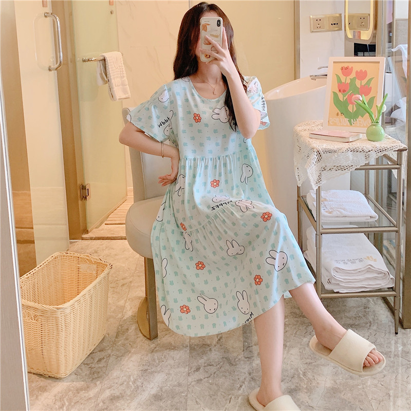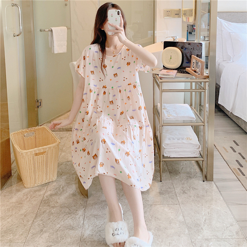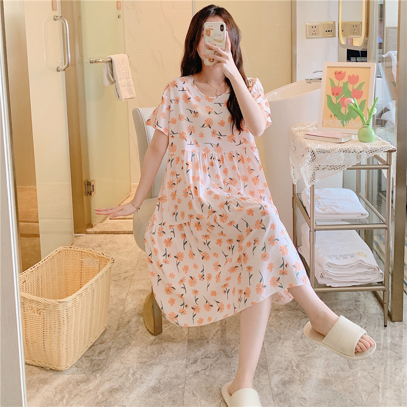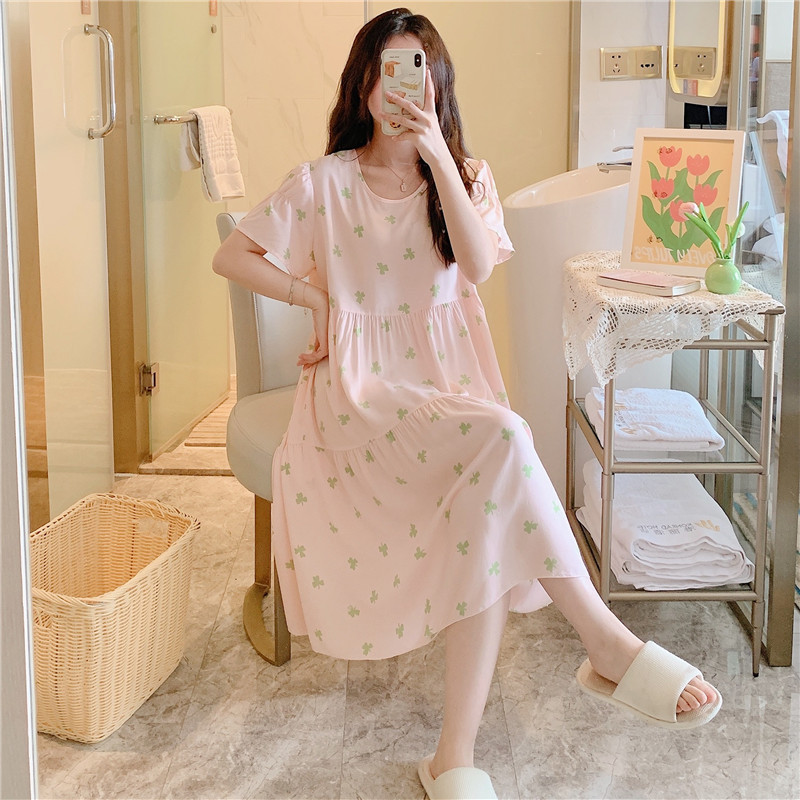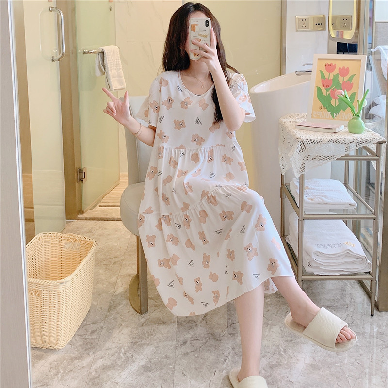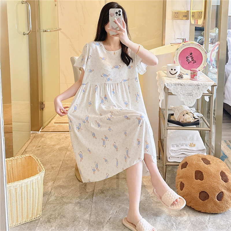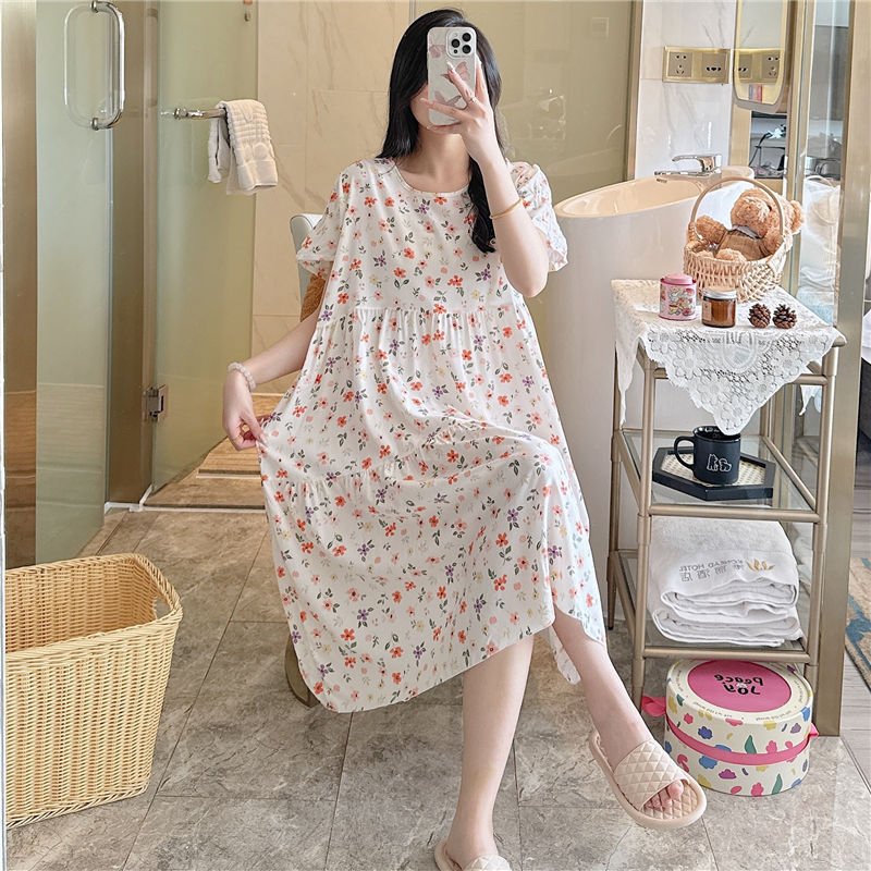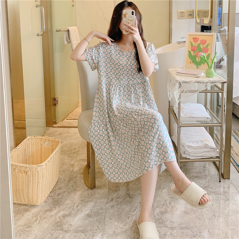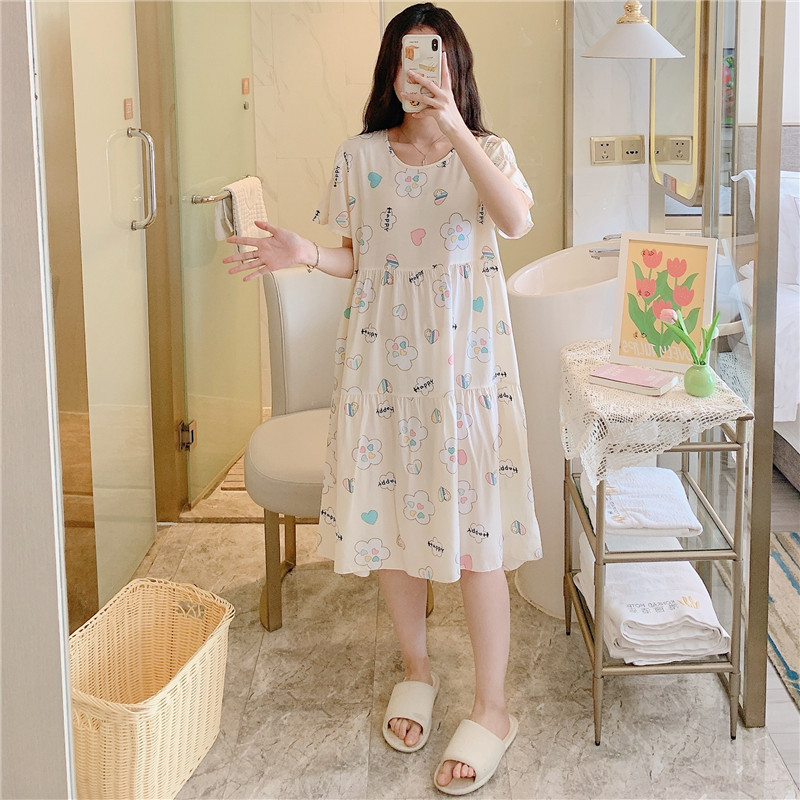 면 실크 나이트 가운 여성의 봄과 가을 캐주얼 반팔 대형 사이즈 인쇄 잠옷 여름 얇은 고급 만지는 면 홈 의류스토어 가기