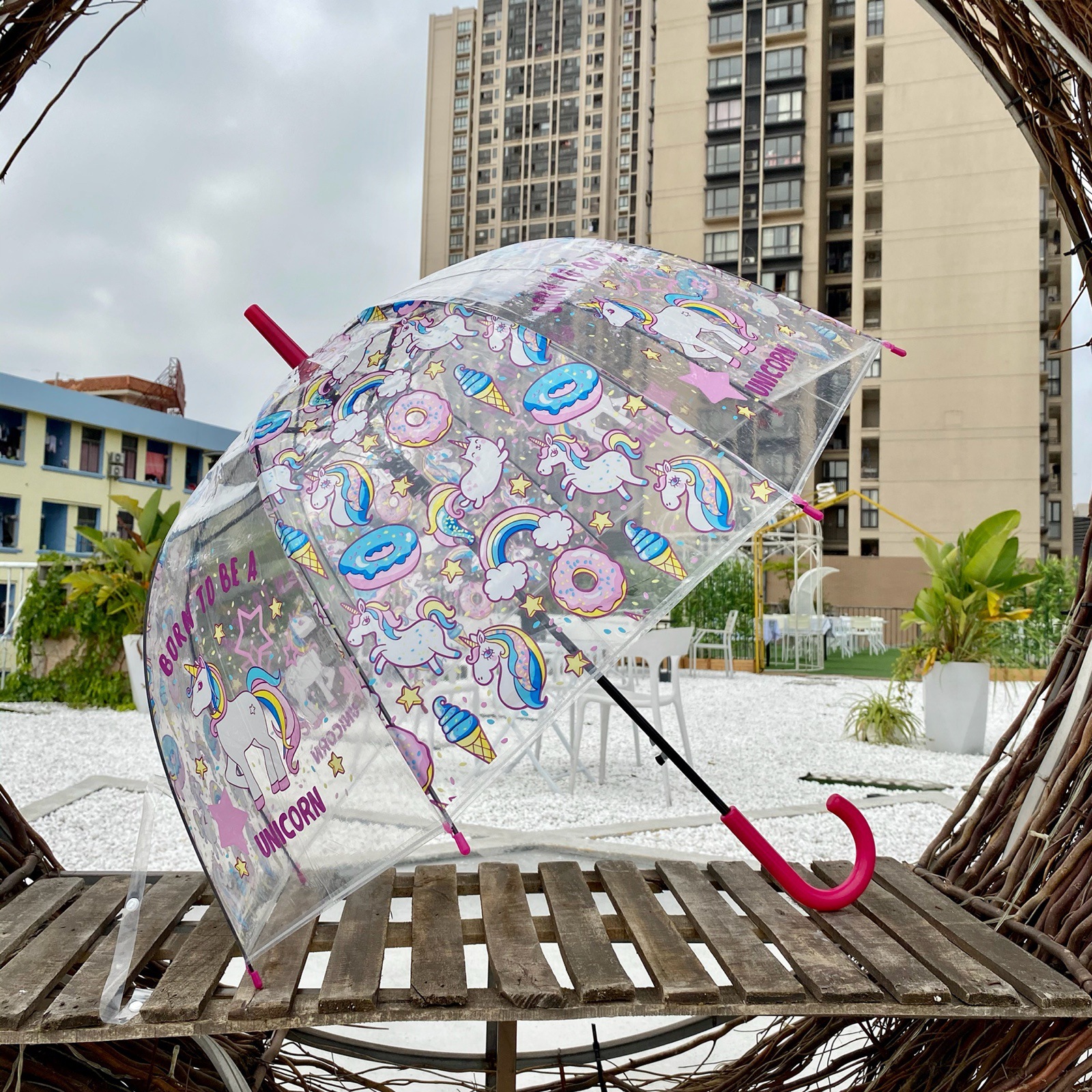 핑크 귀여운 유니콘 투명 우산 어린이 우산 초등학교 소녀 아기 유치원 작은 우산 만화 자동