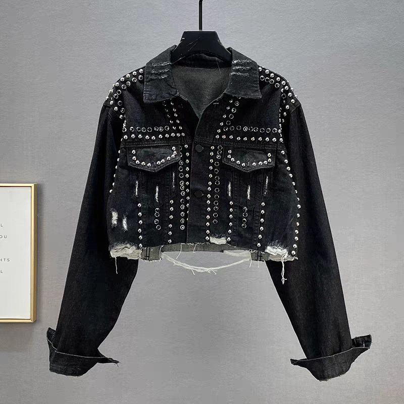 유럽과 미국 새로운 독립 역 대외 무역 중공업 리벳 다이아몬드 데님 코트 여자의 착용 네일 구슬 재킷 탑