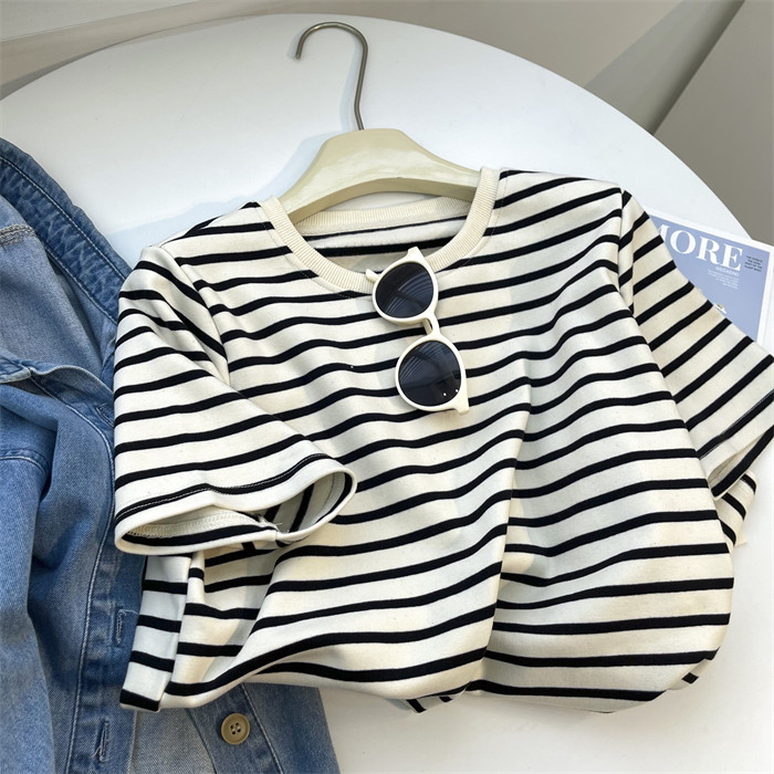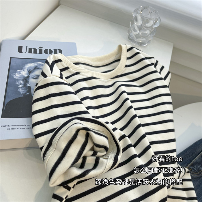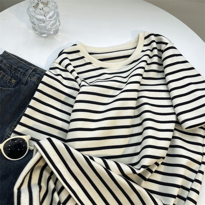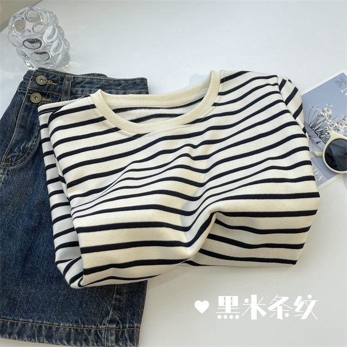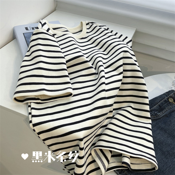 벨벳 안감/벨벳 기모 스트라이프 라운드 넥 반팔 티셔츠 여성용 2025 봄 루즈 베이지 스트라이프 바닥 탑스토어 가기