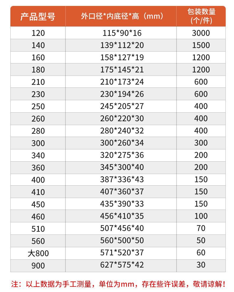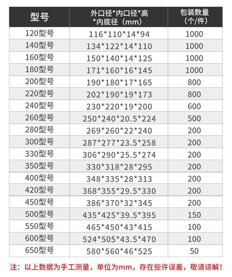 • 160 (내부 바닥 직경 125)1000 조각