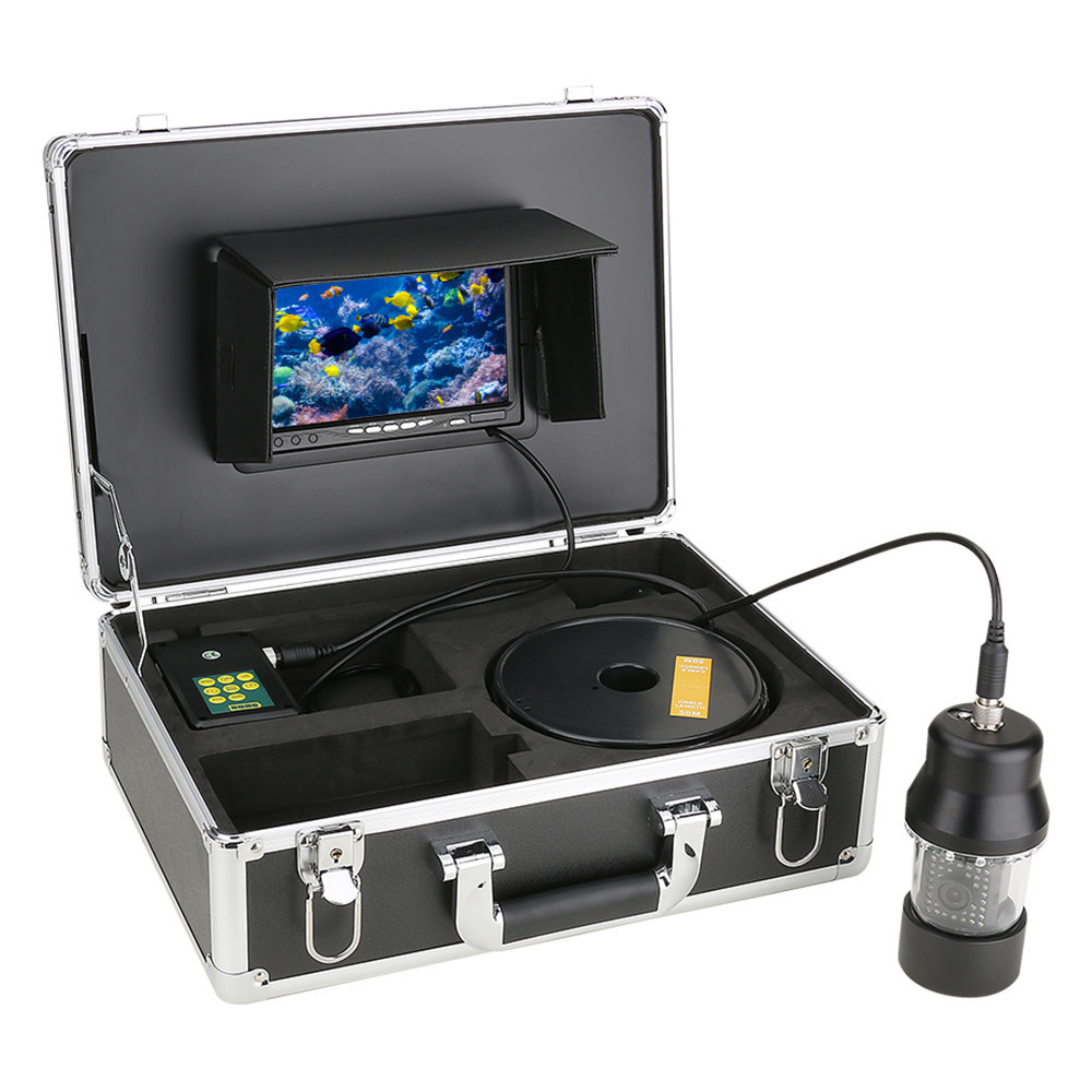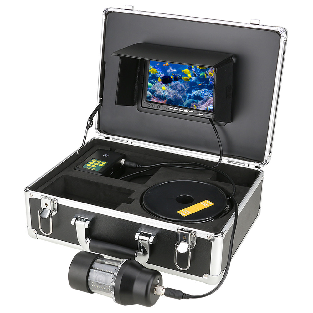 型号:F8200SH-50M 7寸屏 50米360度旋转水下监控系统 5MM电缆 共38颗LED,红外灯18颗白光灯20颗 灯控制状态4种 带电量显示 铝合金黑色 可拆卸接五金接头 带水深水温测量