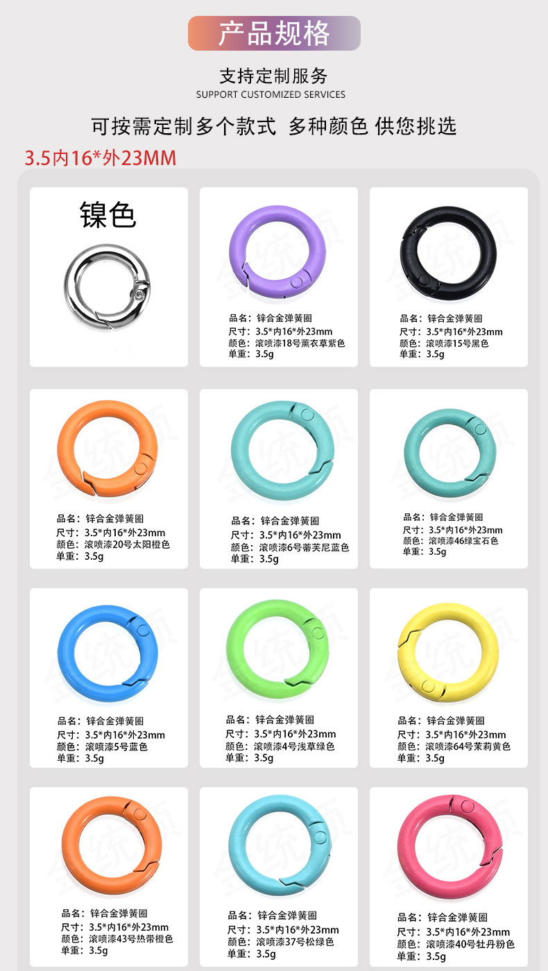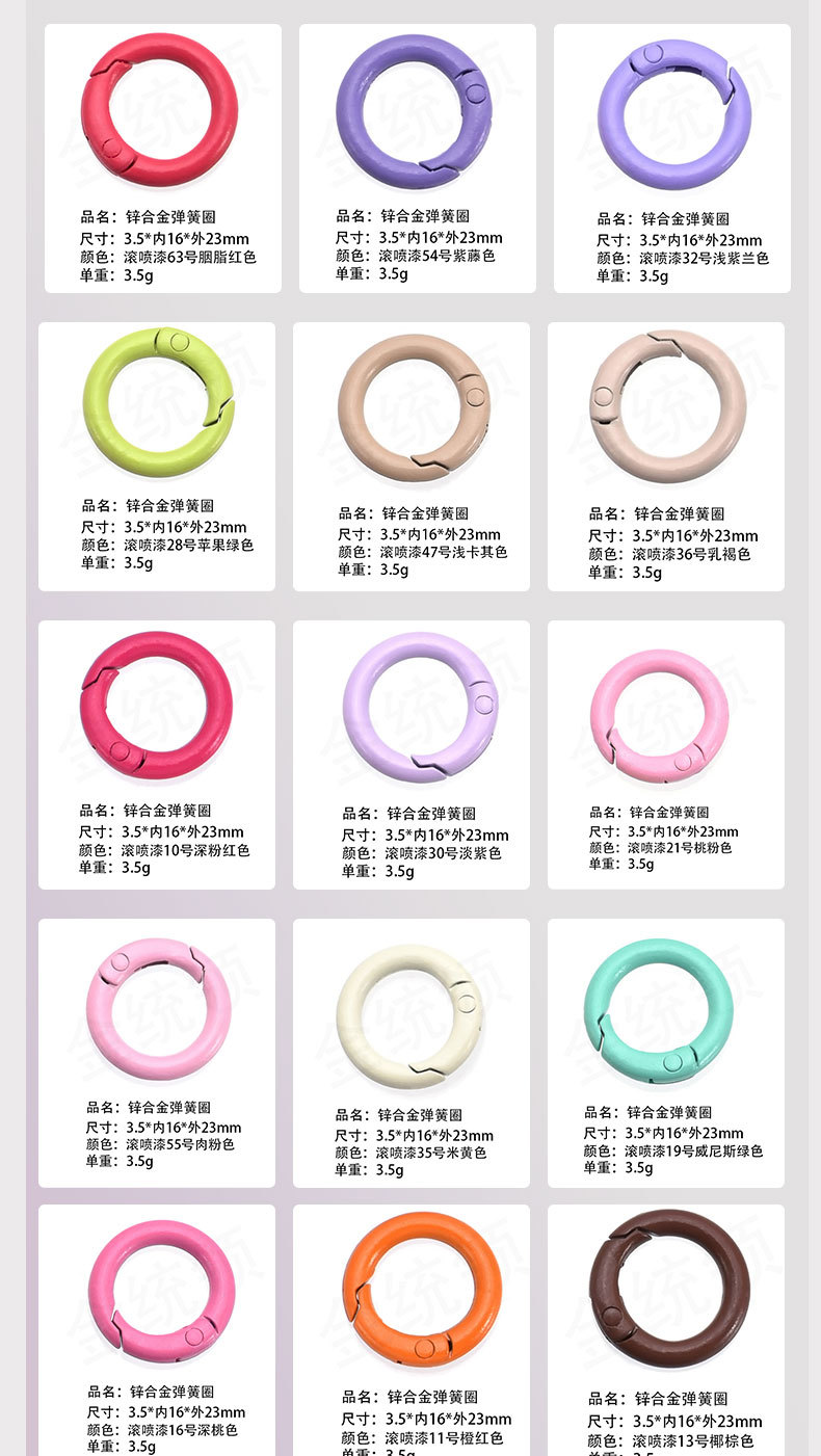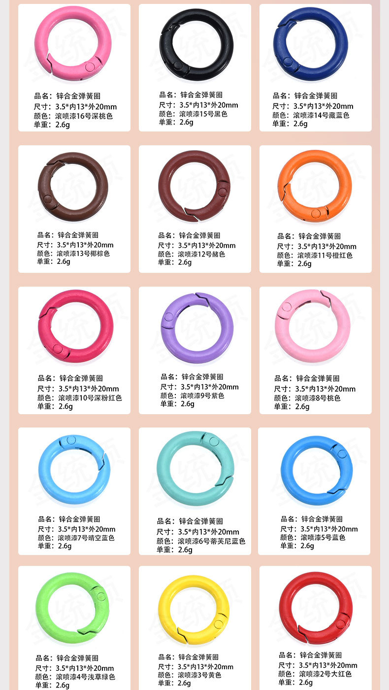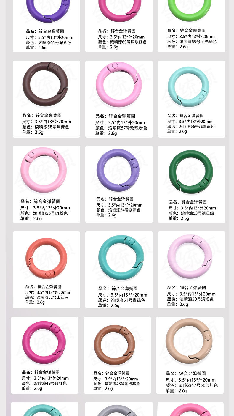 烤漆弹簧圈 彩色弹簧扣 烤漆弹簧扣 彩色开口扣 烤漆开口扣 五金弹簧圈 彩色五金弹簧圈 烤漆五金弹簧圈 金属弹簧圈 彩色金属弹簧圈 锌合金弹簧圈 欧标环保弹簧圈 欧标环保锌合金弹簧圈 环保锌合金弹簧圈