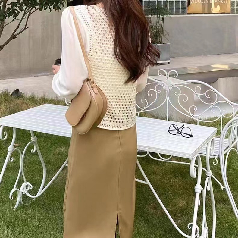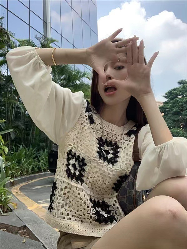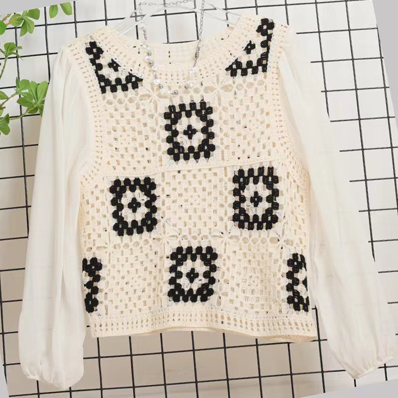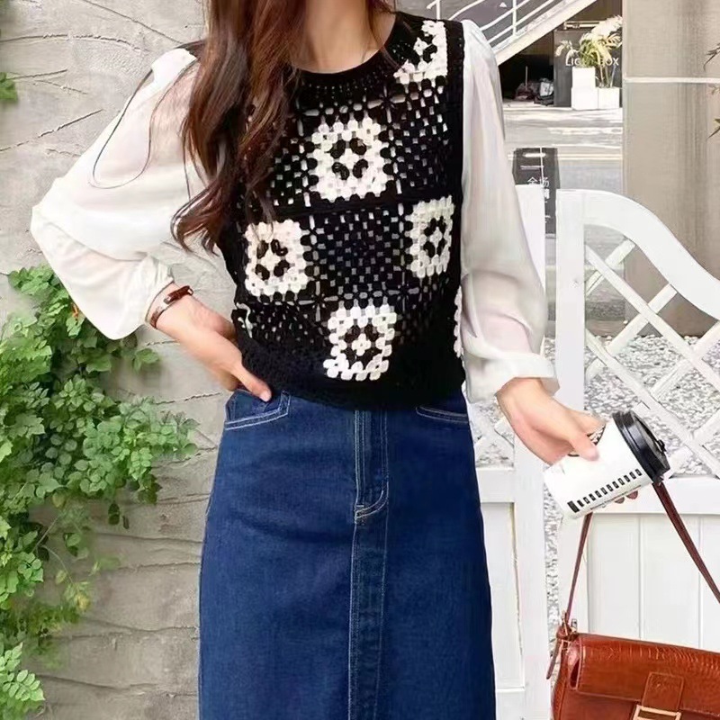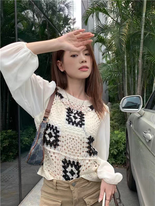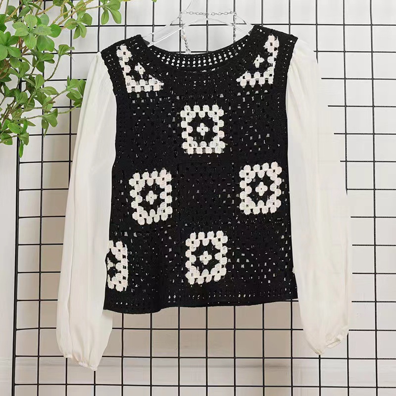 가을 2023 달콤한 크로 셰 뜨개질 중공 니트 쉬폰 셔츠 여성용 가짜 투피스 스택 틈새 디자인 짧은 탑스토어 가기