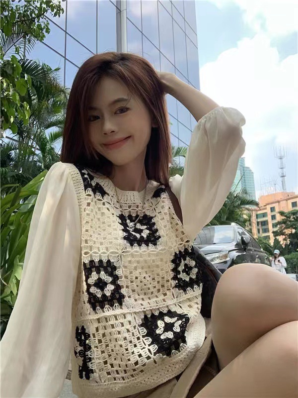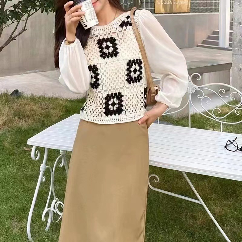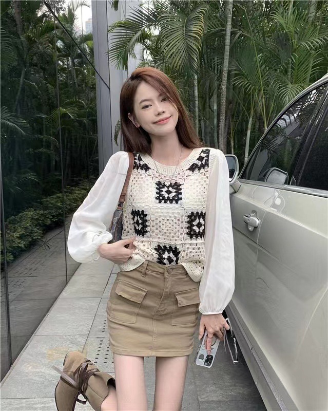 가을 2023 달콤한 크로 셰 뜨개질 중공 니트 쉬폰 셔츠 여성용 가짜 투피스 스택 틈새 디자인 짧은 탑