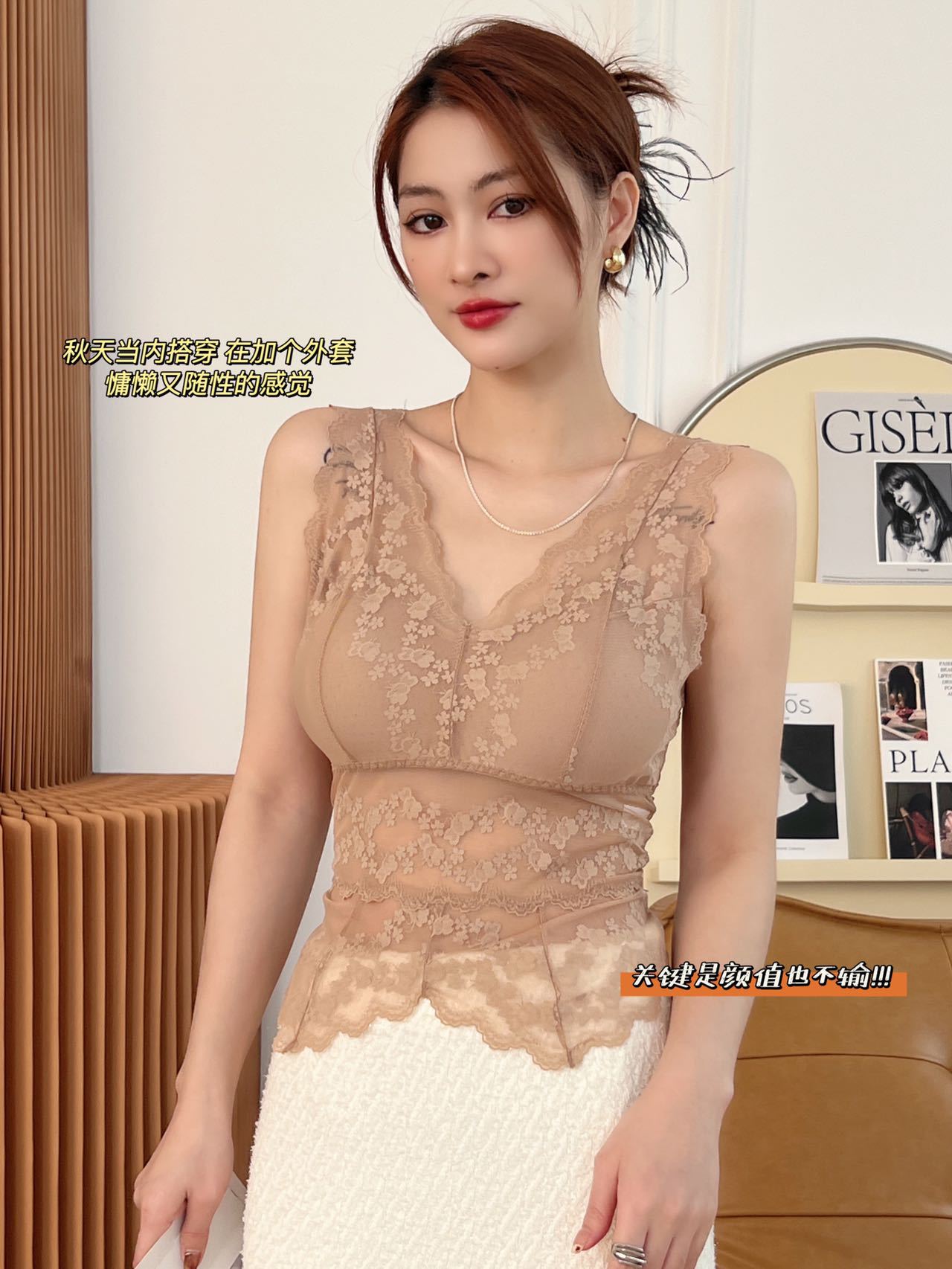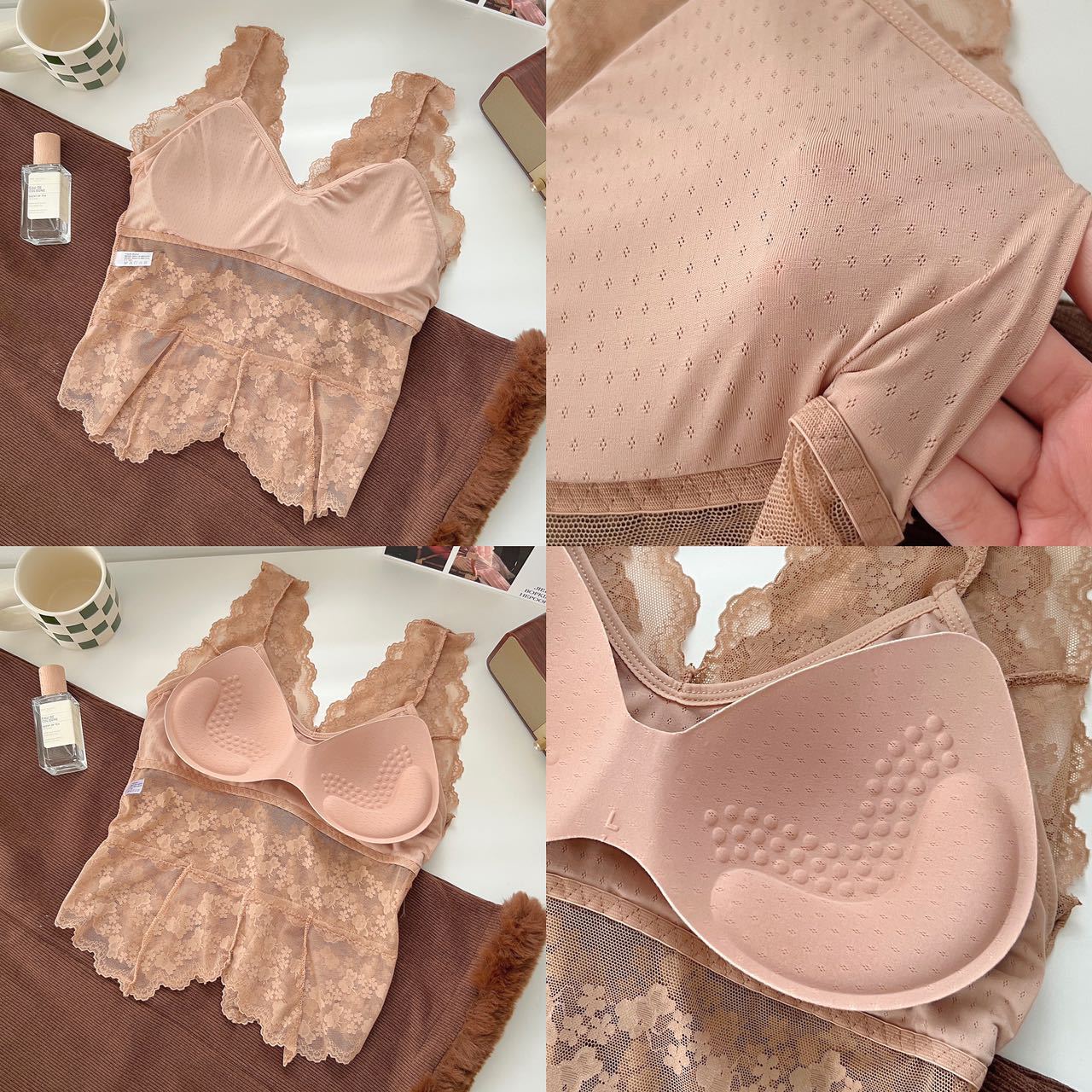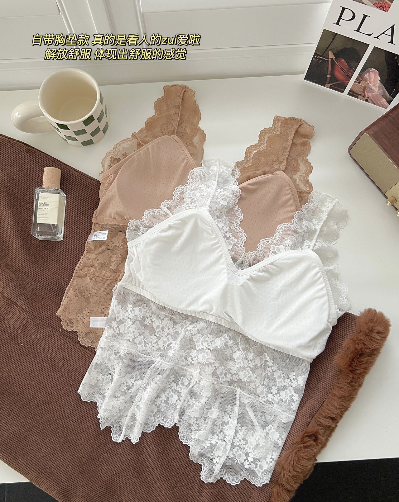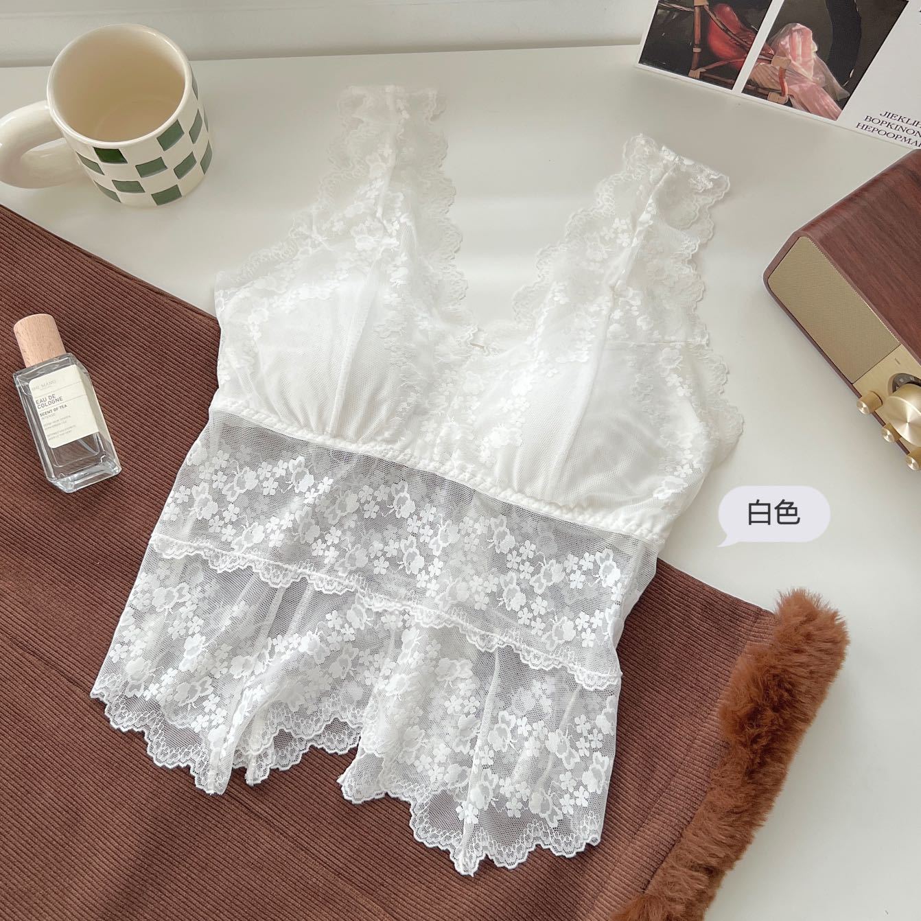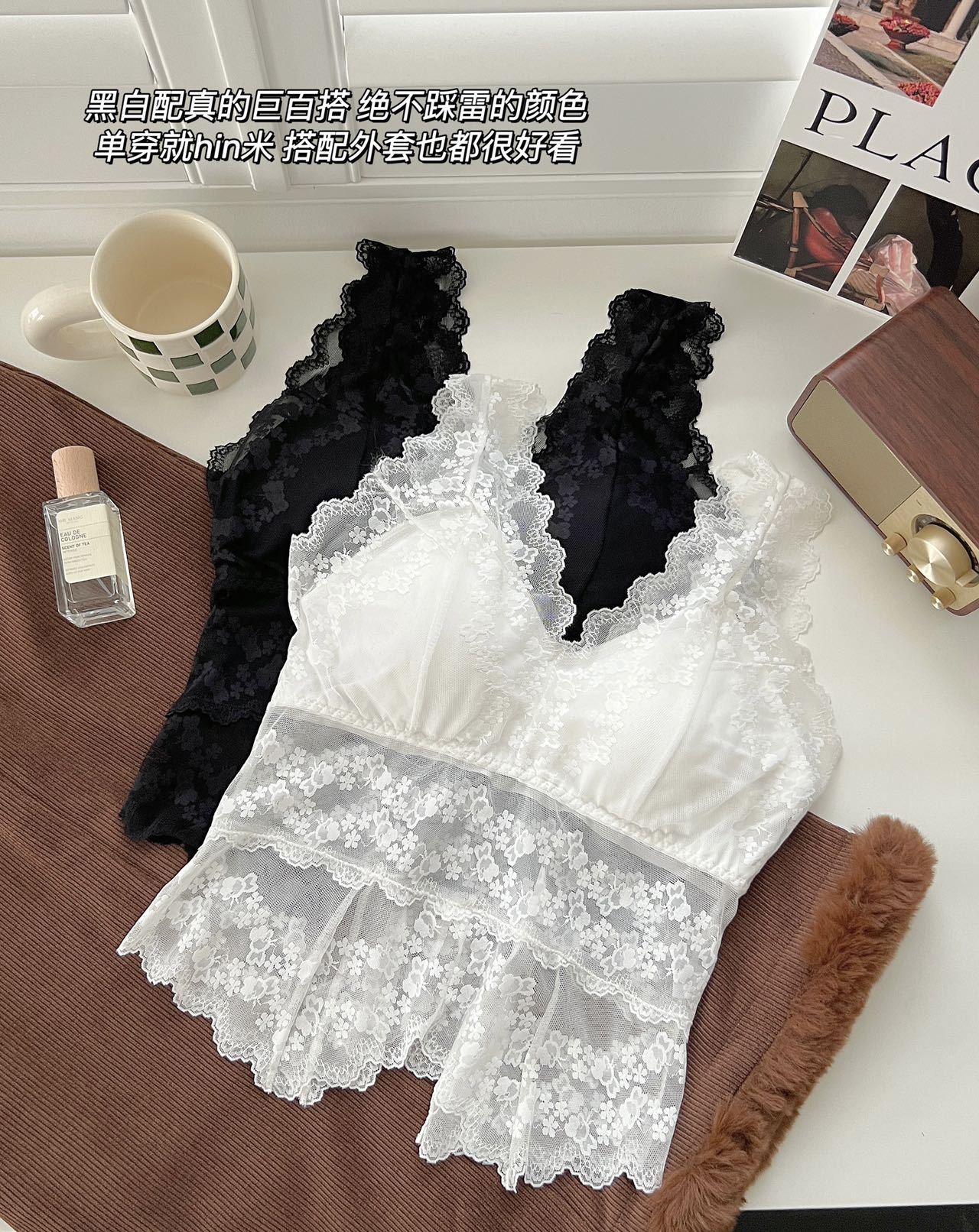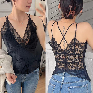 2023년 신상 레이스 백리스 뷔스티에, 가슴 패드 내장, 중간 길이, 다용도 레이스 와이드 숄더 베이스 레이스탑, 통기성 좋음