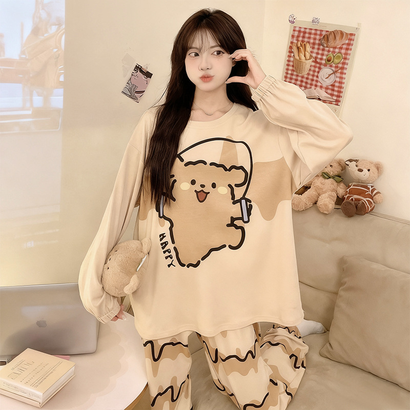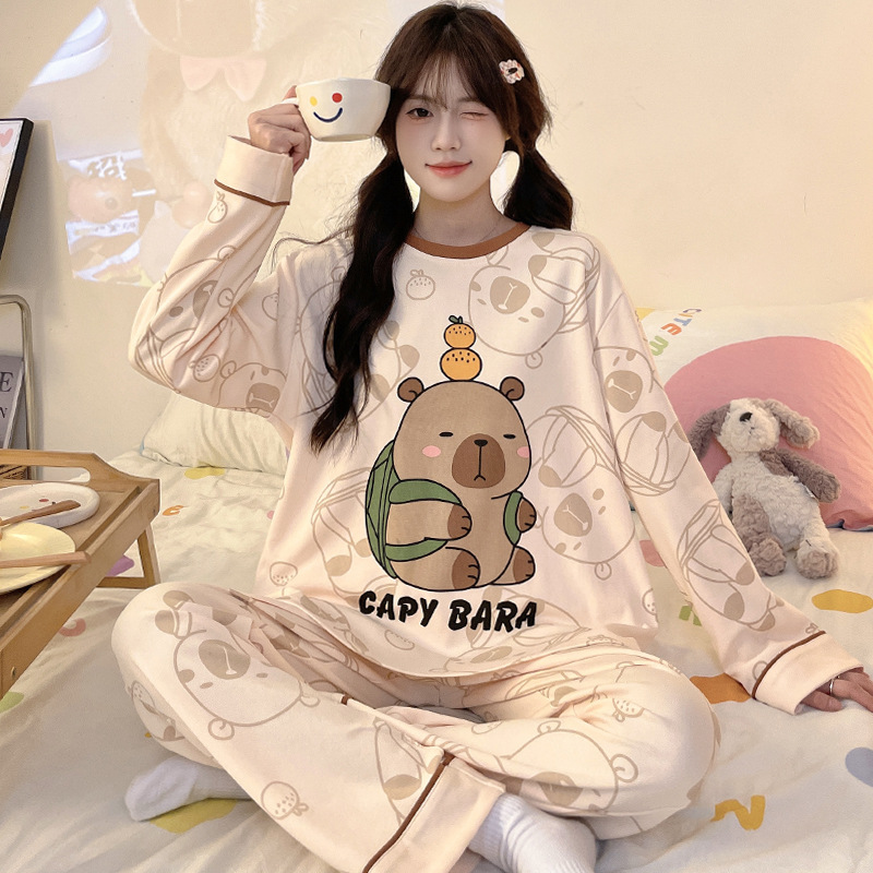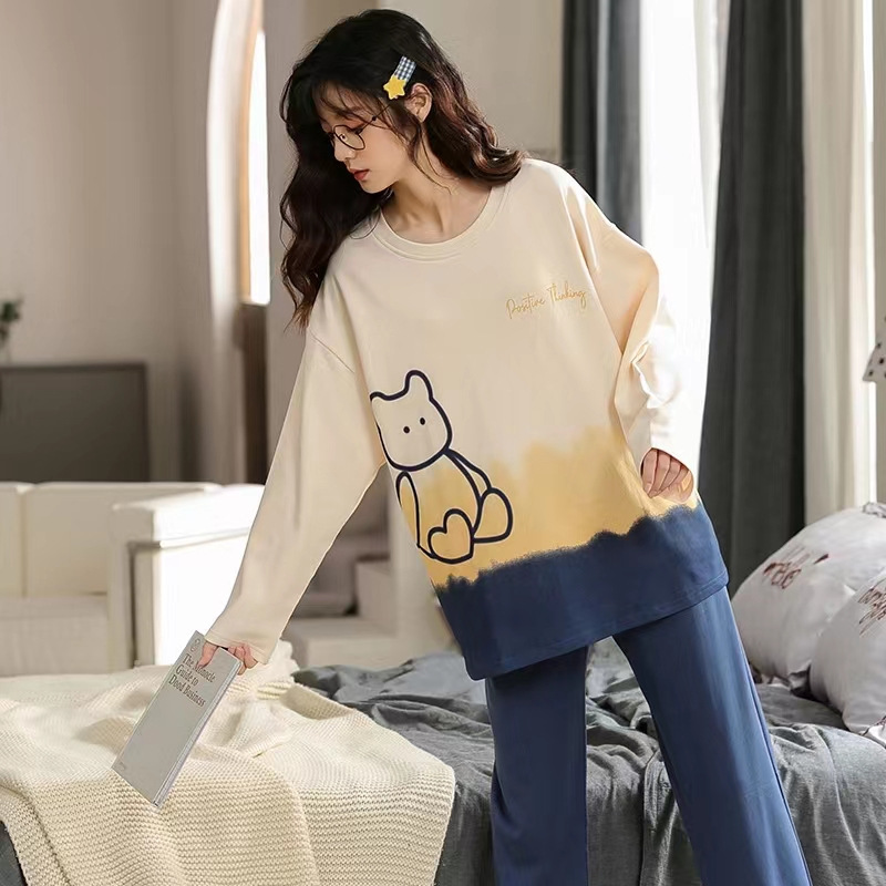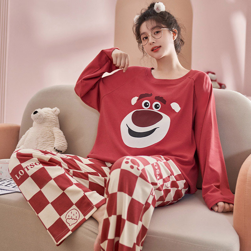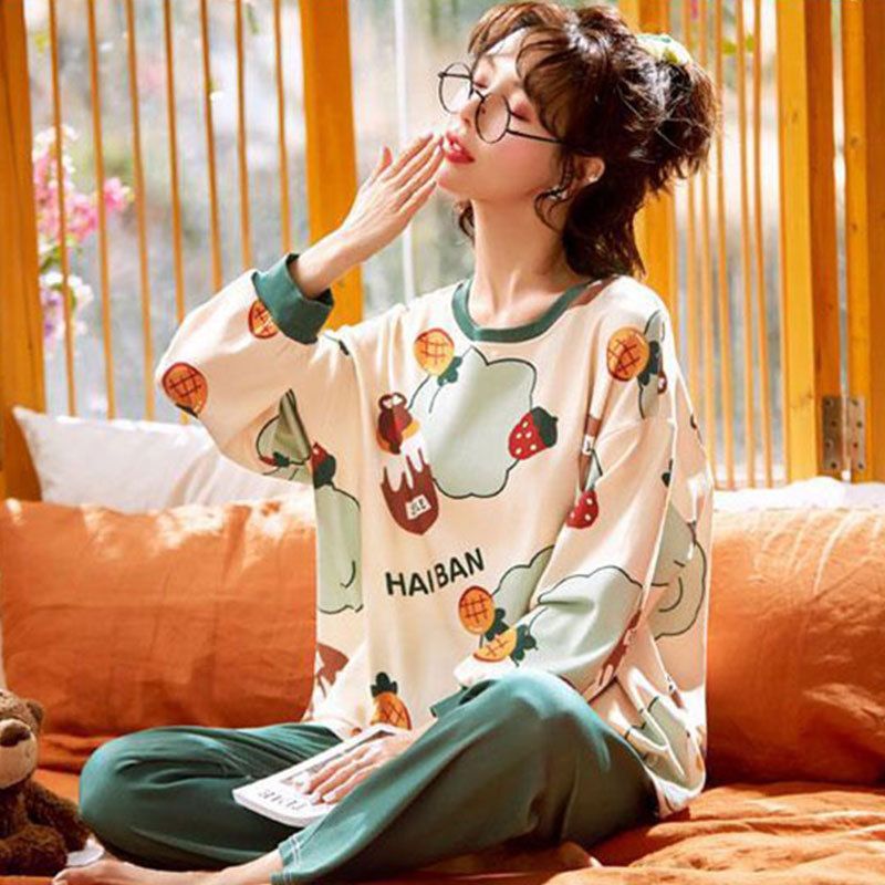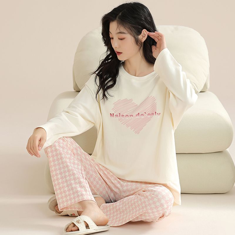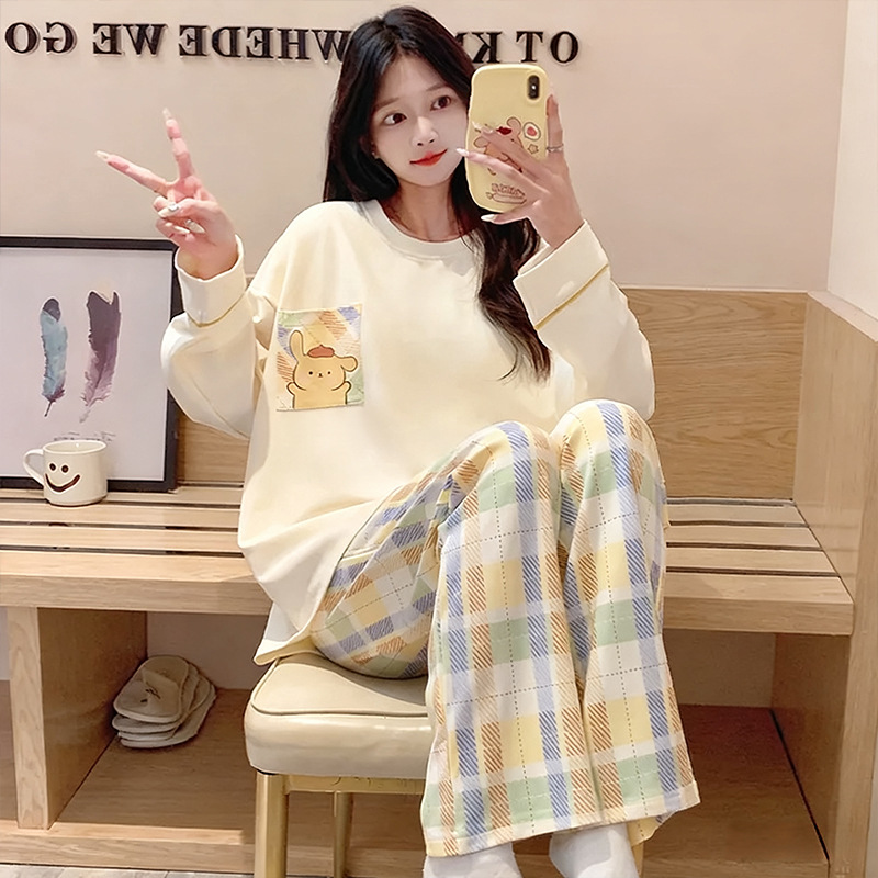 도매 가을 겨울 고품질 면 느낌 잠옷 여성용 라운드넥 귀여운 심플 스타일 긴팔 긴바지 홈웨어 세트