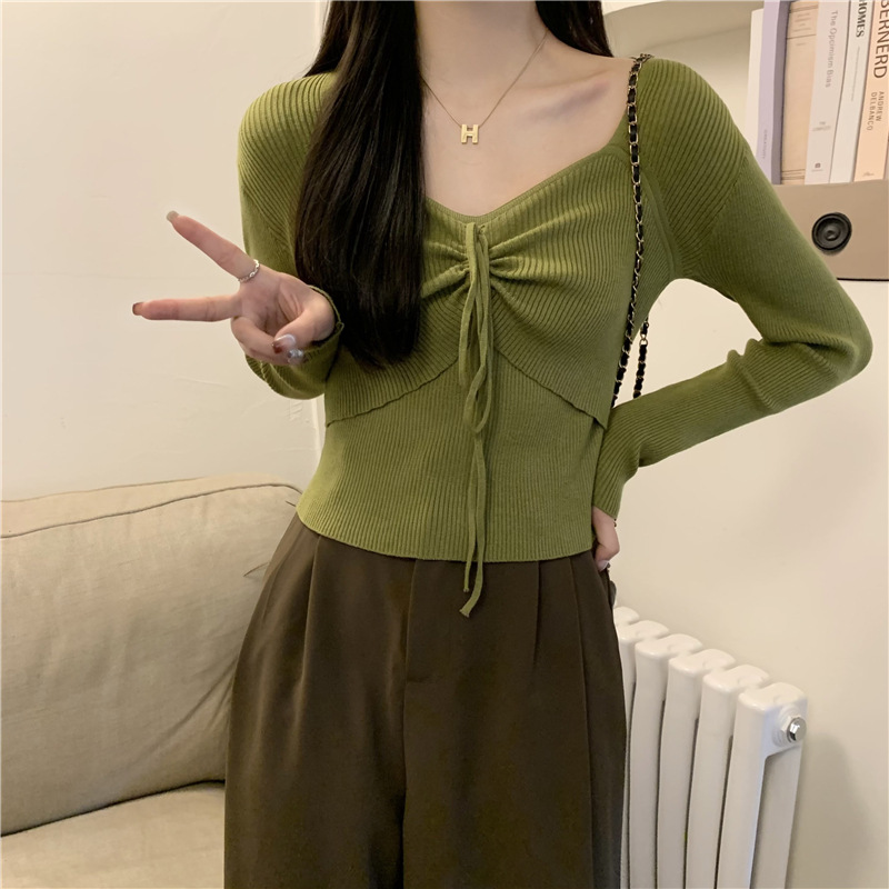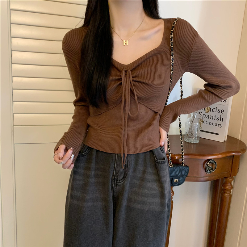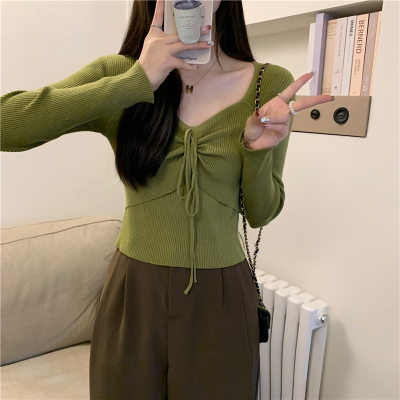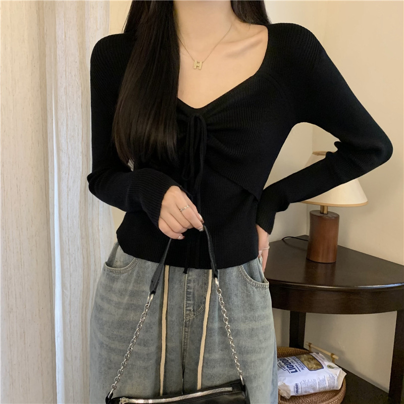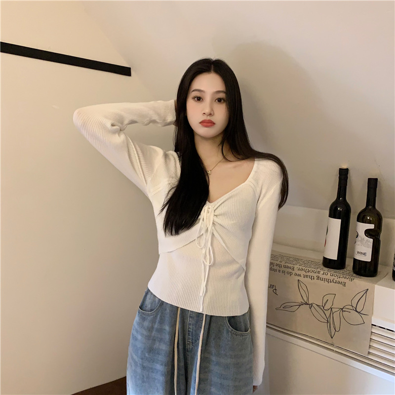 2025 봄과 가을 한국 스타일 기질 가짜 투피스 드로우 레이스 업 긴팔 니트 베이스 셔츠 내부 티셔츠 여성용 탑