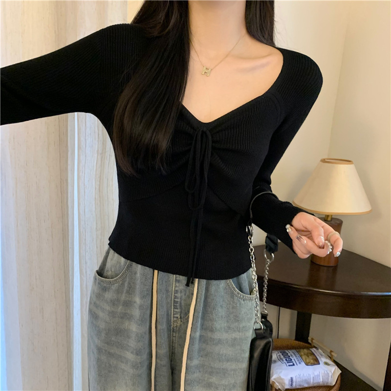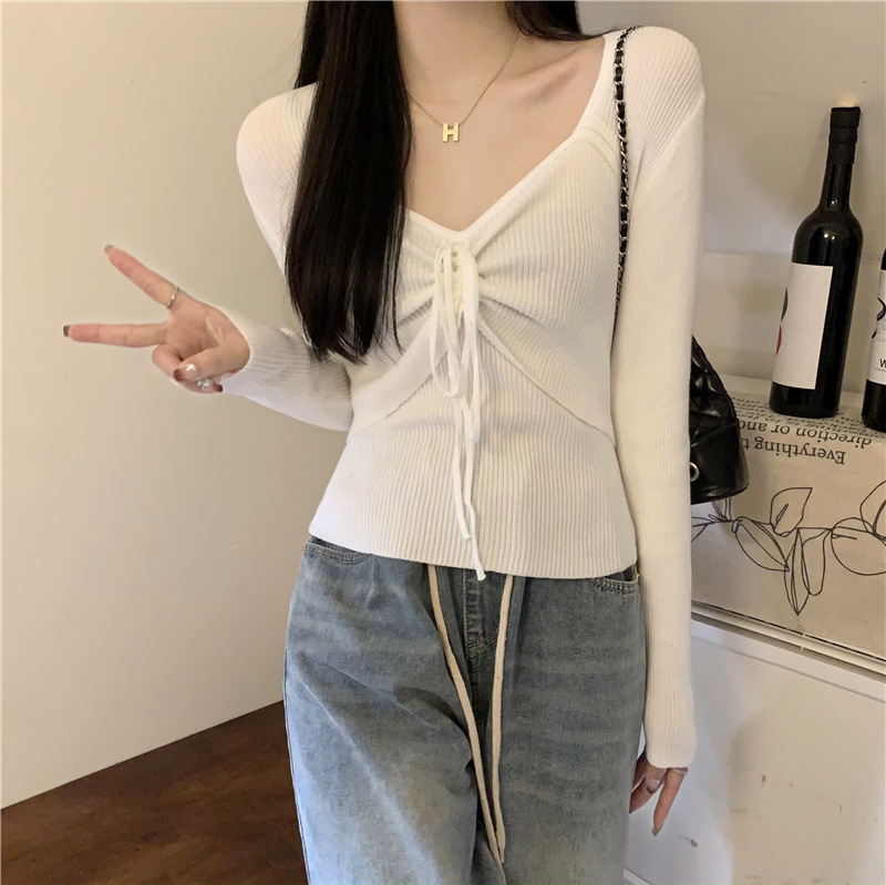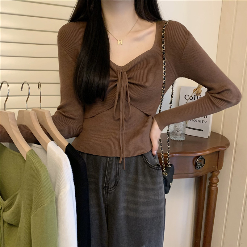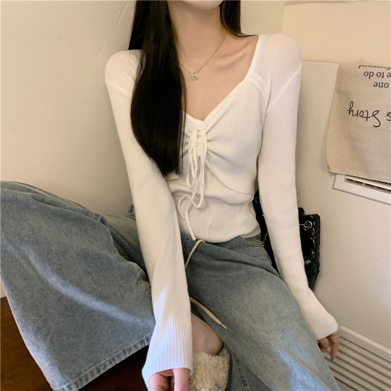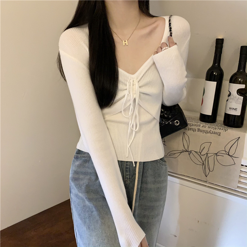 2025 봄과 가을 한국 스타일 기질 가짜 투피스 드로우 레이스 업 긴팔 니트 베이스 셔츠 내부 티셔츠 여성용 탑스토어 가기