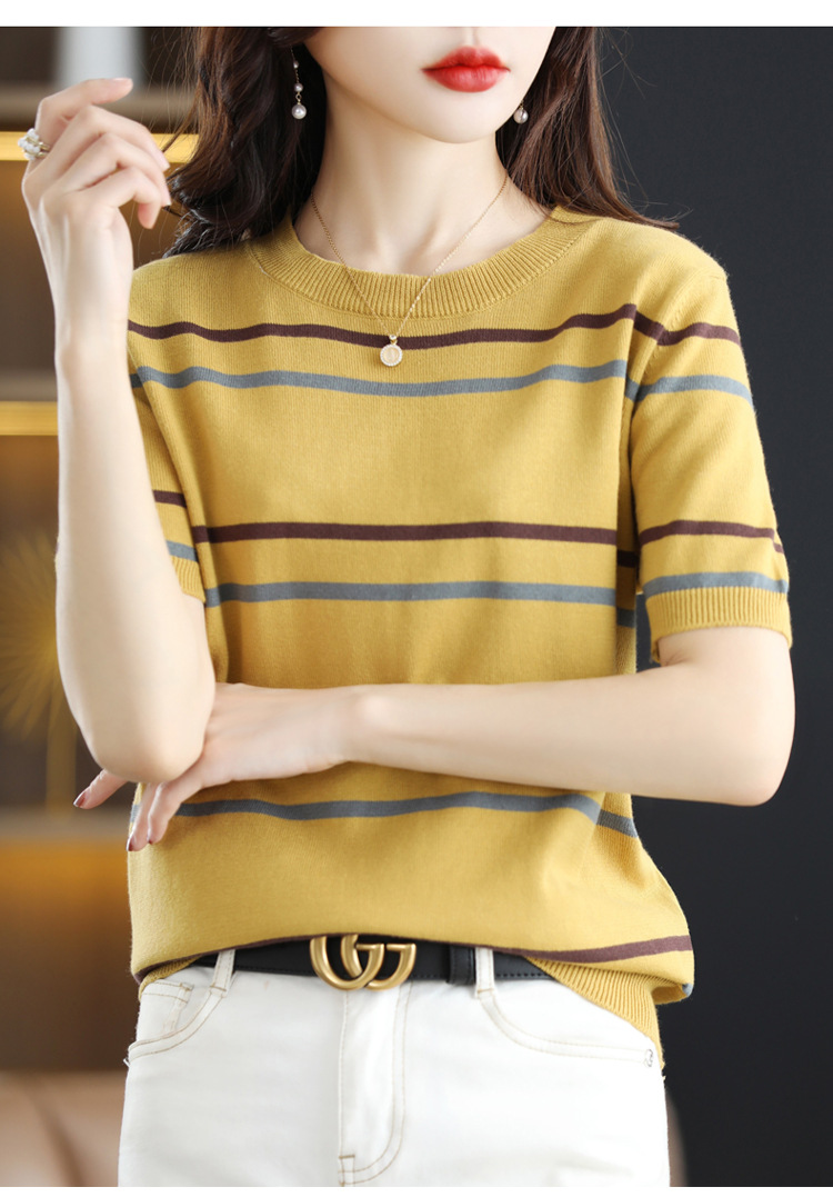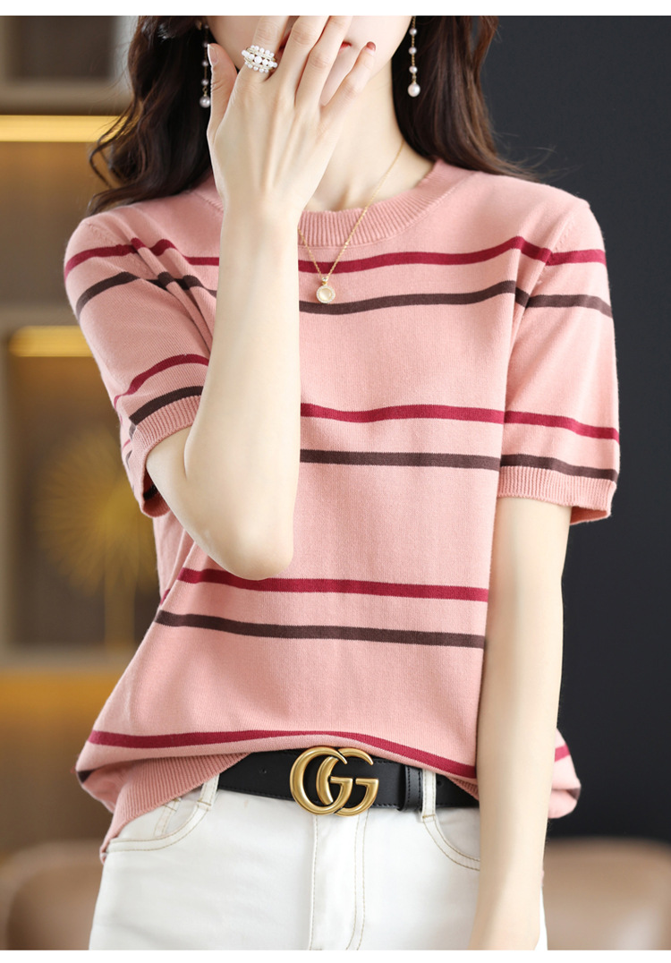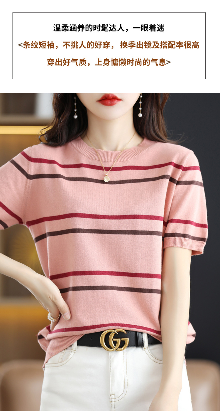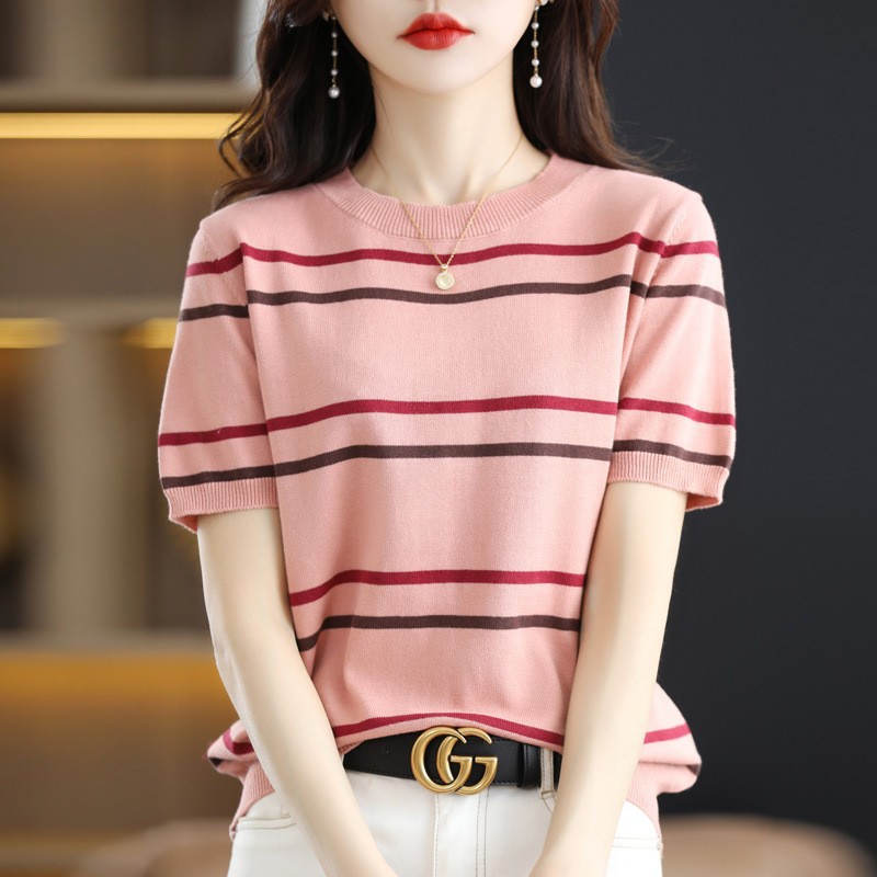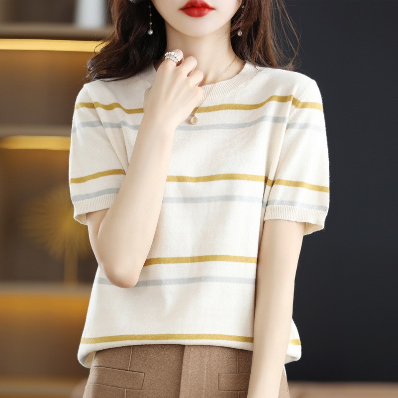 스트라이프 니트 반팔 티셔츠 여성 여름 2022 새로운 디자인 센스 틈새 아이스 실크 모든 매치 bm 탑 인 트렌디스토어 가기