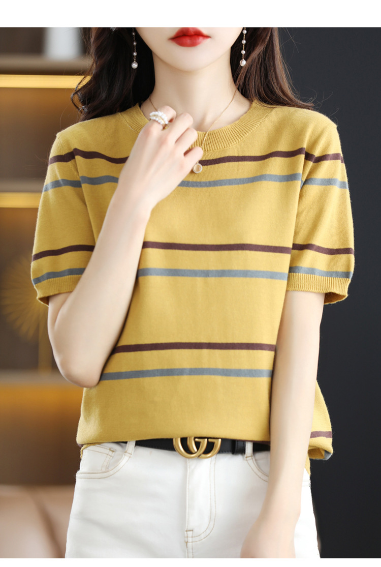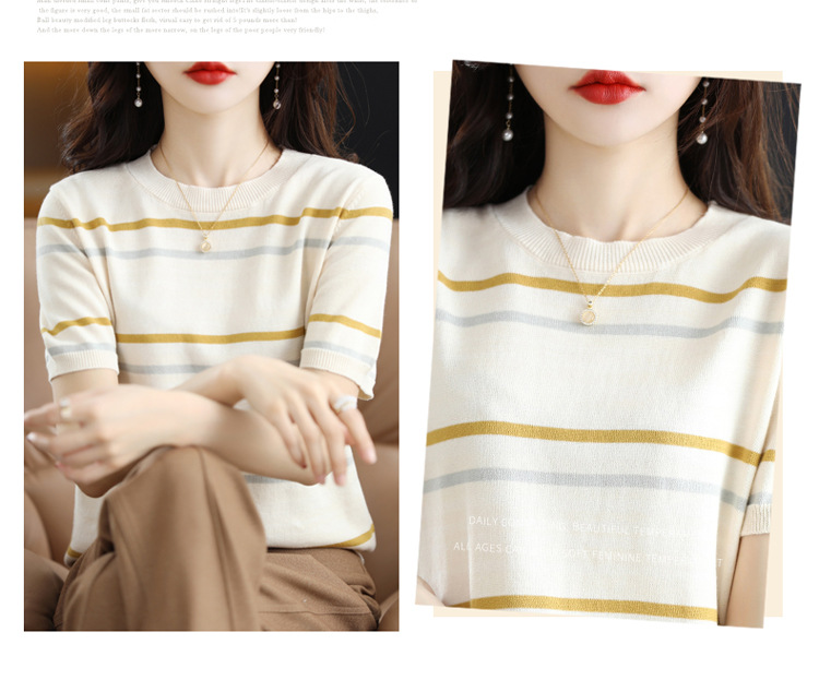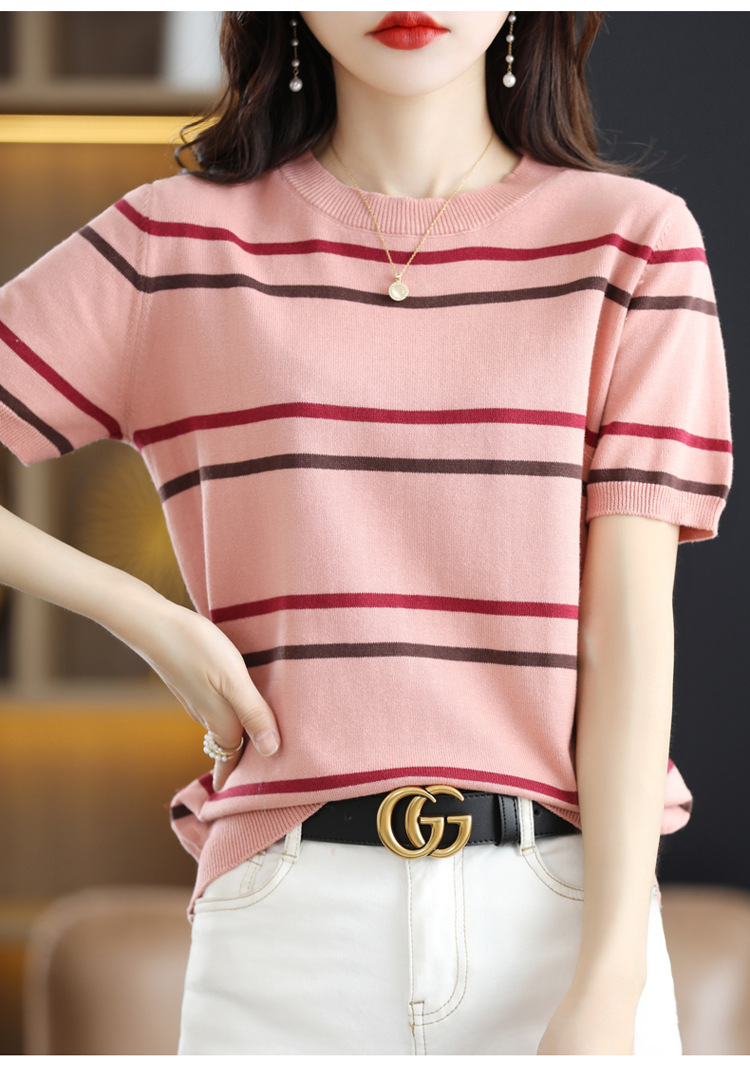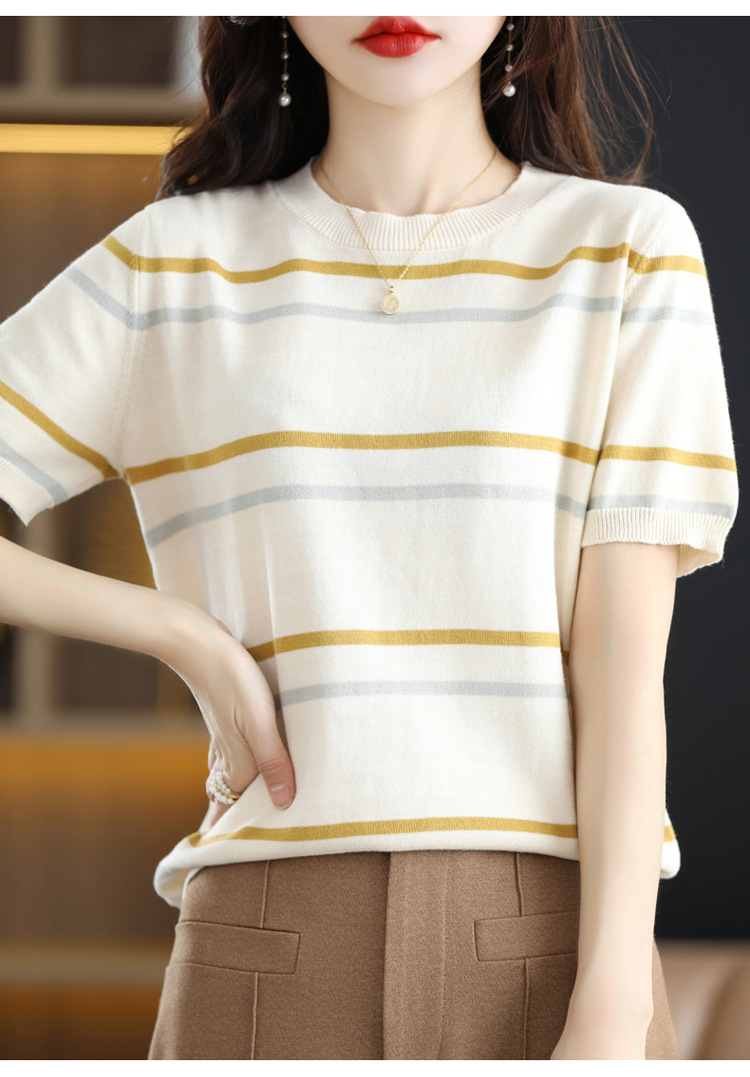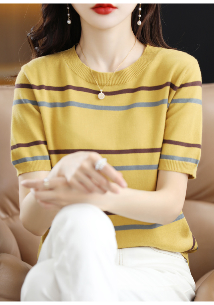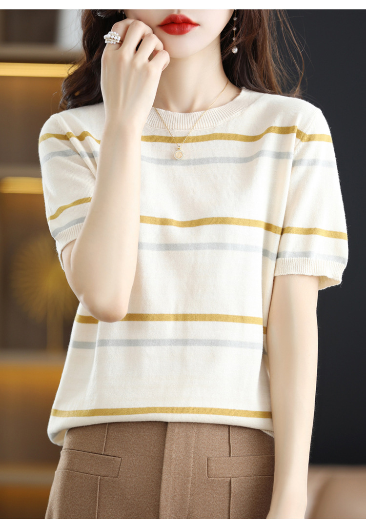 스트라이프 니트 반팔 티셔츠 여성 여름 2022 새로운 디자인 센스 틈새 아이스 실크 모든 매치 bm 탑 인 트렌디스토어 가기