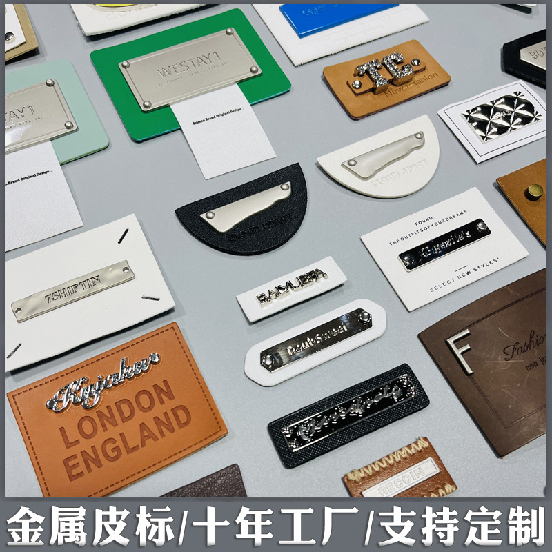 금속 배합 가죽 표준 10 년 공장 전기 도금 합금 가죽 브랜드 의류 장식 표준 삼각형 배합 공정 가죽 스탬프스토어 가기