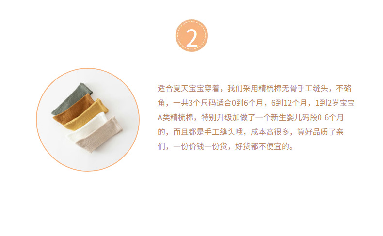 适合夏天宝宝穿着,我们采用精梳棉无骨手工缝头,不硌角,一共3个尺码适合0到6个月,6到12个月,1到2岁宝宝