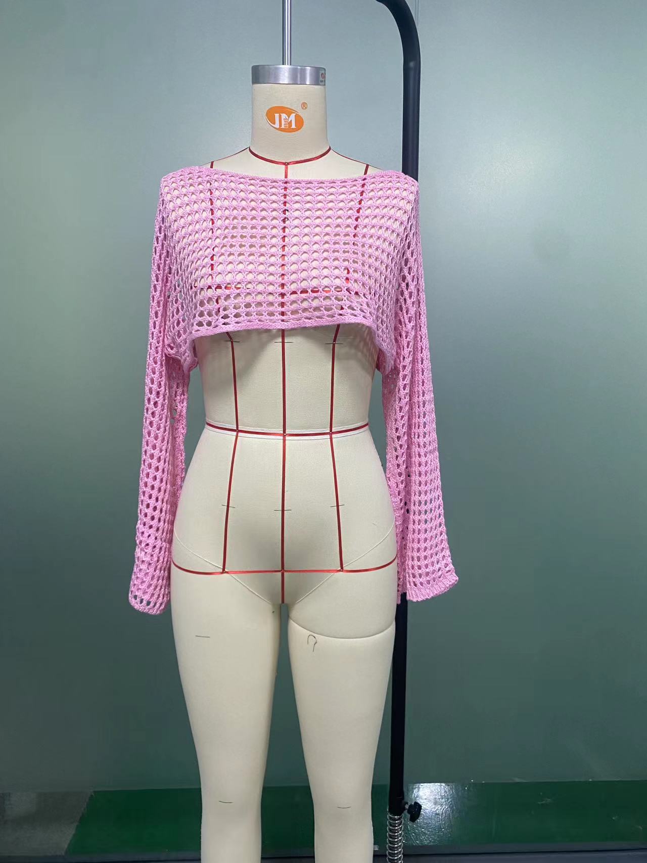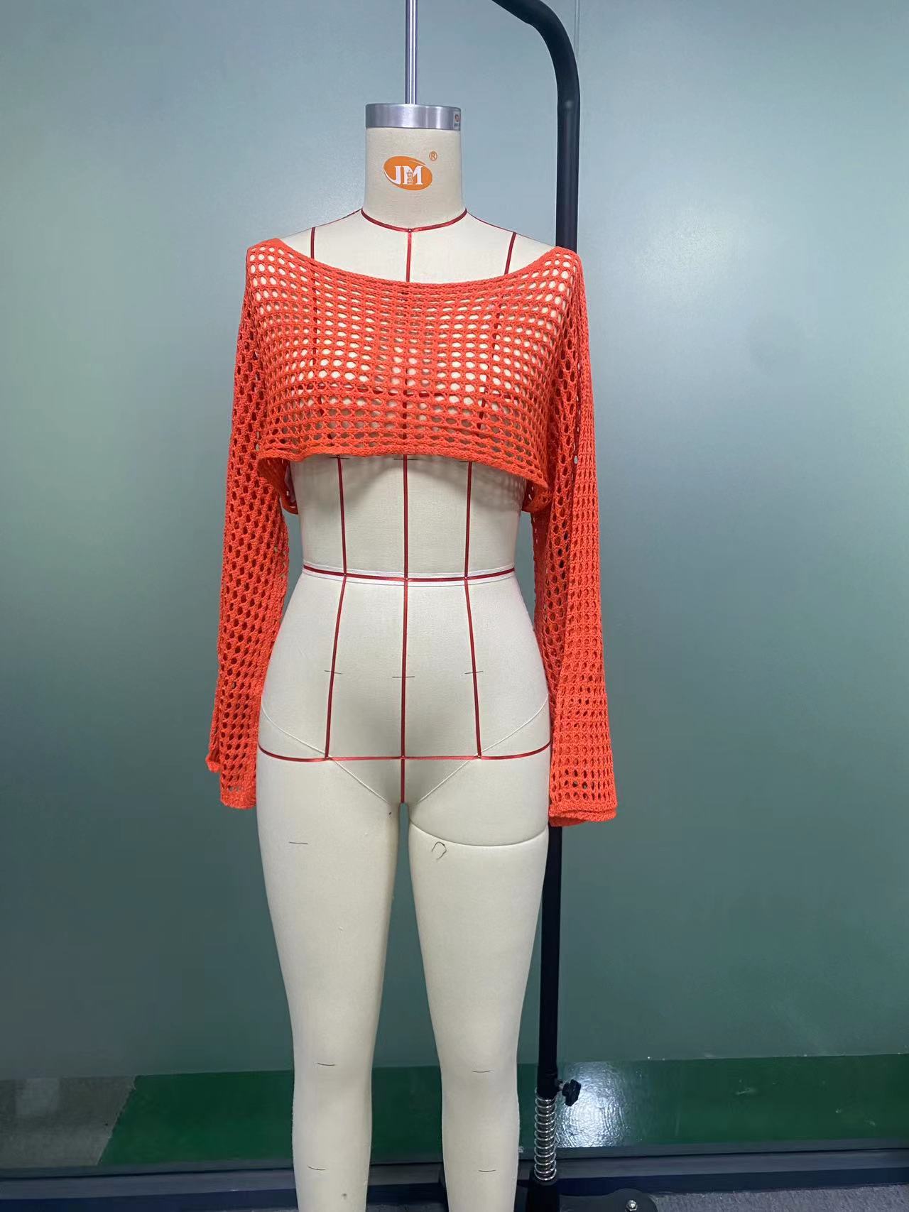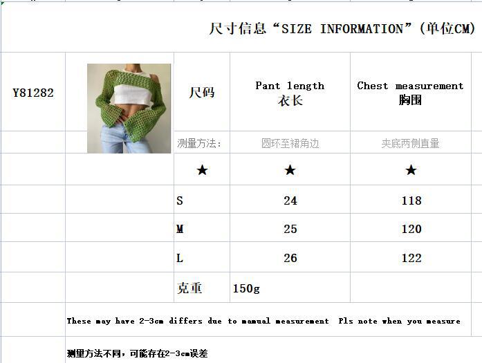 2024跨境秋季新款女装手勾毛衣女休闲超短款喇叭袖性感网格罩衫潮