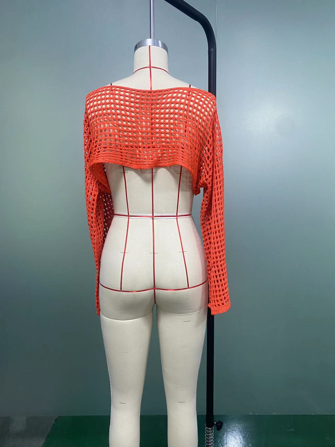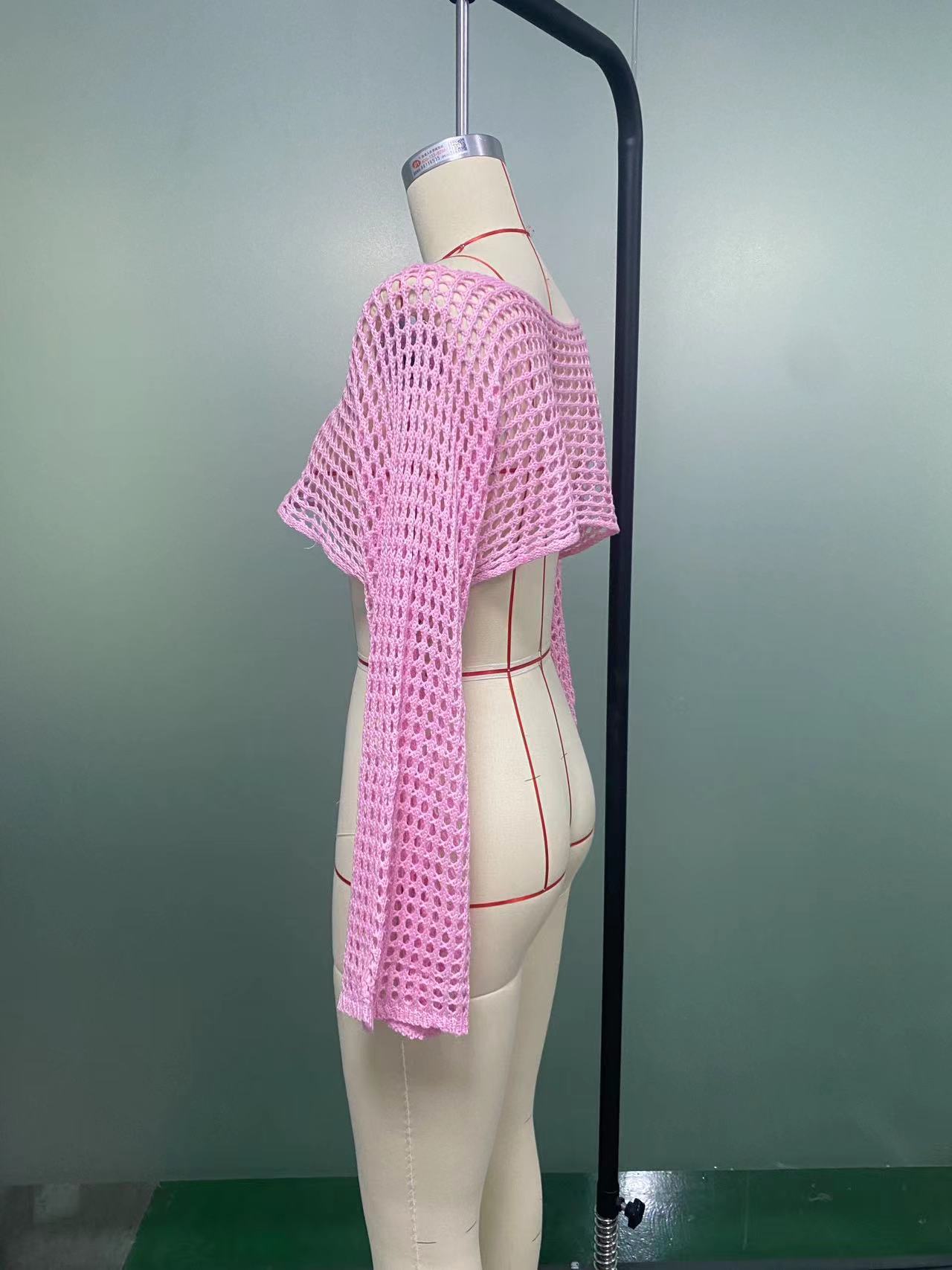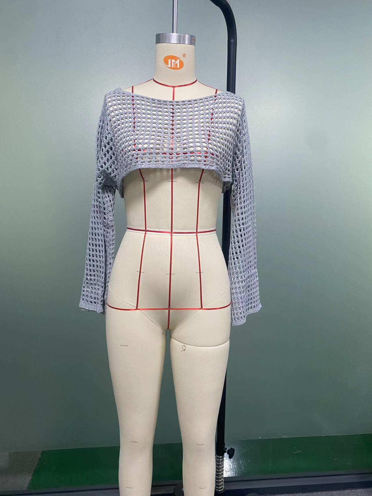 2024跨境秋季新款女装手勾毛衣女休闲超短款喇叭袖性感网格罩衫潮